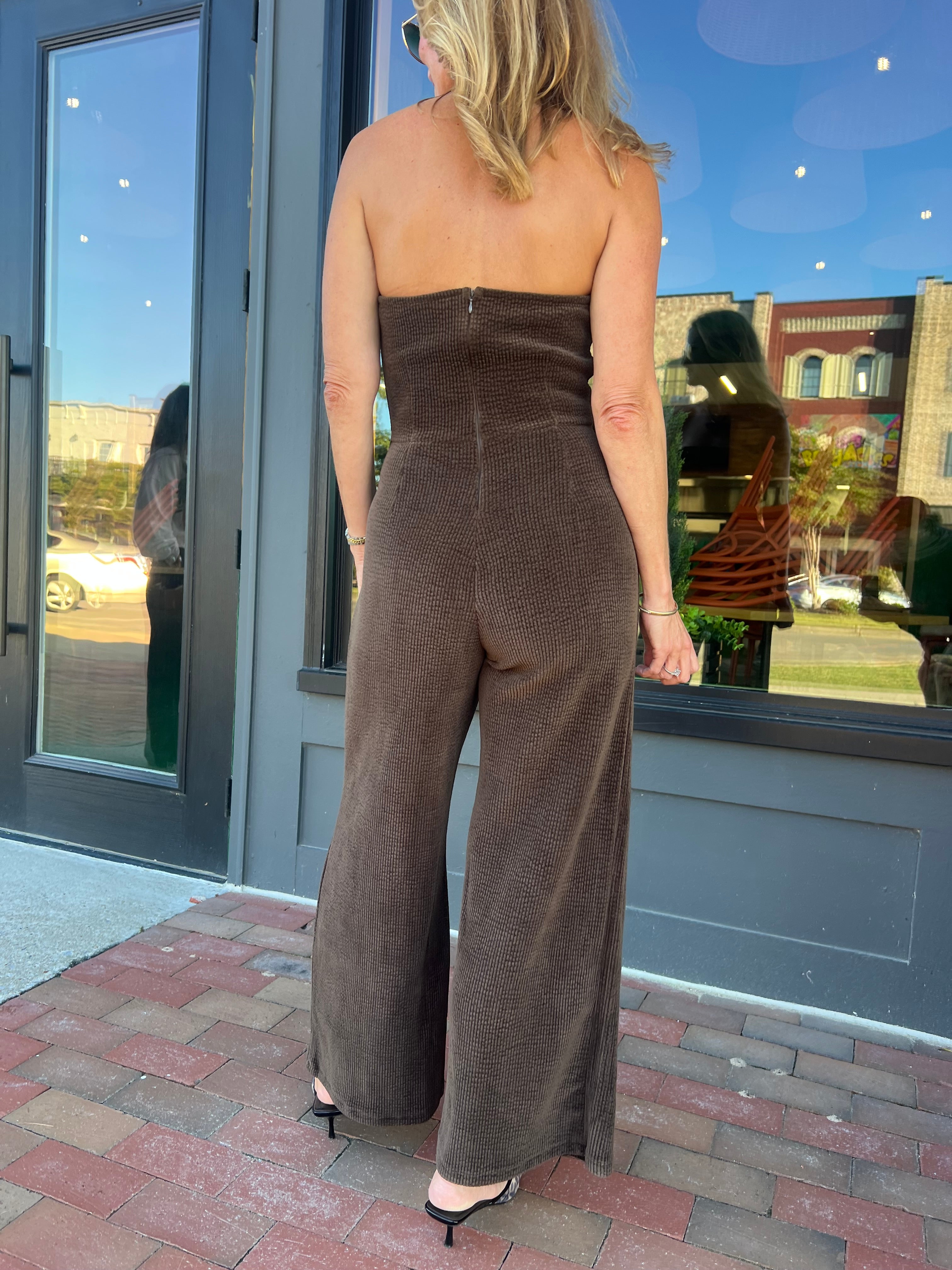 The perfect blend of vintage flair and modern polish — this Sage the Label corduroy jumpsuit is a fall standout. The rich chocolate hue and soft ribbed texture give it a cozy yet elevated feel, while the strapless neckline and tailored seams flatter every curve. Front buttons and subtle pocket detailing add a touch of structure, making it both chic and effortless to wear.