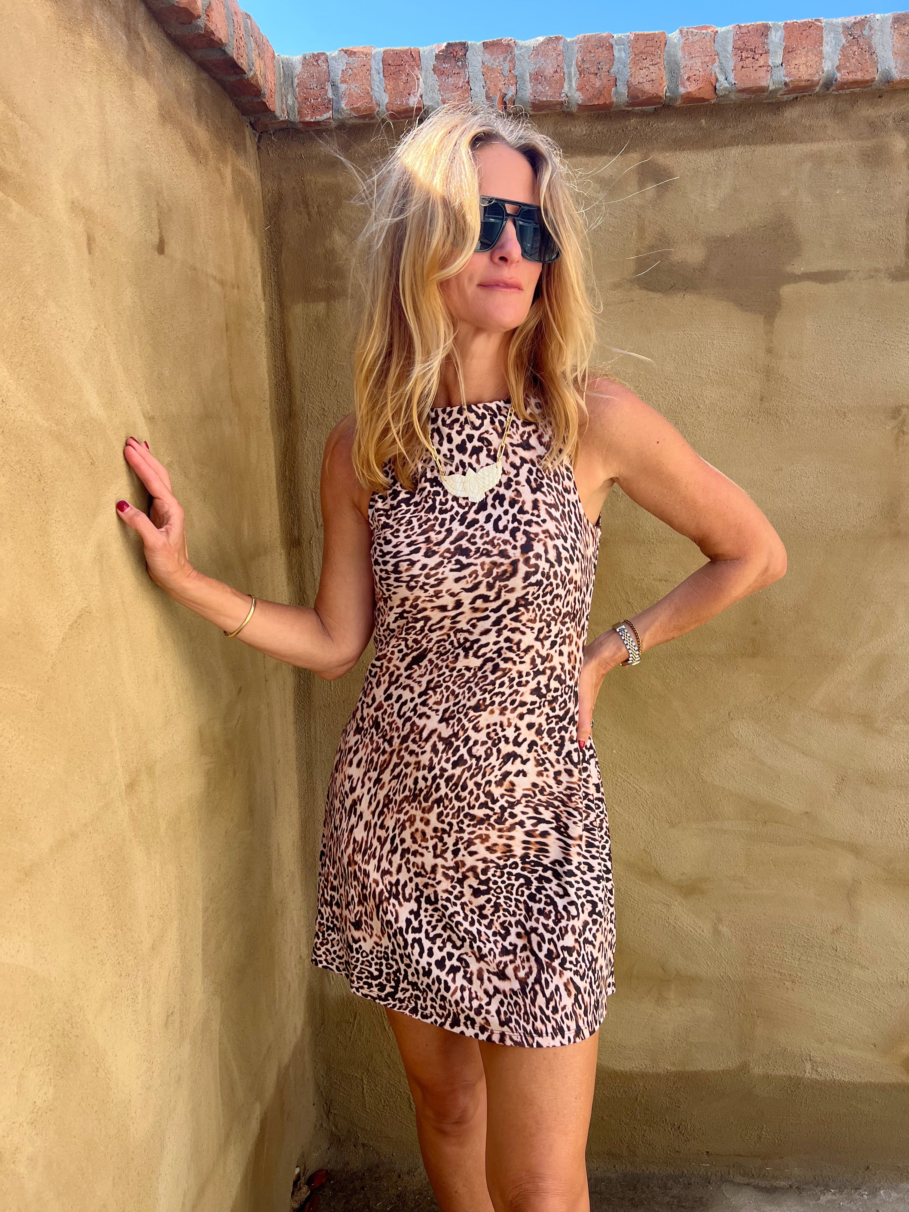 Turn up the confidence in this bold, yet feminine mini dress. The soft, lightweight fabric moves effortlessly while the neutral leopard print adds just the right amount of edge. Designed with a flattering high neckline and a fitted silhouette that’s both sleek and comfortable — it’s a head-turner for every season.