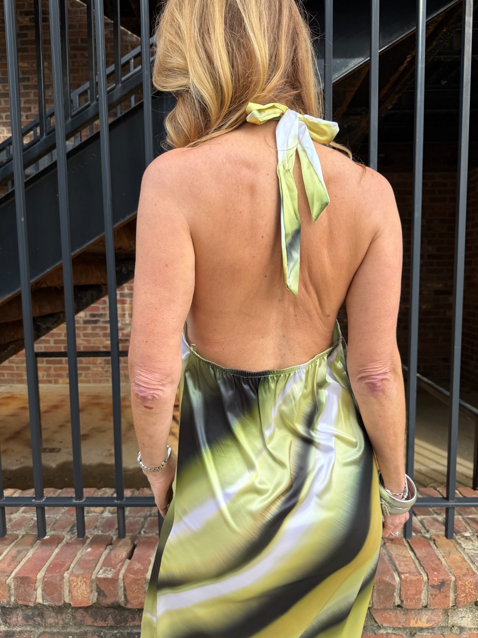 This dress is all about movement and a sleek silhouette. Designed with a draped neckline and a fluid fit, it skims the body without feeling restrictive. The abstract print adds depth and interest while still feeling refined and wearable.