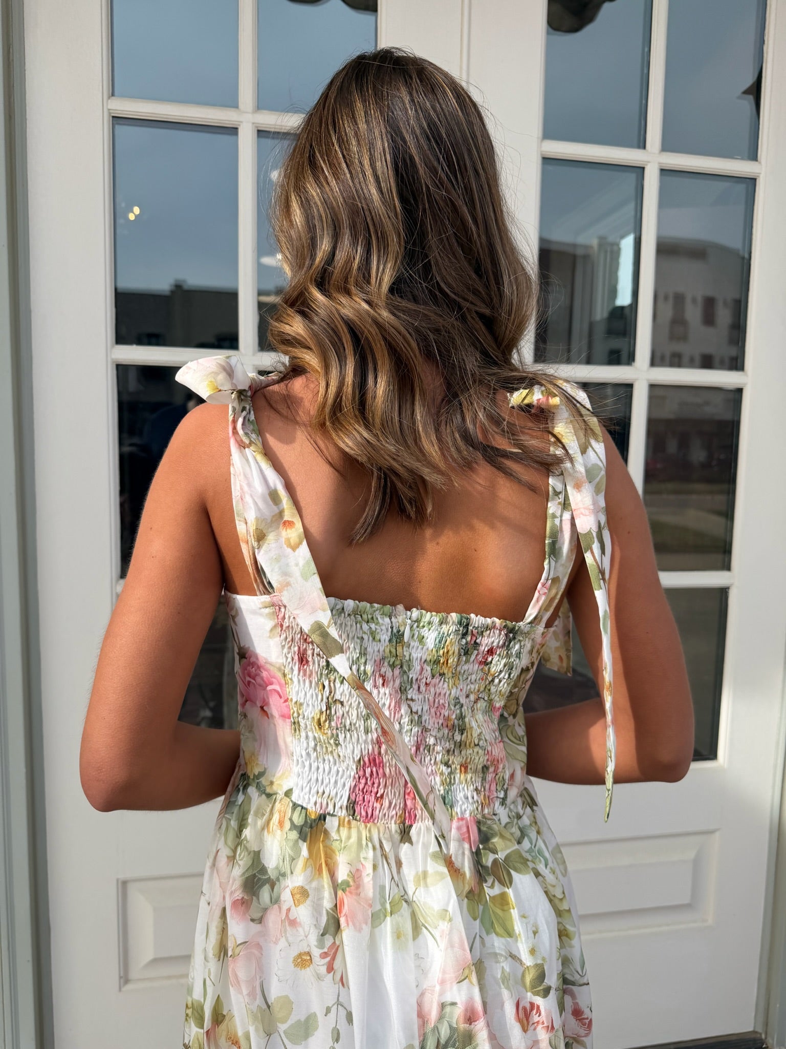 This midi dress features a flowy silhouette with a flattering fitted bodice and a full skirt that gives it that effortless drape. The tie straps add a subtle detail while allowing for an adjustable fit. The floral print keeps it light and feminine without feeling overdone.