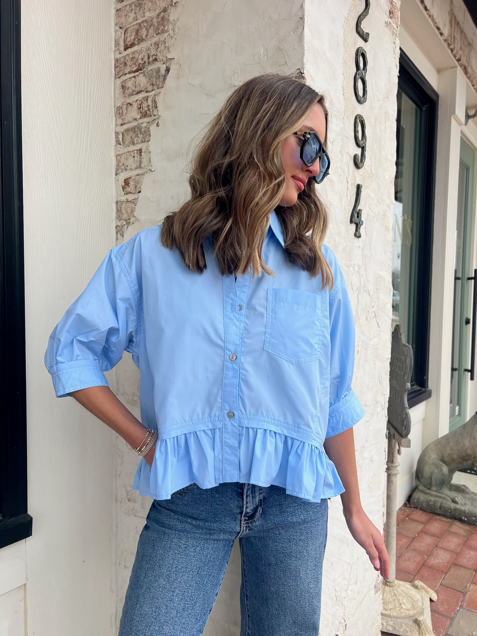 Soft structure with an easy, flattering shape. This button-front top features a classic collar and a peplum hem that creates a polished but comfortable silhouette. It feels put together without being stiff, making it perfect for everyday wear. Style it with denim, tailored pants, or a skirt for work, brunch, or casual plans. Available in blue and yellow.