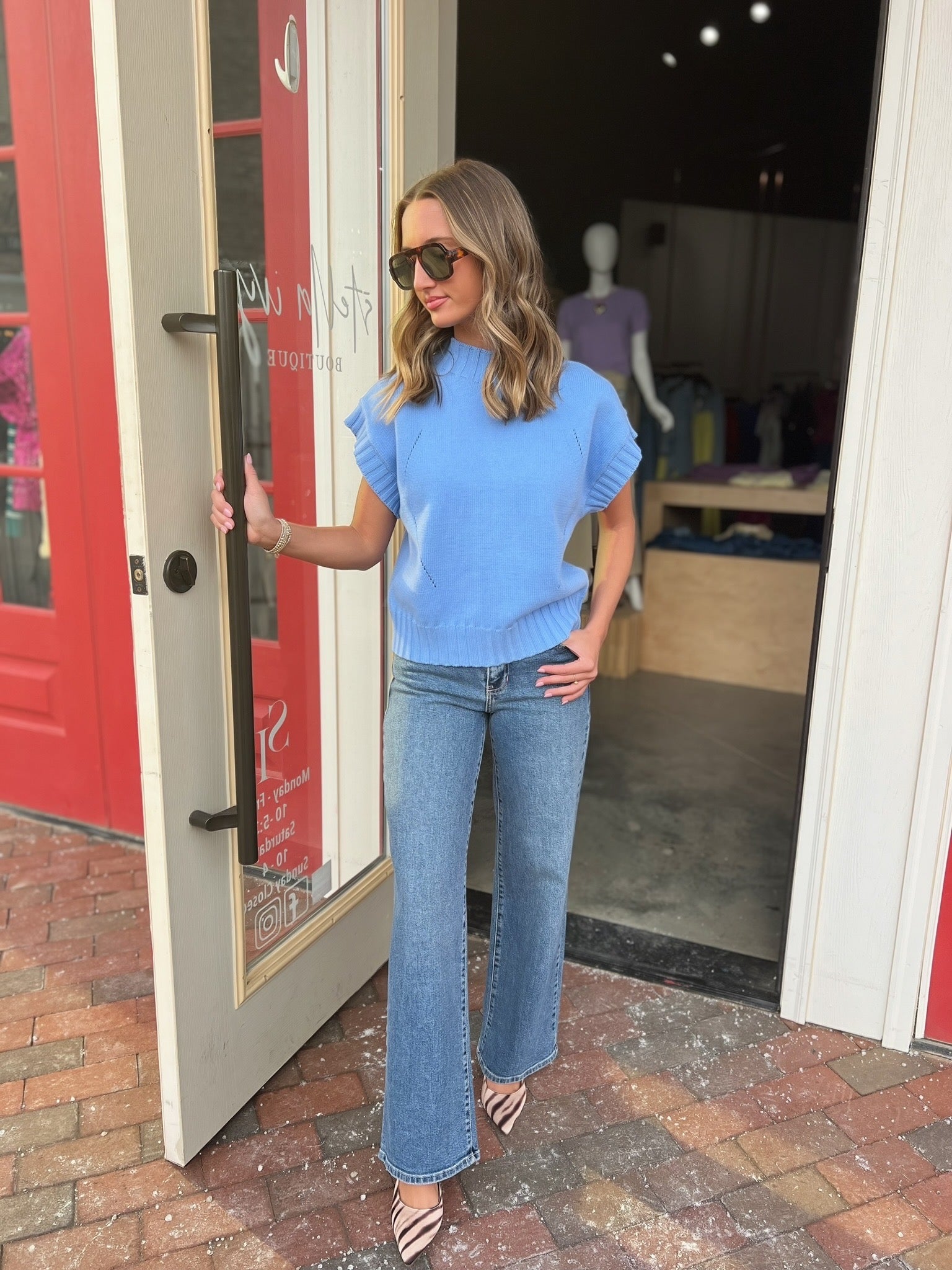 This soft blue short sleeve sweater features a lightweight knit with subtle detailing that gives it a refined, everyday feel. Designed with a relaxed fit, ribbed hem, and gently structured sleeves, it offers just enough shape while staying comfortable and easy to wear. The smooth texture makes it perfect on its own now and ideal for layering as seasons shift.