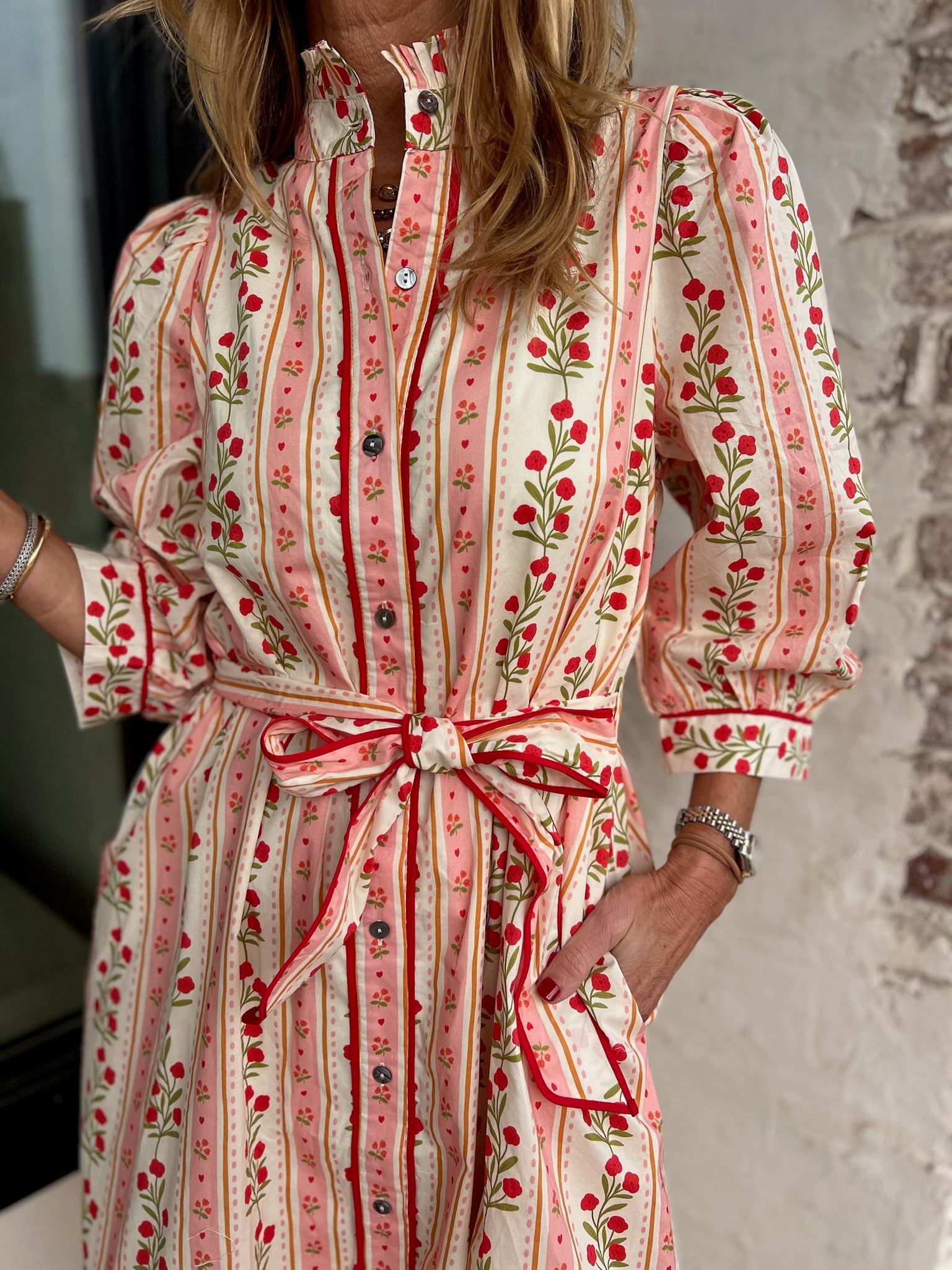 Soft, feminine, and easy to wear. The Josephine Midi Dress features a delicate floral stripe pattern with a button-front design and a gentle waist tie that creates a flattering, relaxed shape. It feels polished without feeling dressy and comfortable without feeling casual. We would wear this to brunch, church, showers, or daytime gatherings styled with simple sandals, then switch to a chunky block heel or nude pump for dinner plans.