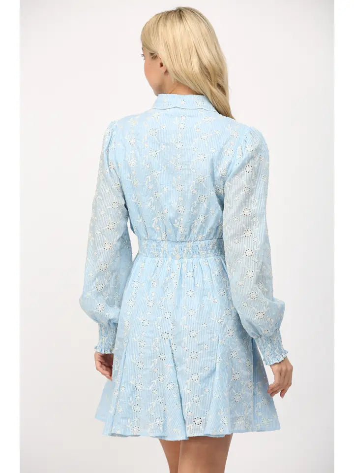 Designed with delicate eyelet throughout, a classic collar, and a full button-front detail, it feels polished and reverent without being overdone. The long puff sleeves add gentle structure, and the adjustable waist tie defines your shape in the most flattering way. The flared skirt gives it that graceful movement that feels just right walking into church on Easter Sunday.
