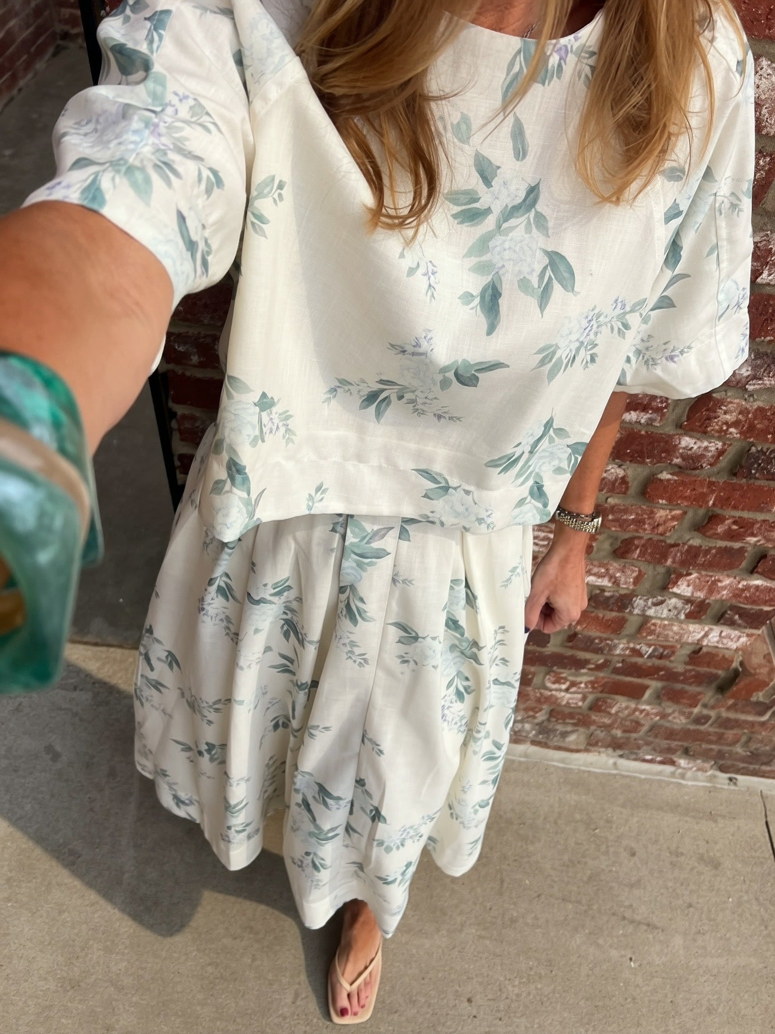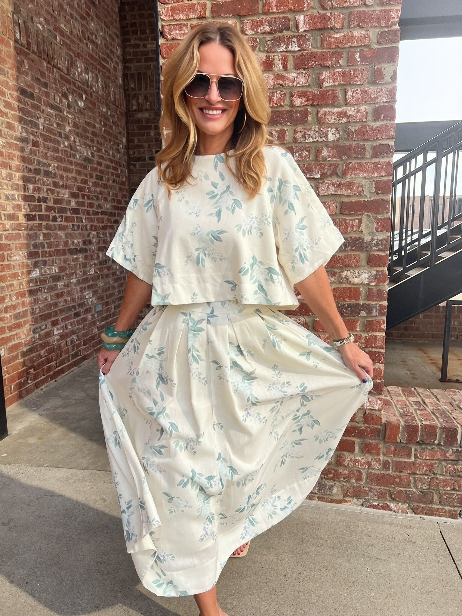 The Magnolia Mist Floral Set features a cropped top with relaxed sleeves paired with a coordinating skirt in a delicate botanical print. The light cream base and muted green florals feel fresh and refined. The silhouette is comfortable yet elevated, giving you a complete look without overthinking it.