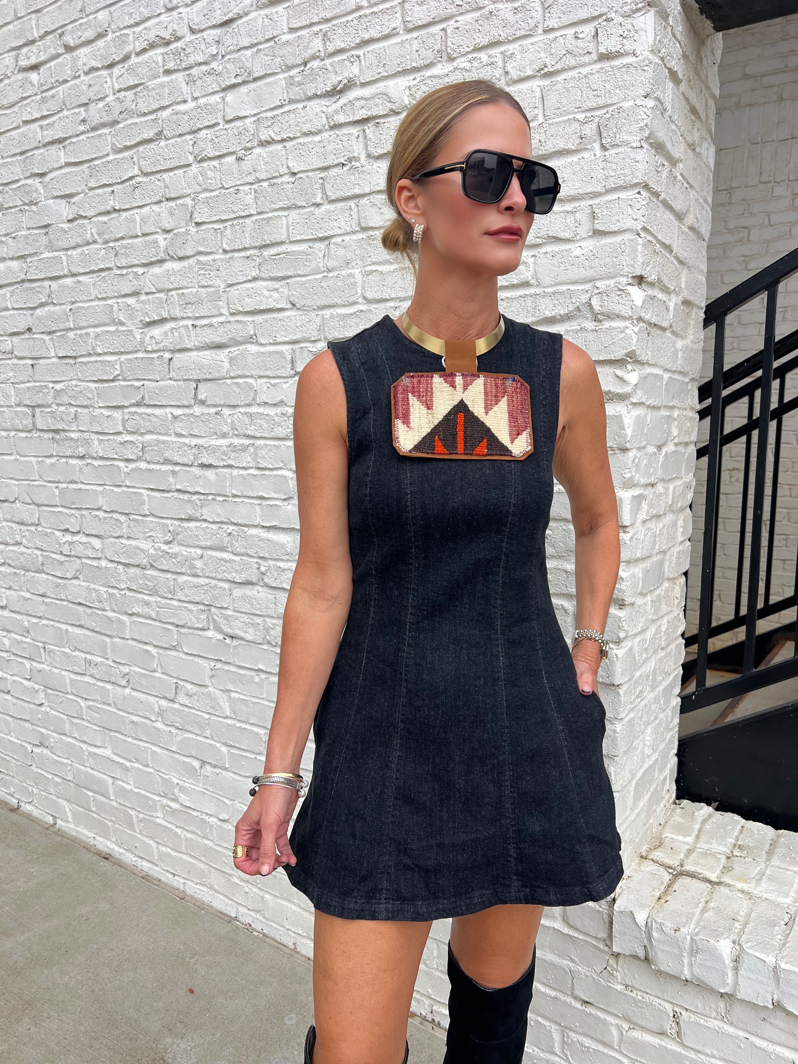 The dark denim gives this dress all the quiet confidence you want for fall, and the clean A-line cut keeps it effortless from every angle. The structured neckline detail adds a bold, elevated touch that instantly sets the whole look apart. The fit is smooth through the bodice with a flattering flare at the hem, making it easy to style with tall boots or a sleek mule.