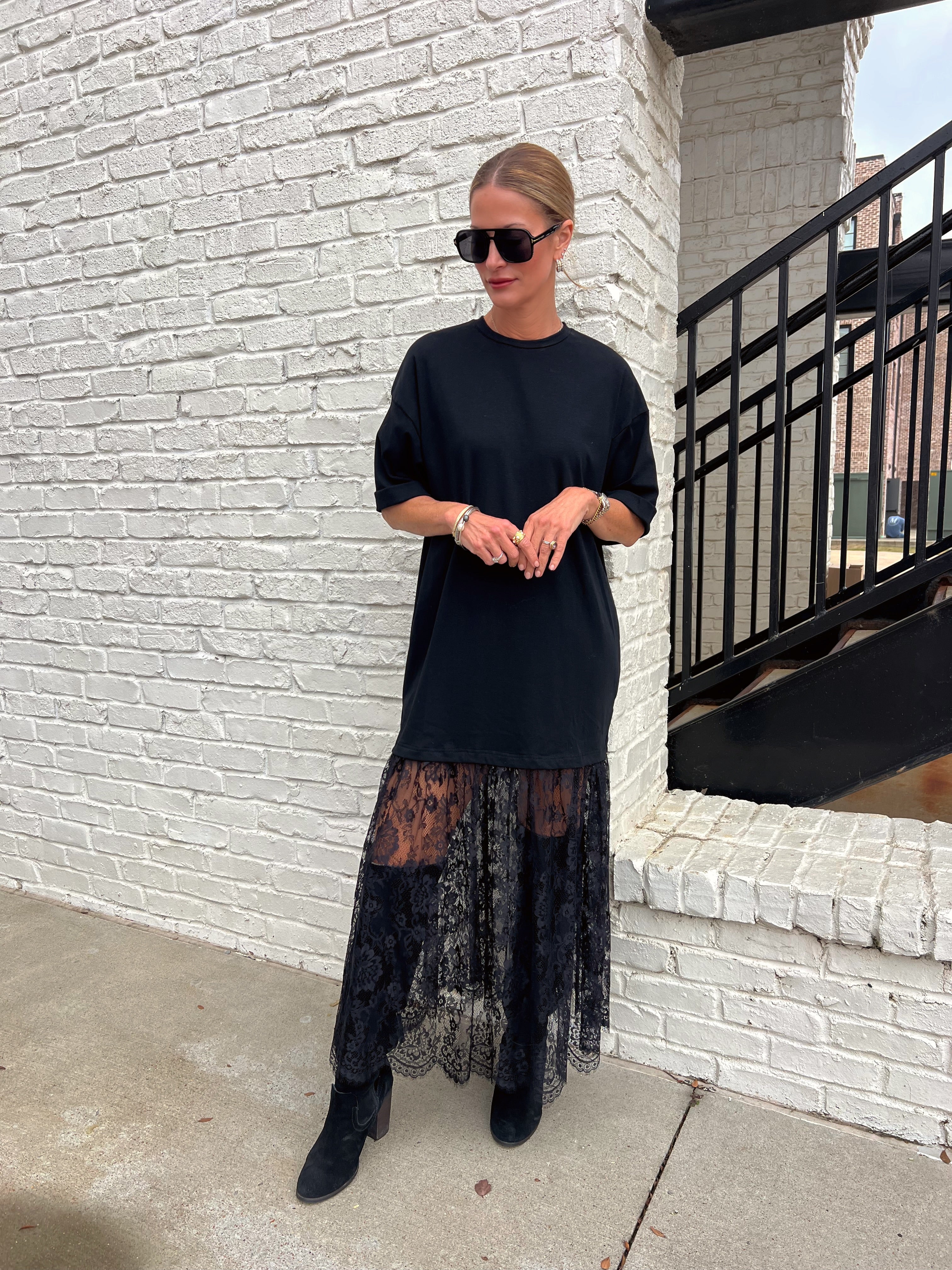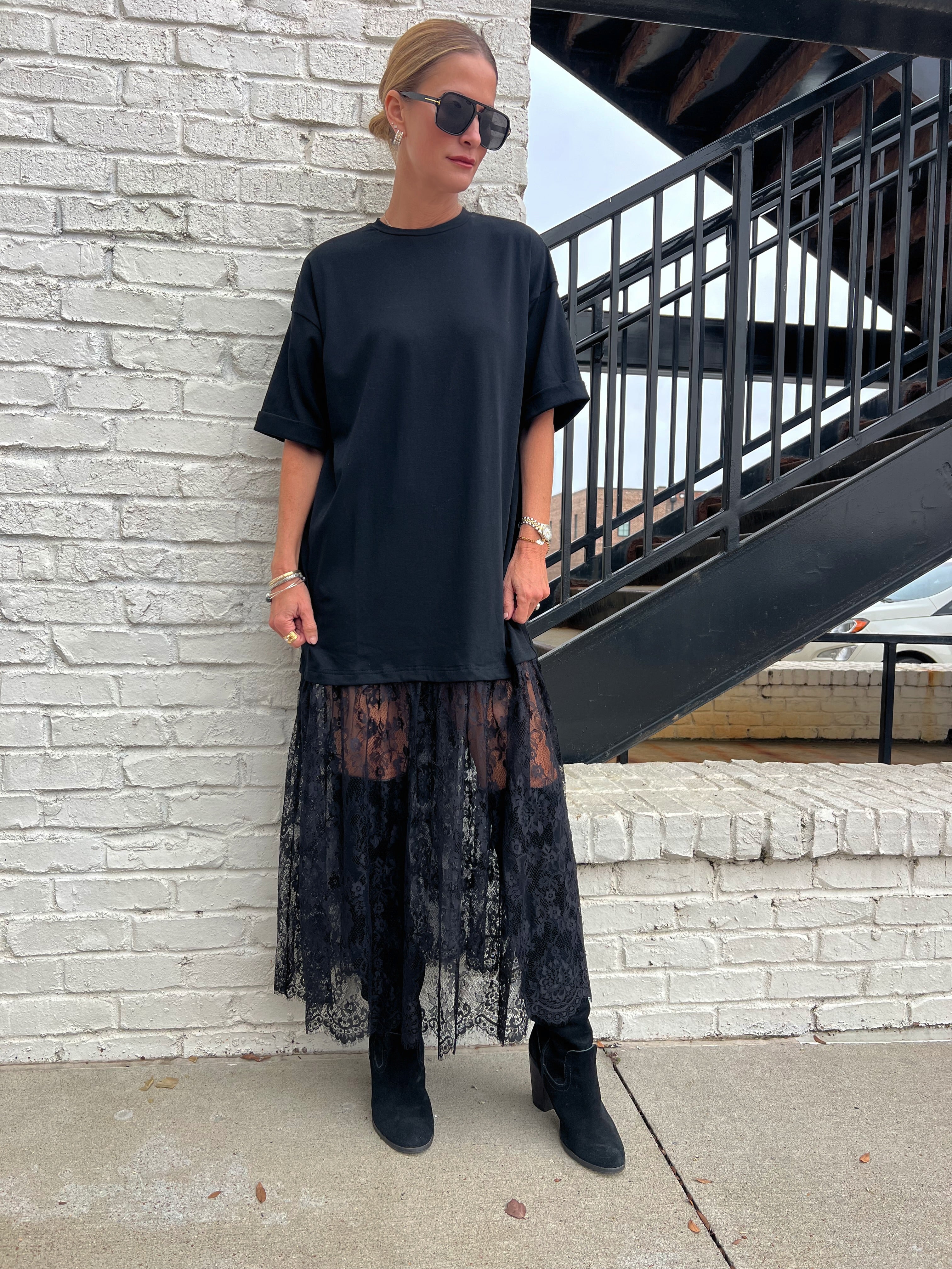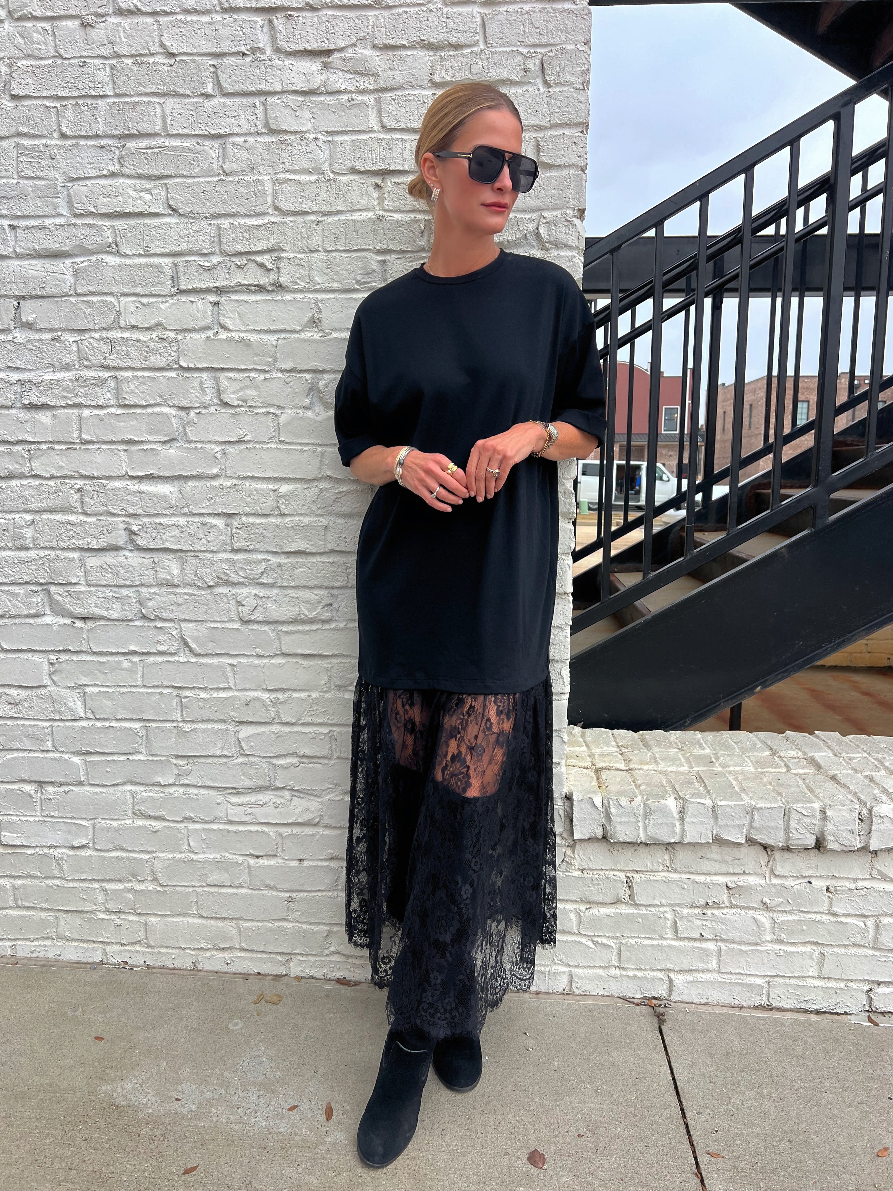For the days you want drama without trying, this one brings it. An oversized black tee drapes effortlessly on top, flowing into a sheer black lace skirt that adds movement, texture, and just the right amount of edge. The mix of casual and dressy makes it one of those “throw it on and feel cool” outfits. We would wear this to dinner in the city, a holiday party with boots, or any night you want a little fashion moment without the fuss.