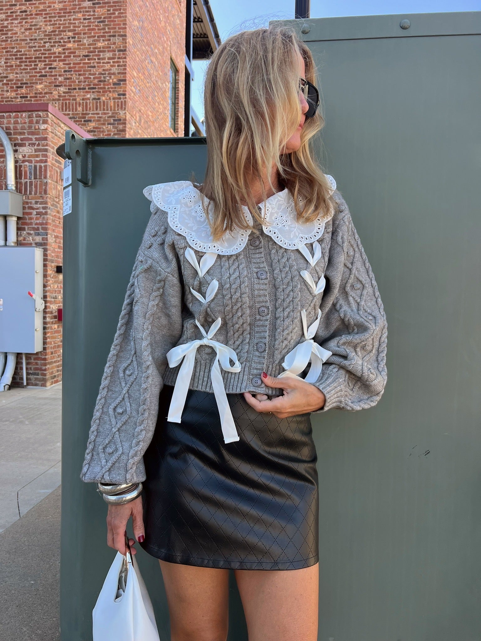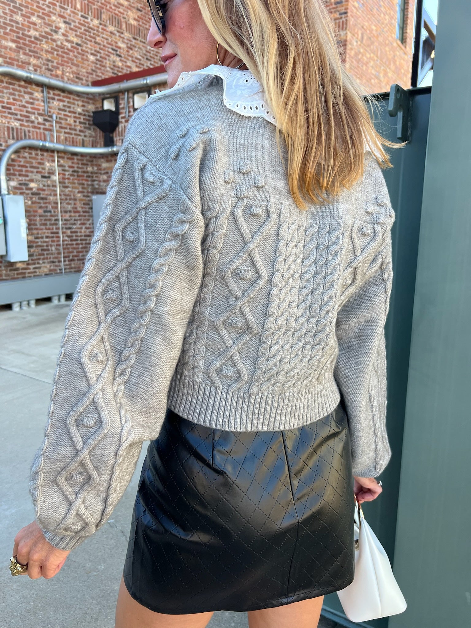 Sweet meets statement in the Peter Ribbon Cable Knit Sweater. Designed with a textured cable pattern, contrast satin ribbon ties, and an oversized embroidered collar, this piece brings a romantic twist to a fall classic. The soft heather gray hue and balloon sleeves make it as cozy as it is eye-catching.
