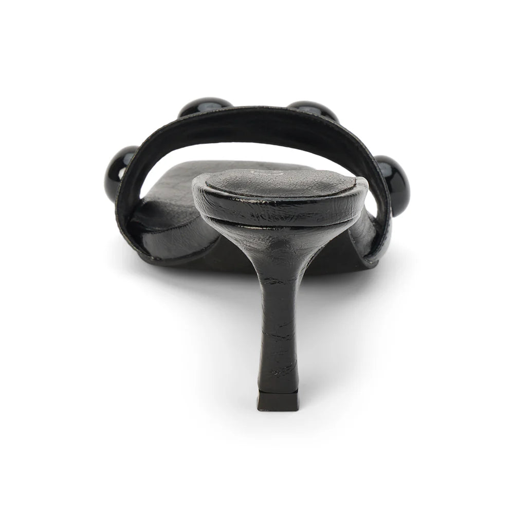 Black slip-on sandal with square toe, button embellishments, and tapered heel.