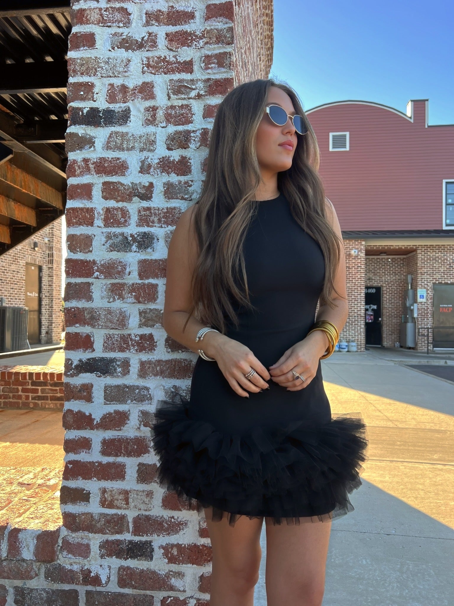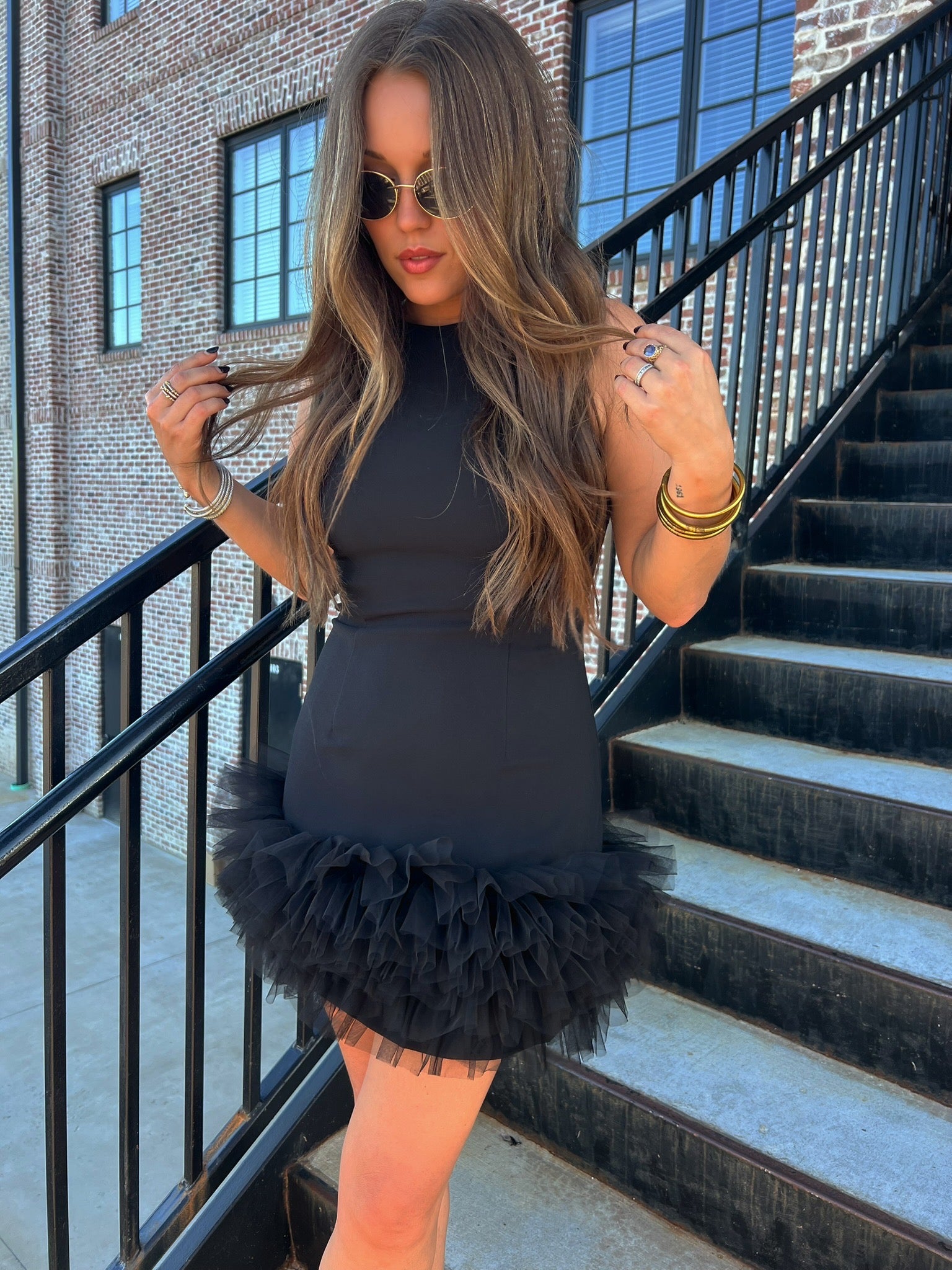 Elegant with a touch of drama—the Meet For Martini's Dress is made to steal the spotlight. Featuring a sleek, body-skimming fit and a playful layered tulle hem, this mini balances sophistication with fun. The high neckline and clean lines make it an instant classic with a flirty twist.