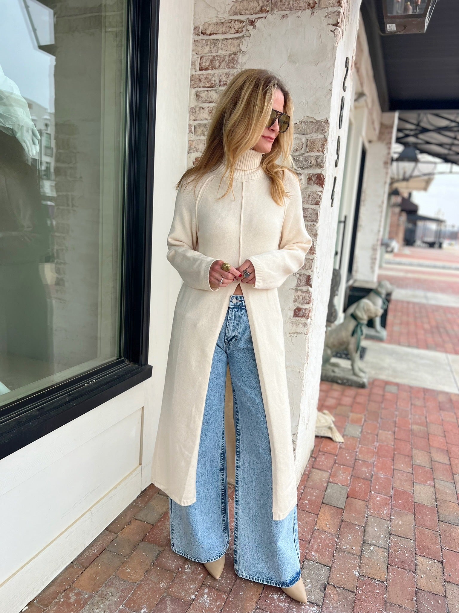 A modern take on the classic turtleneck that refuses to be ordinary. This cream-toned knit features a bold, high-set front split that creates a dramatic, elongated silhouette while offering effortless movement. With its relaxed fit and cozy high neck, it’s the perfect high-quality layering piece for a woman who values unique design and quiet confidence.