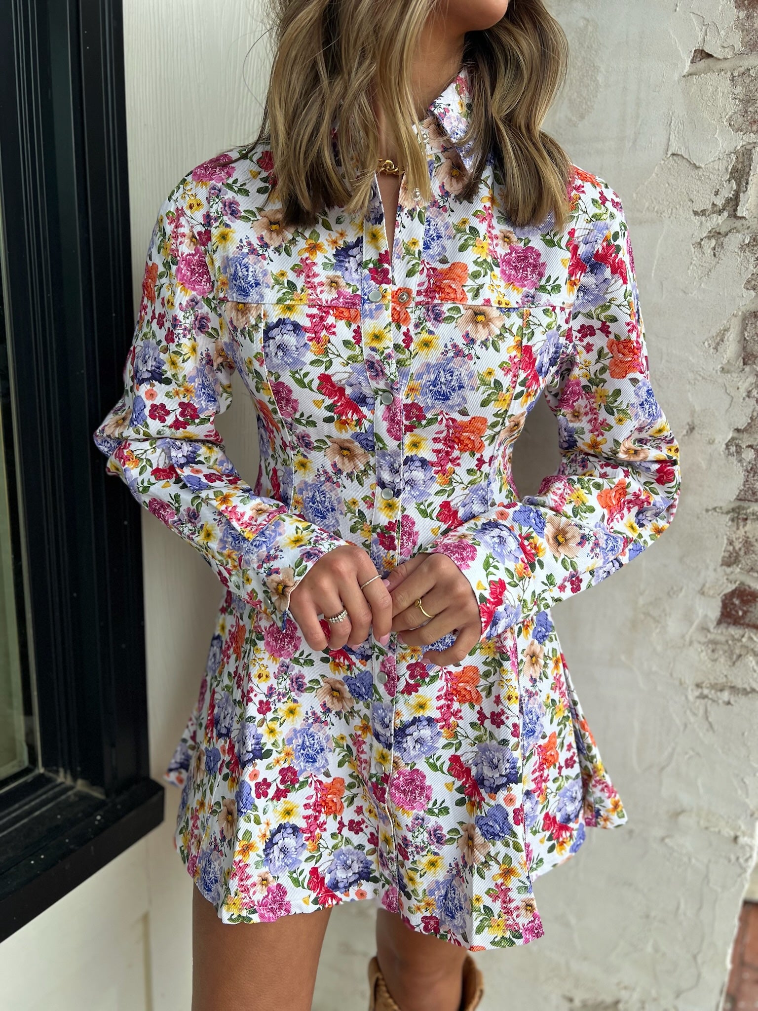 This fit and flare dress features a colorful floral print on a soft, lightweight fabric that feels comfortable and easy to wear. Designed with a classic collar and full button-front closure, it offers a structured look through the bodice with a gently flared skirt that moves beautifully. The long sleeves add coverage while keeping it seasonally versatile, making it a great option from early spring through fall.