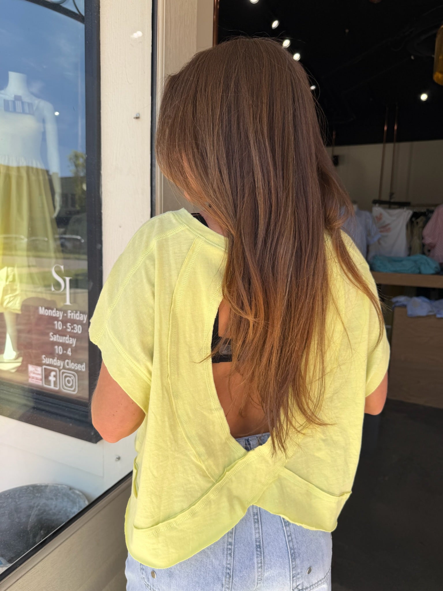 This light chartreuse tee features a relaxed, boxy fit with soft structure through the shoulders and sleeves. The open back design creates a subtle drape that reveals just enough, making it perfect layered over a fitted tank or bralette. The raw seam detailing adds a lived-in feel while the bright, fresh color keeps it feeling current.