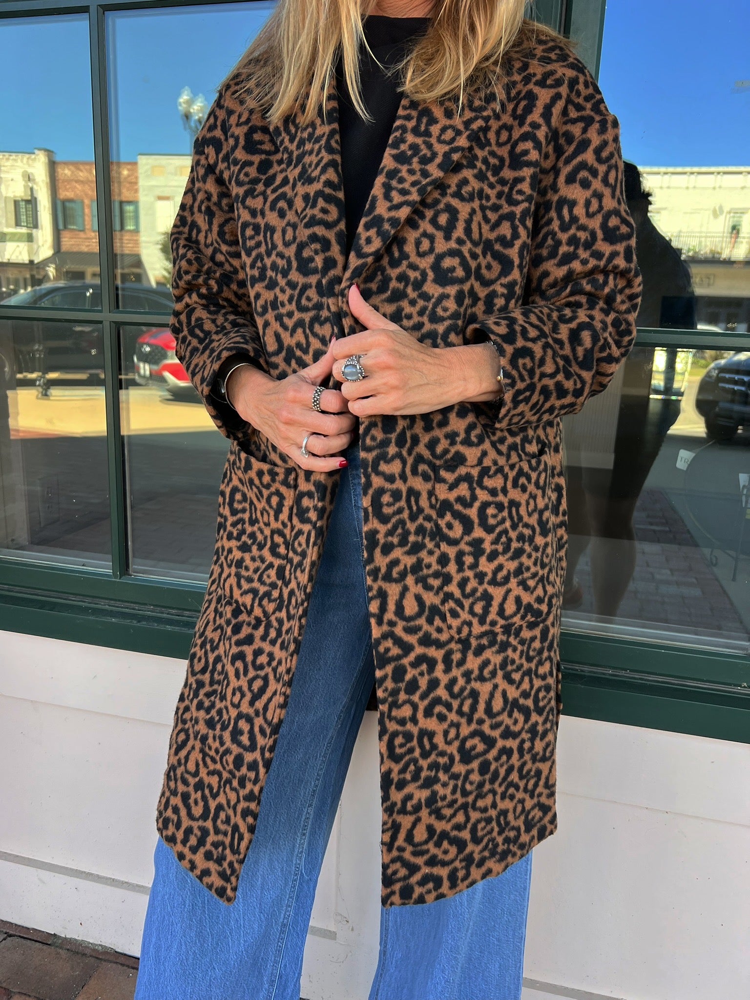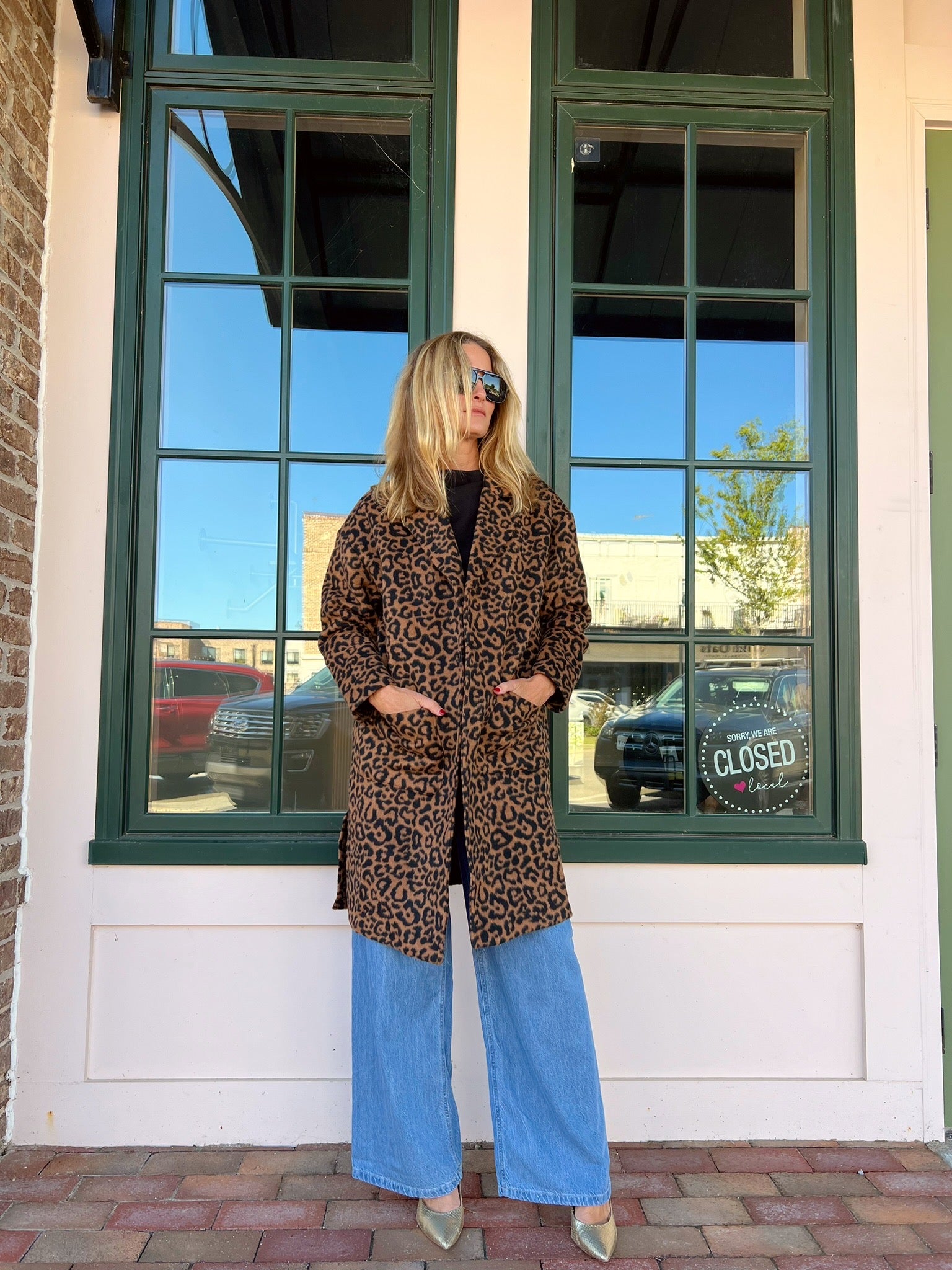 Bold, timeless, and just the right amount of wild—the Animal Instinct Leopard Coat is a showstopper in soft, midweight fabric that layers effortlessly over any look. Featuring an open front, side pockets, and a relaxed fit, it’s the statement piece your fall wardrobe’s been waiting for.