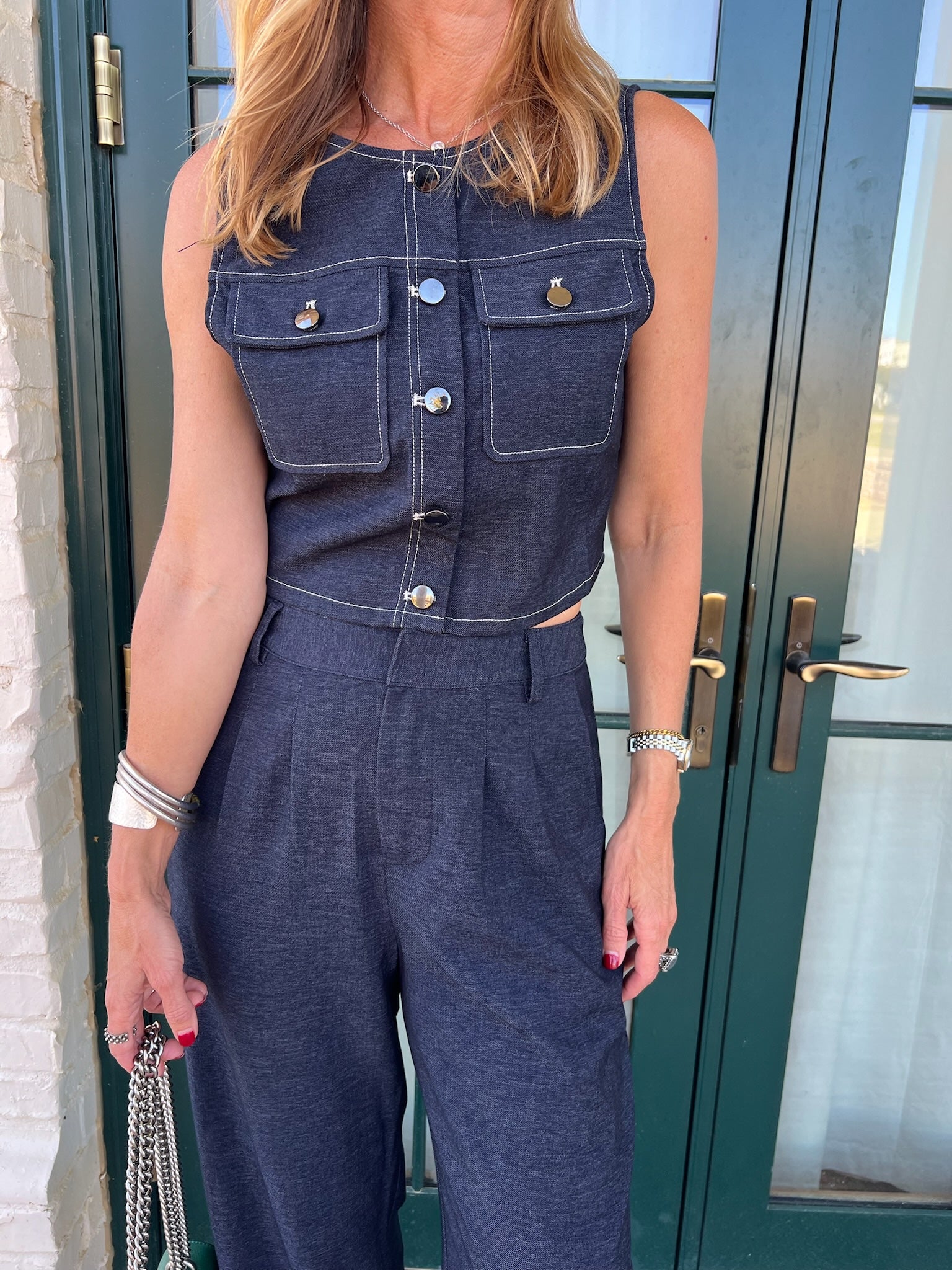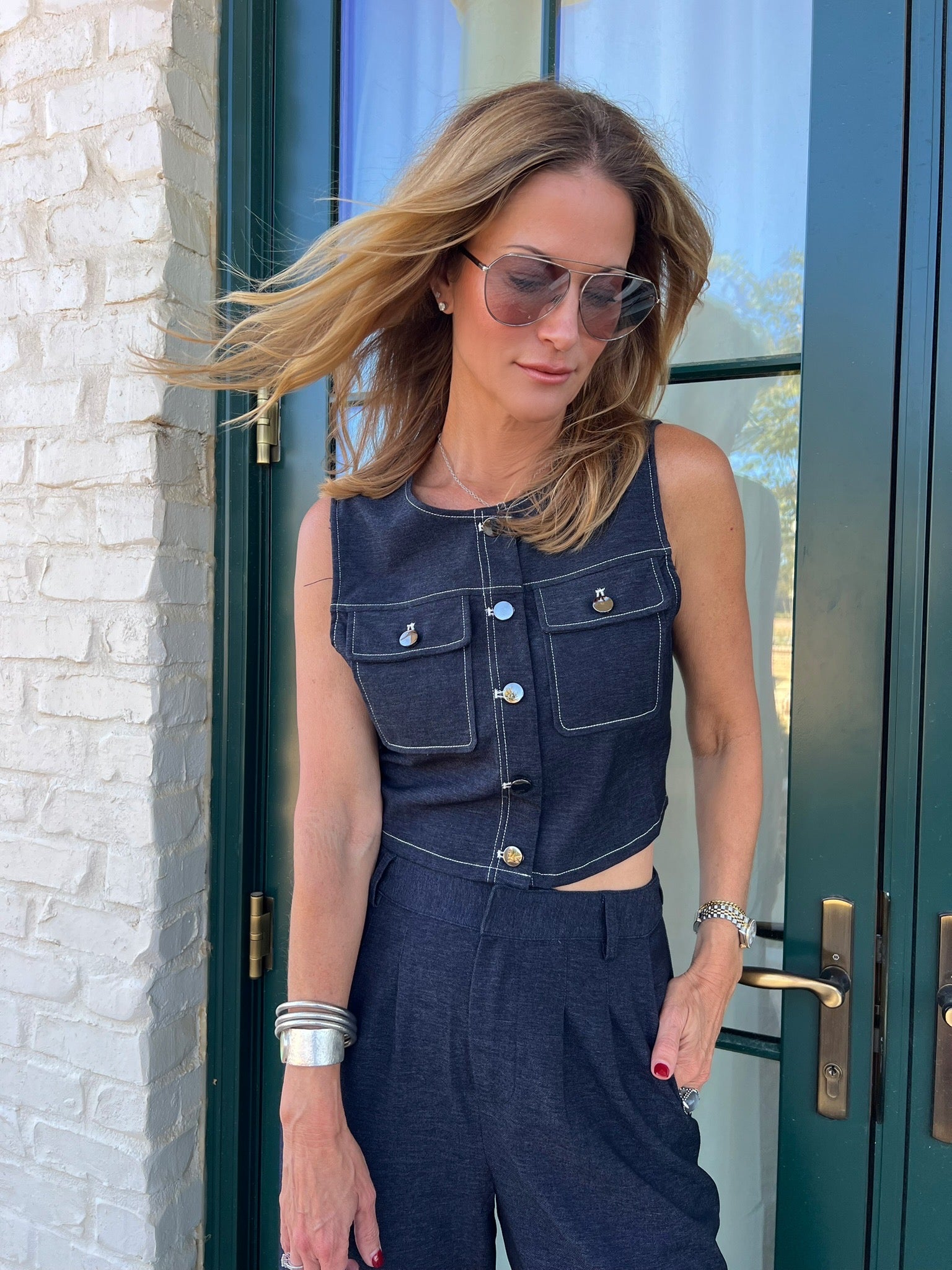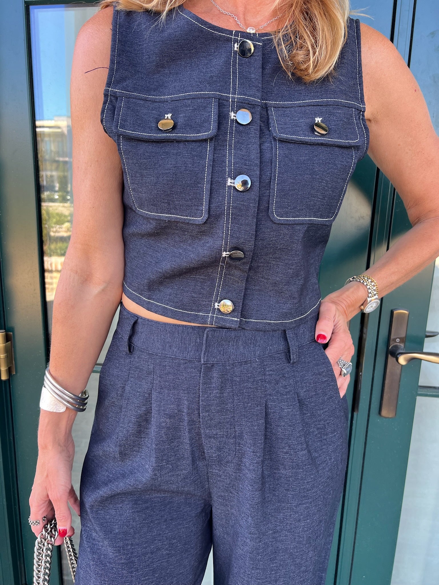 In need of the perfect mid-length vest? Add a dash of fun to your wardrobe with this denim vest top featuring shiny silver buttons and a slightly cropped cut. Perfect for layering or wearing solo, it brings a playful edge to any outfit while keeping things cool and casual. Pair it with the Troubleshooter Trousers to create a matching set!