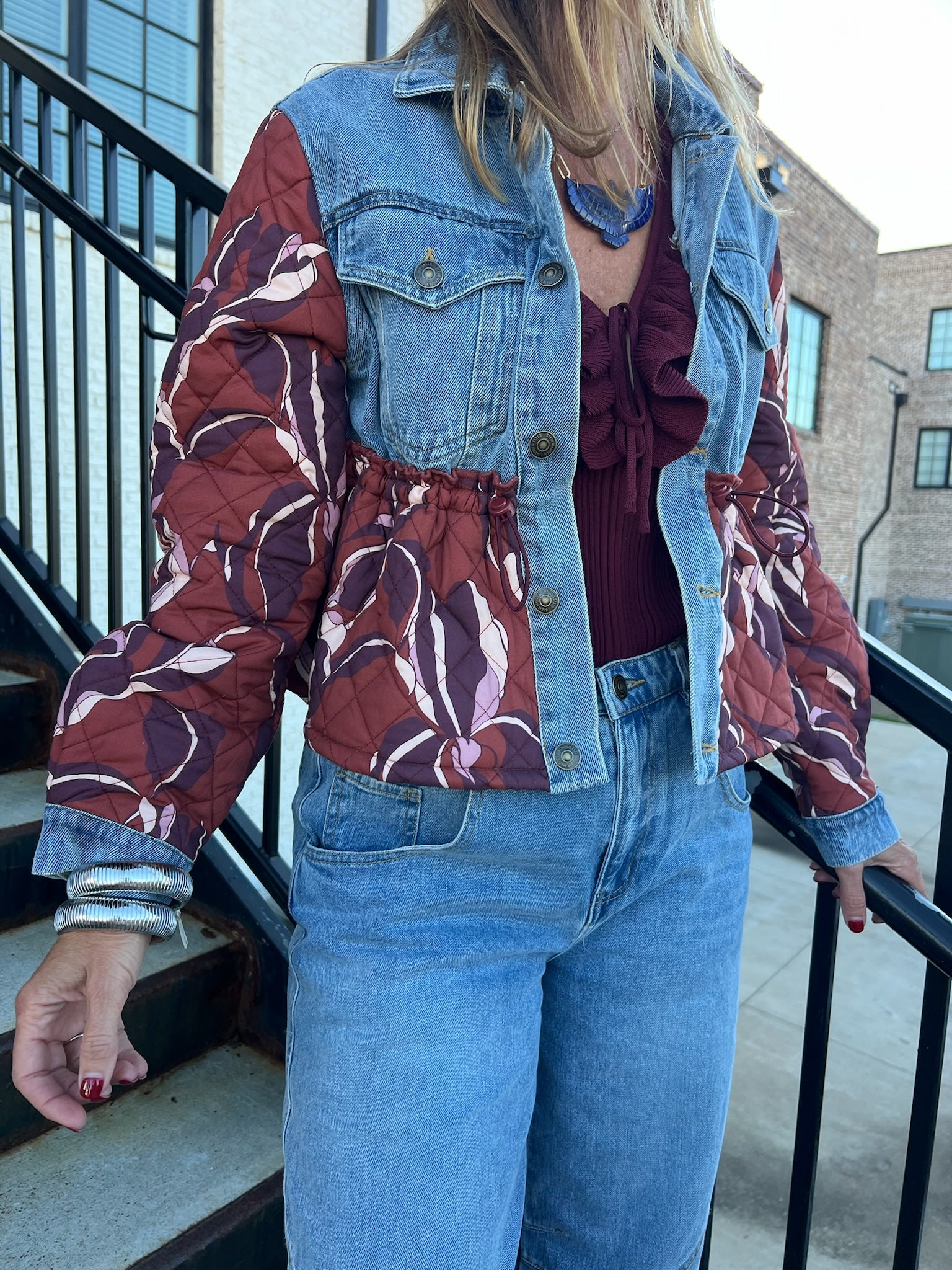 Meet the jacket that does it all — the Caddie combines classic denim with a bold quilted print for a one-of-a-kind look. With its flattering peplum hem and mix of textures, it’s the perfect statement layer for fall. We love the rich wine and blush tones that bring a feminine edge to your favorite jeans.