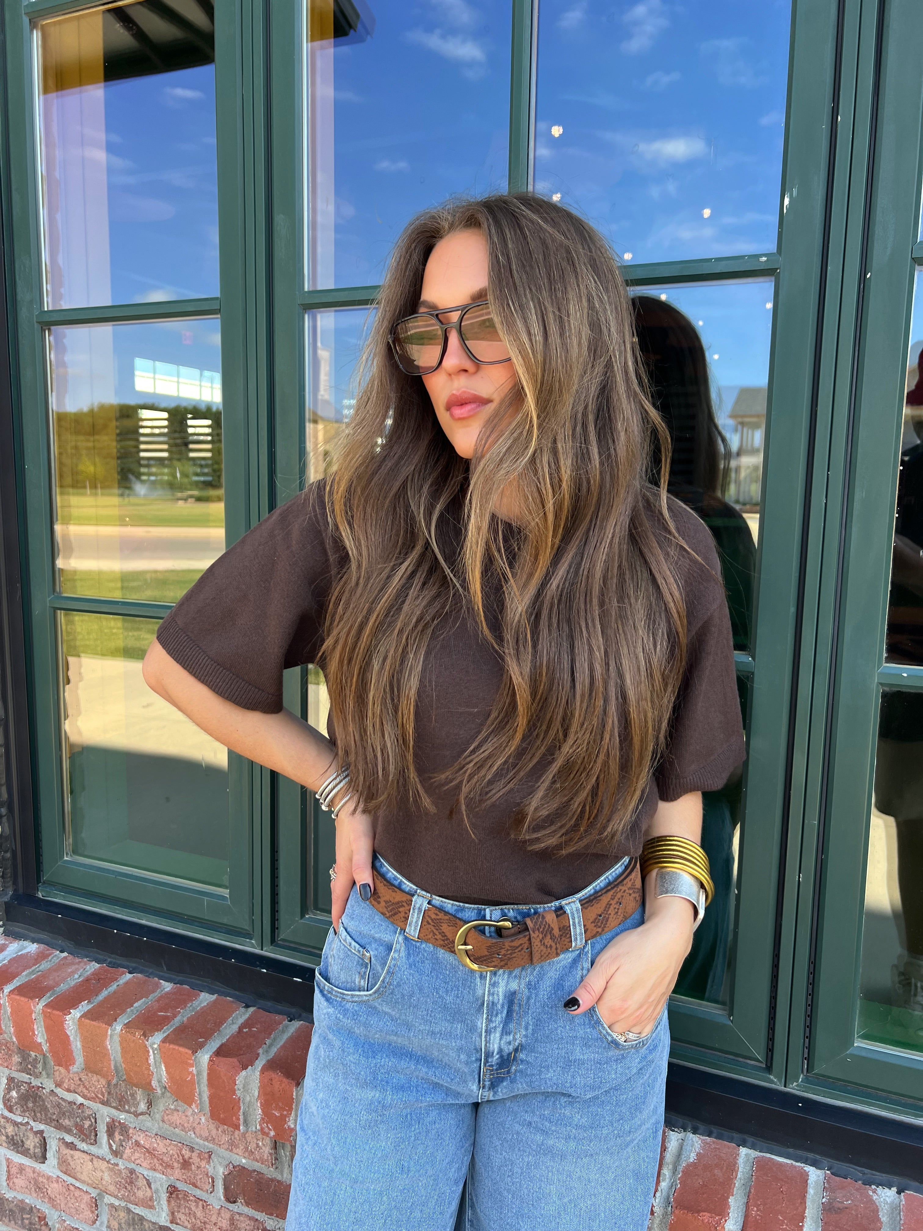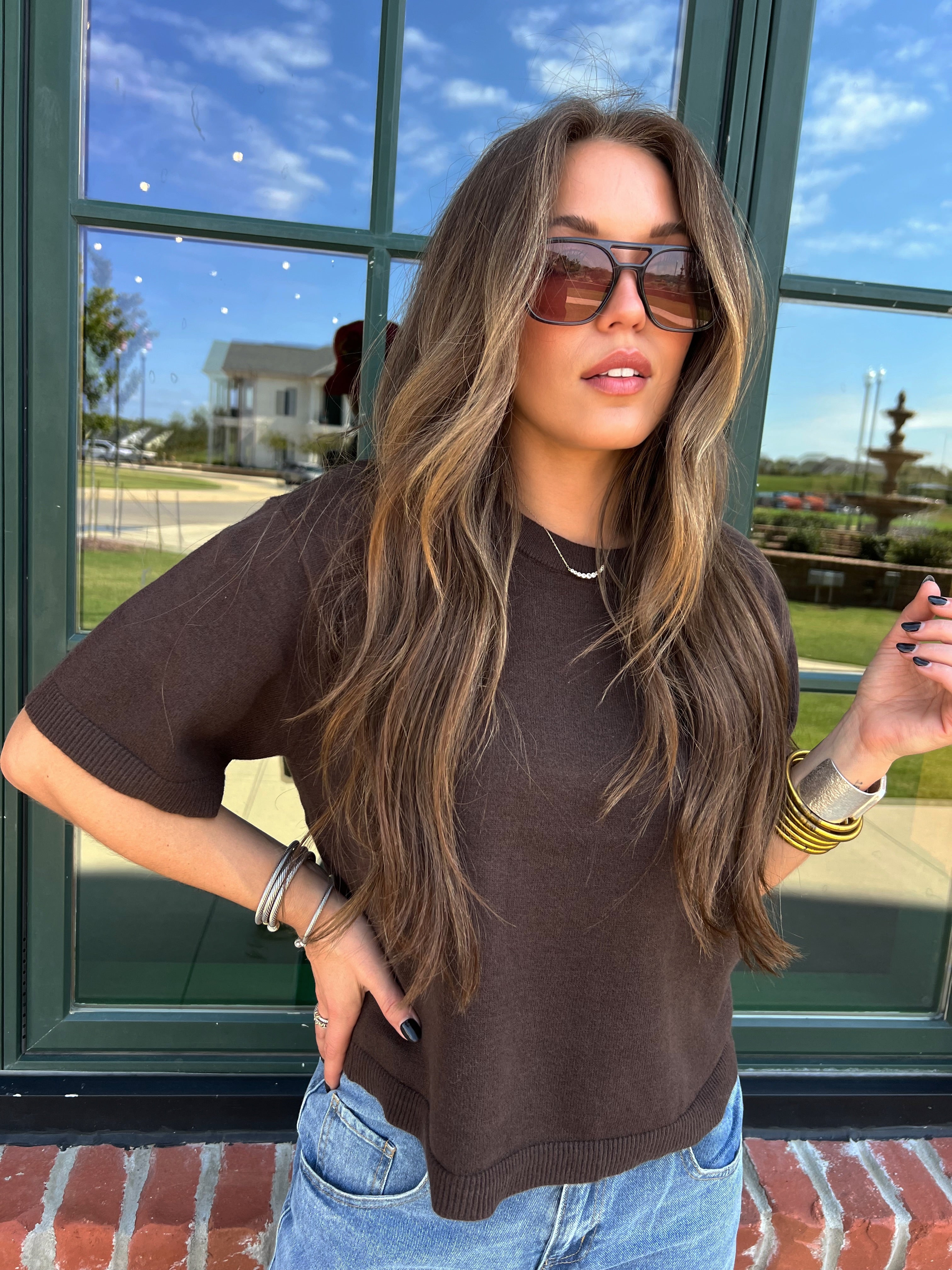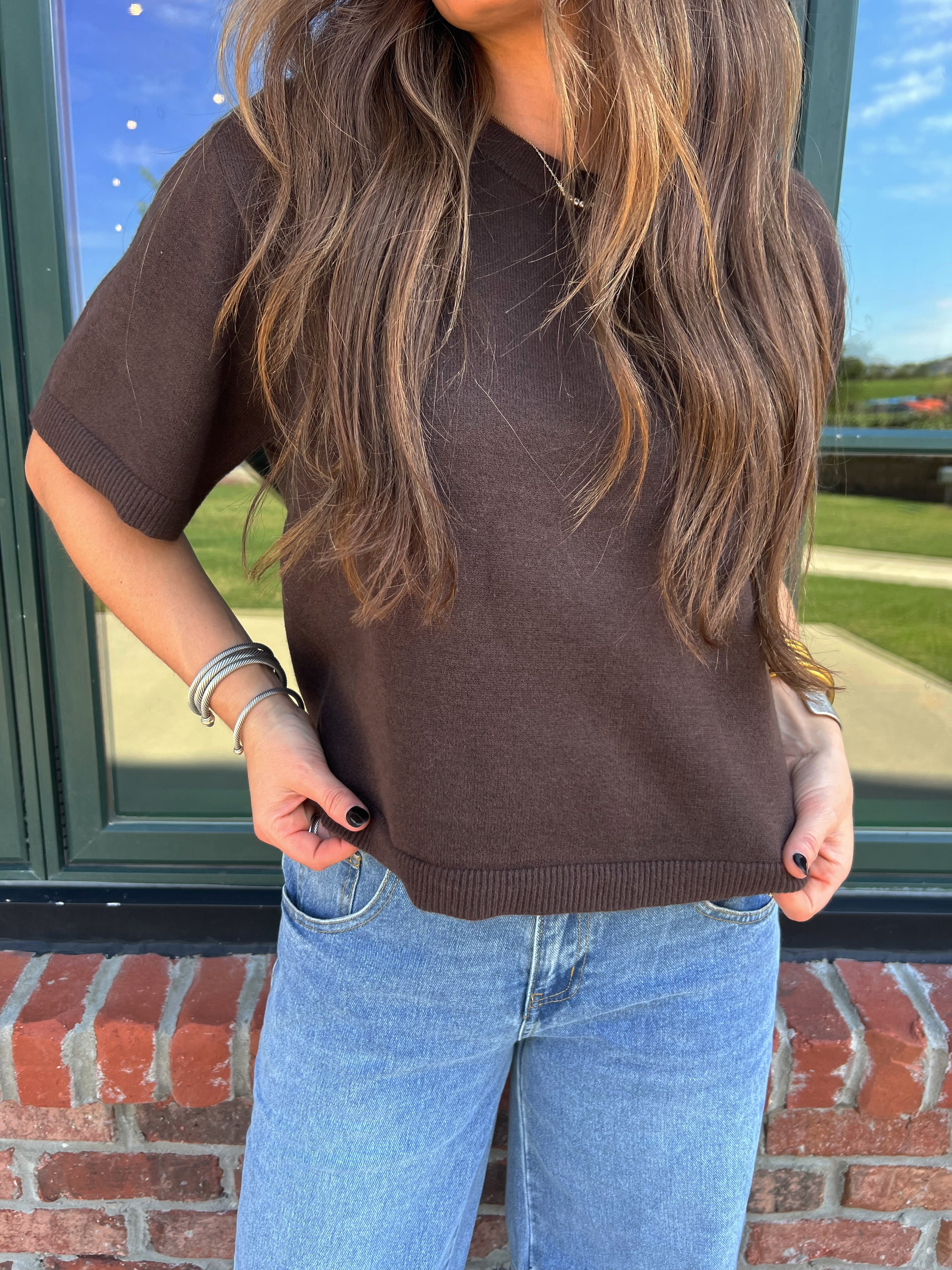 Effortlessly chic and endlessly wearable — this chocolate knit tee brings elevated simplicity to your everyday rotation. The soft, mid-weight knit gives it a luxe feel while the boxy silhouette keeps it modern and flattering. It’s the perfect not-too-fitted, not-too-loose shape that pairs beautifully with denim, skirts, or trousers.