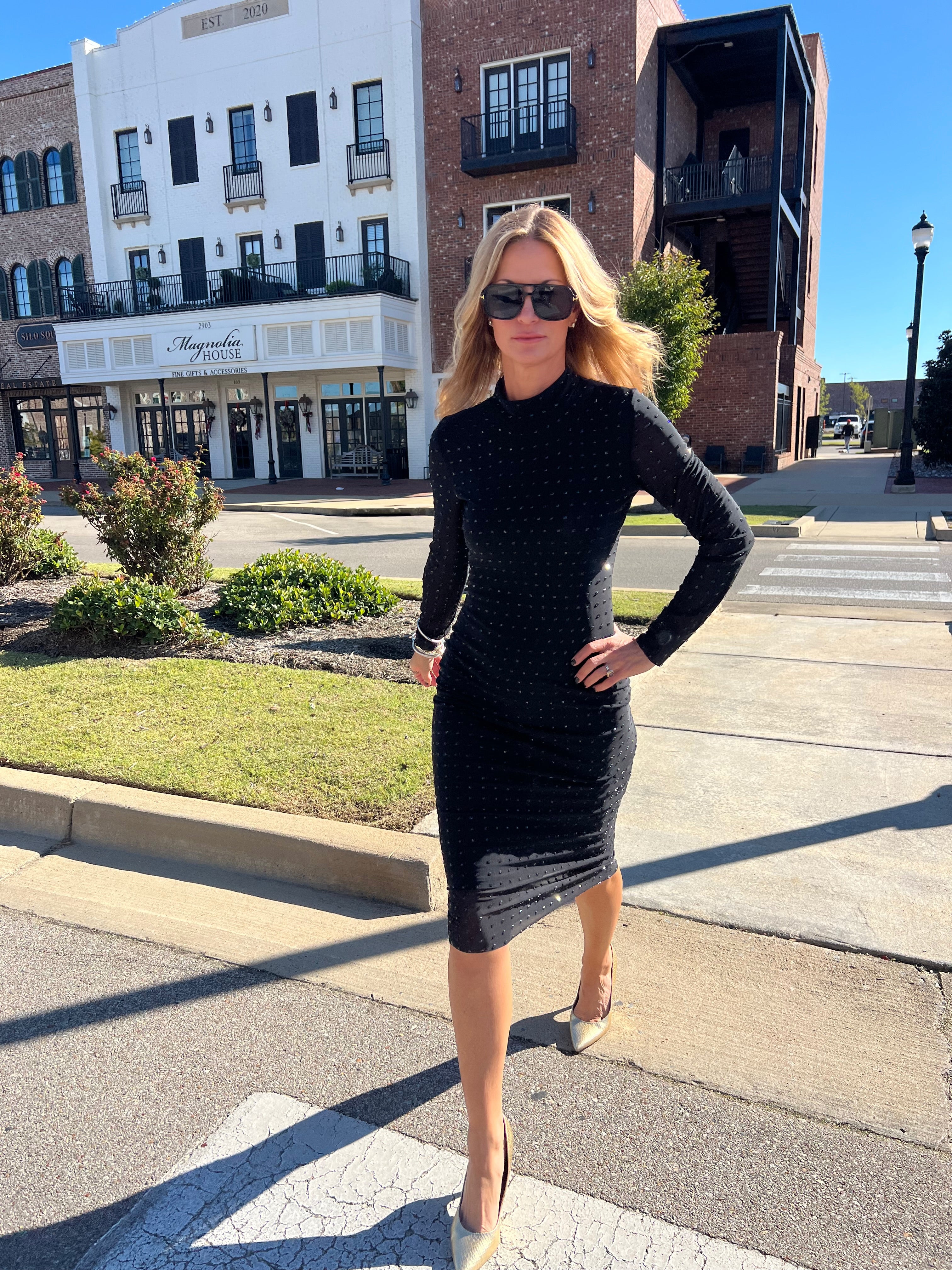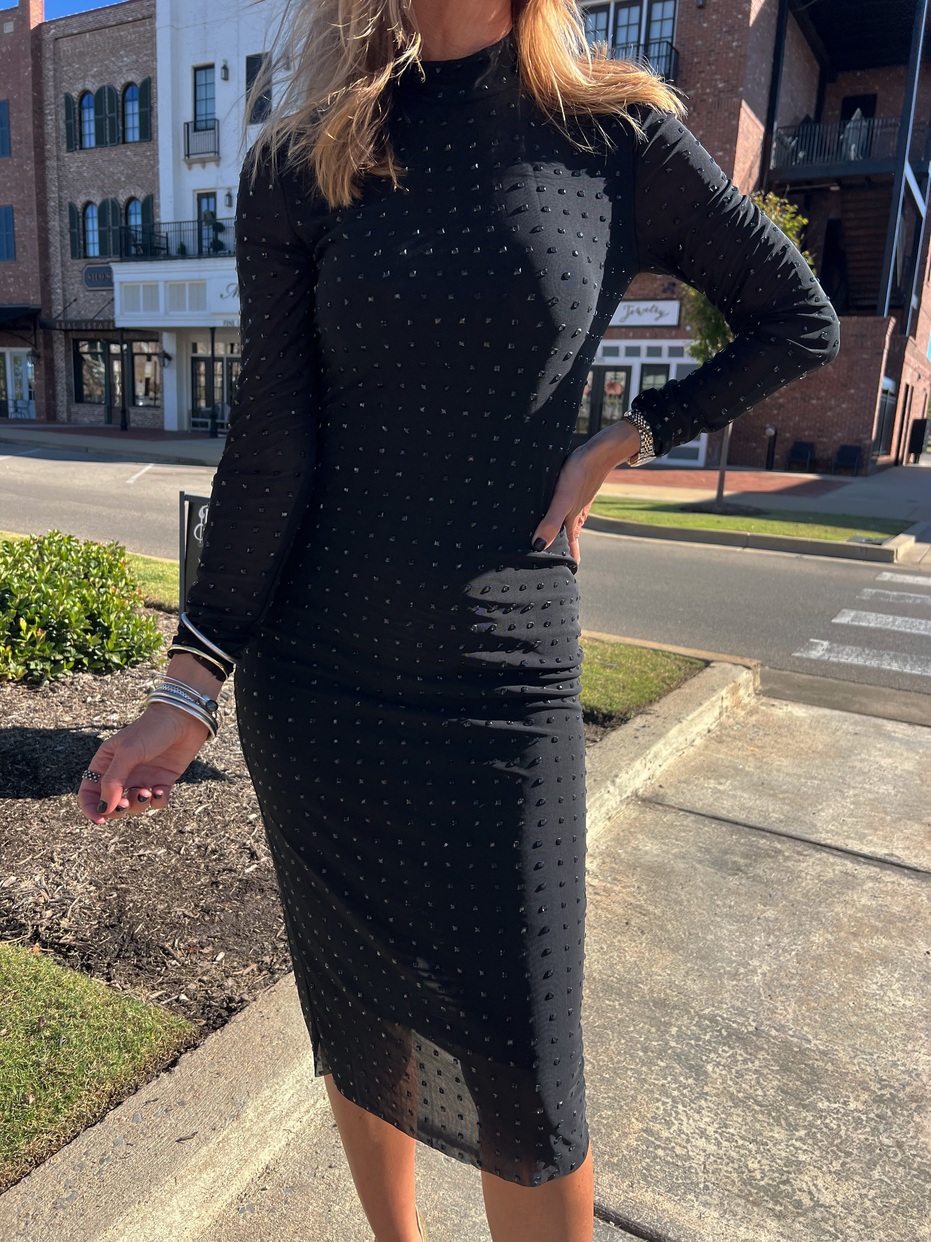 A Steve Madden showstopper that catches every light in the room. This stunning midi features an allover embellished design with a sleek mock neckline and a subtle back zipper for a flawless fit. The silhouette hugs in all the right places with just the right amount of stretch—sophisticated, flattering, and unforgettable.