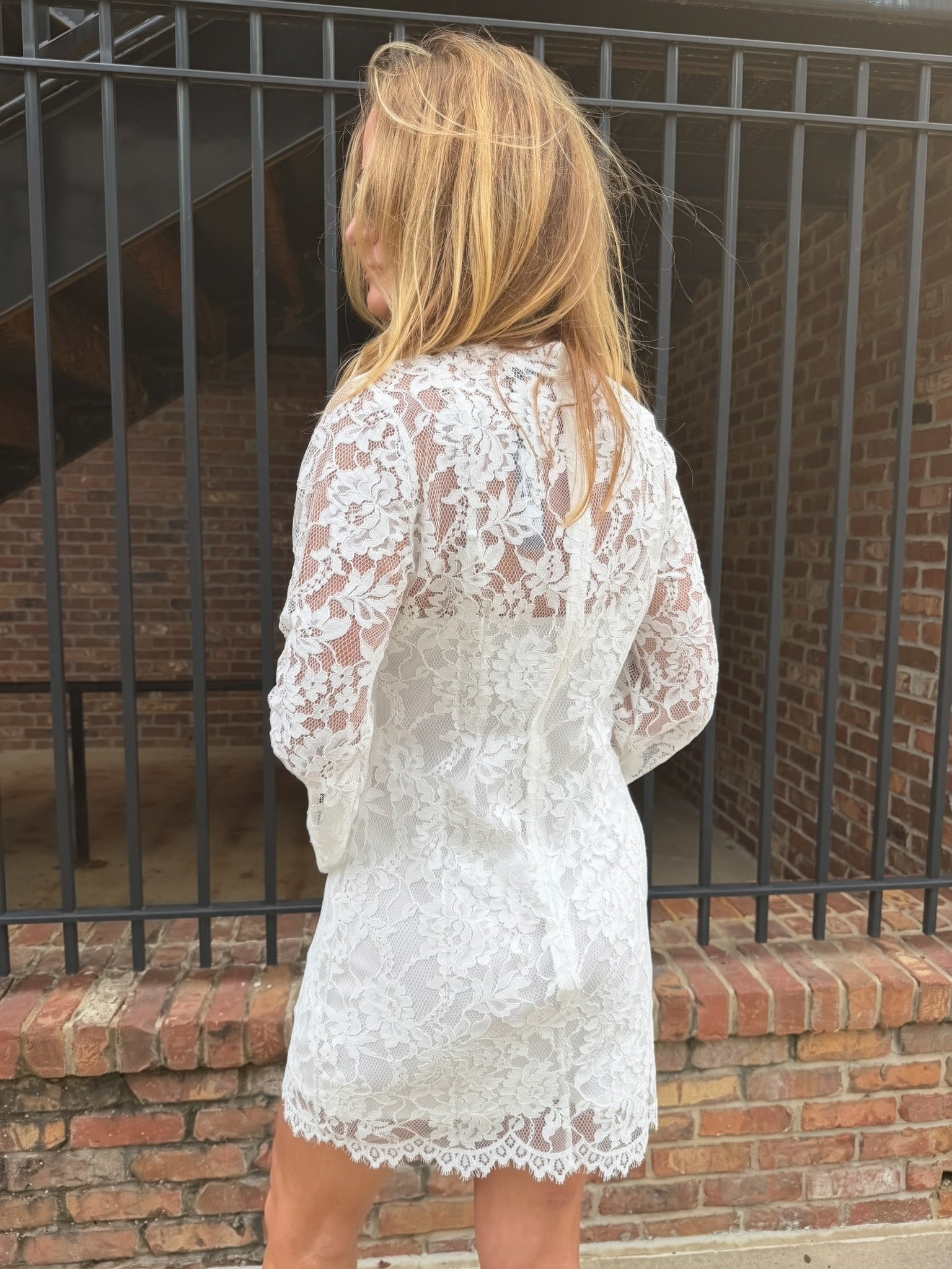 A scalloped lace hem adds delicate texture and finishes the dress beautifully, while the lined body provides coverage and allows the lace sleeves and neckline to stand out. It is an easy piece that feels both classic and elevated.