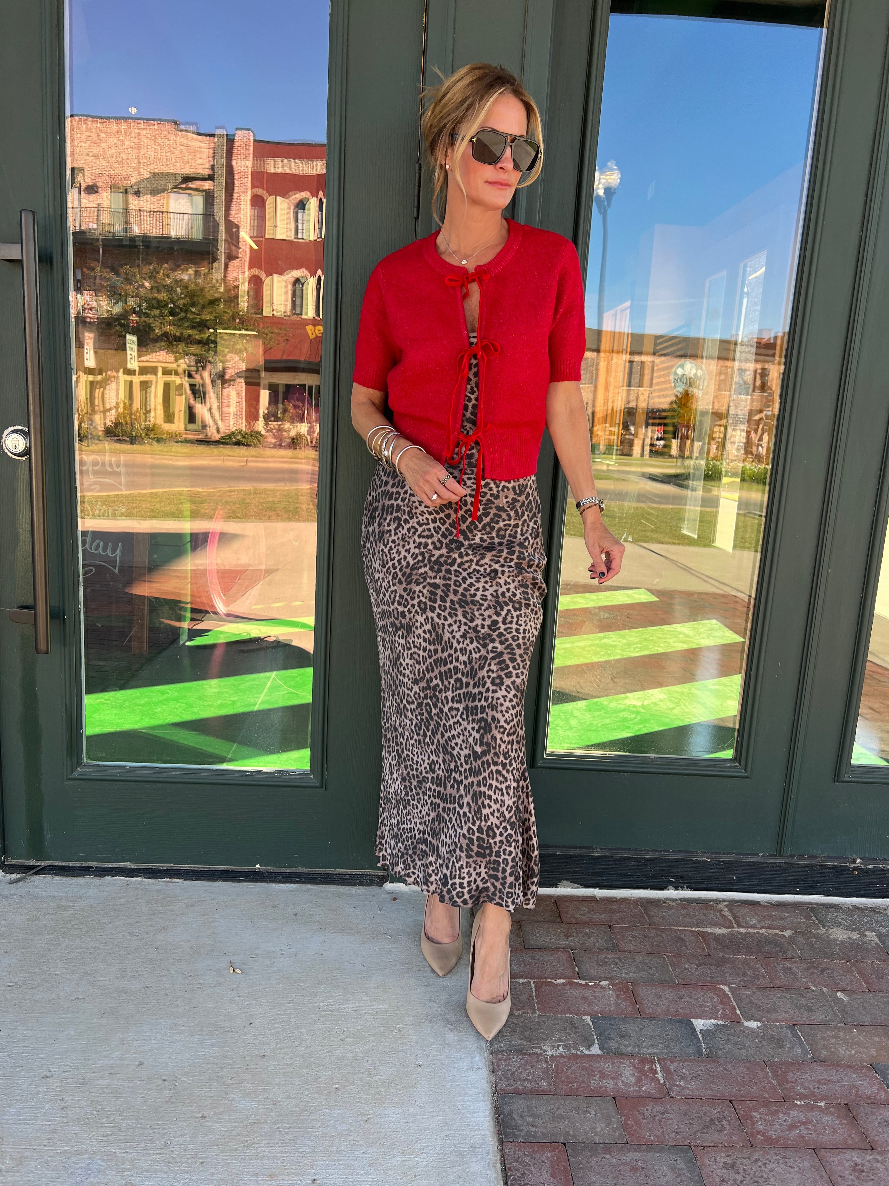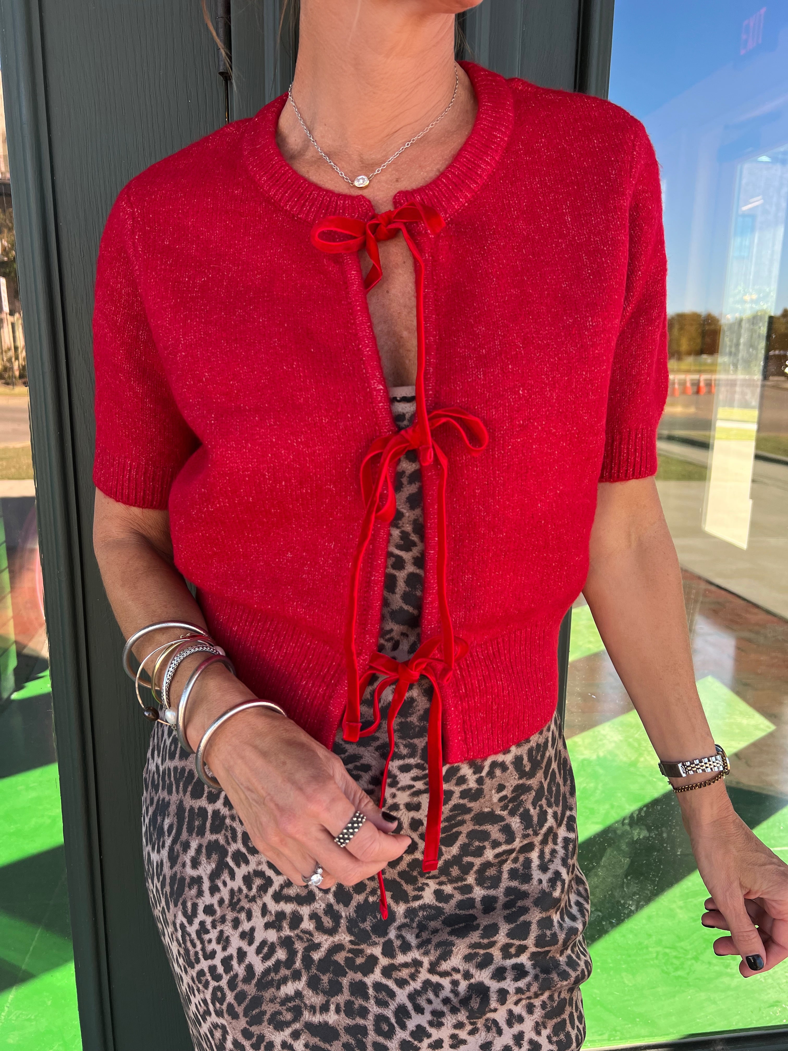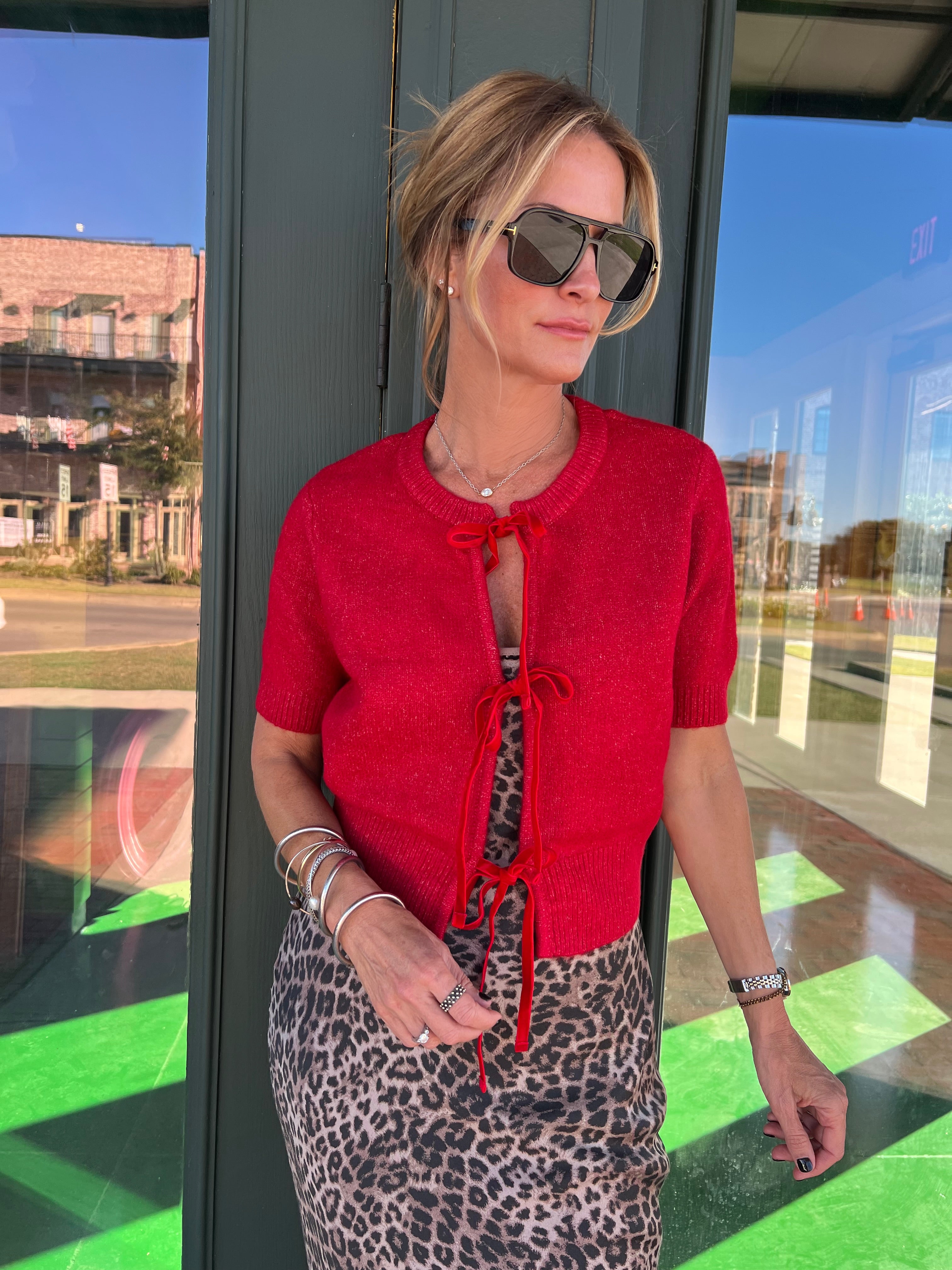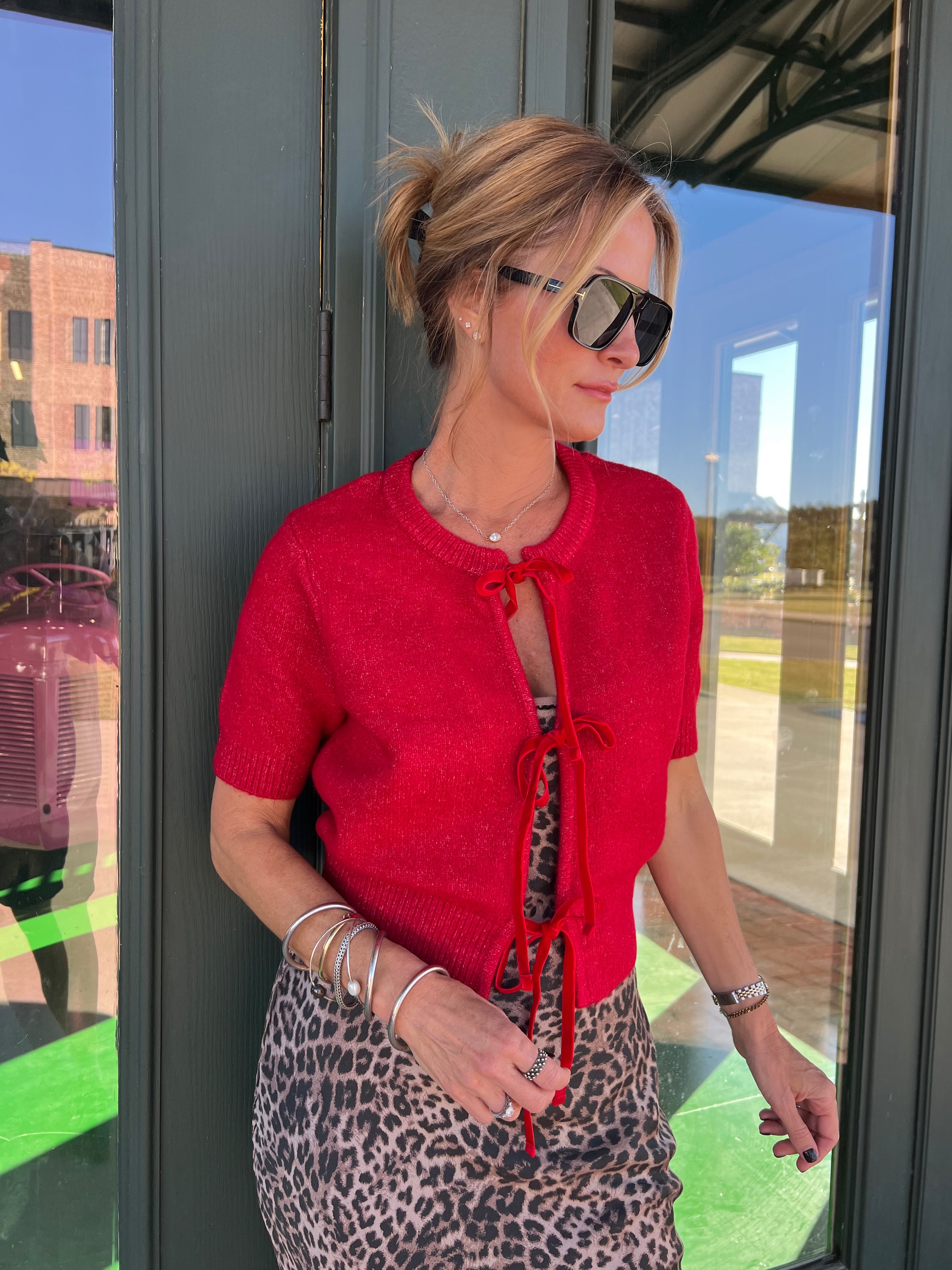 Bold, flirty, and full of charm — this Steve Madden cardigan brings a playful twist to a classic knit. Featuring a cropped silhouette, short sleeves, and dainty ribbon tie closures down the front, it’s equal parts sweet and statement-making. The soft knit fabric and rich red hue make it a standout piece for the season.