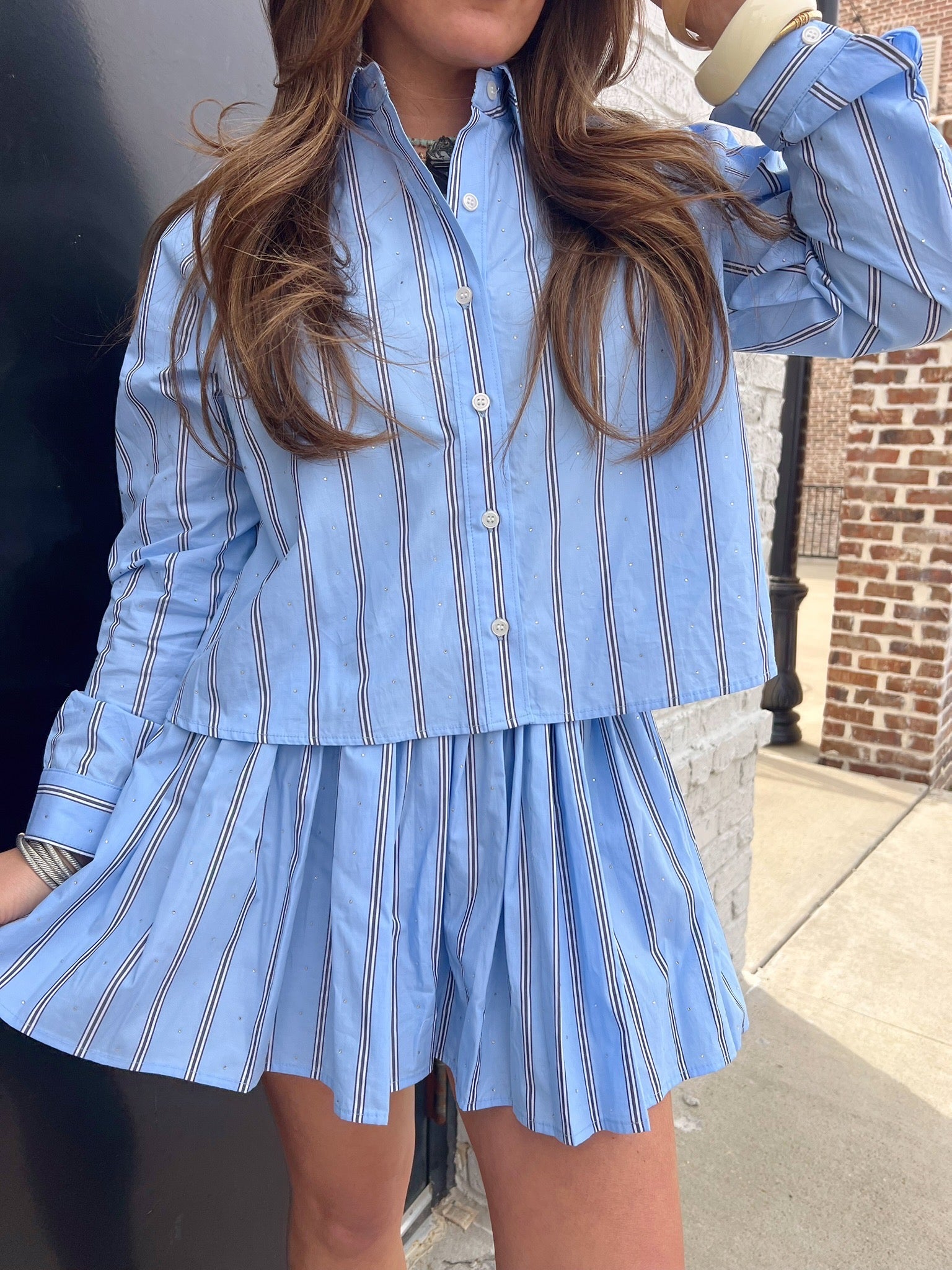 The TESS TOP ESTATE BLUE combines timeless sophistication with versatile everyday wear. This long-sleeved button-up features a refined stripe pattern that adds visual interest while maintaining a polished aesthetic. The structured collared neckline provides a classic silhouette that transitions seamlessly from office settings to casual outings. The thoughtful design allows for layering flexibility—wear it buttoned for a put-together look or leave it partially open over a fitted tee for relaxed styling. Quality construction ensures durability through repeated wear and washing, making this a reliable staple for any wardrobe.