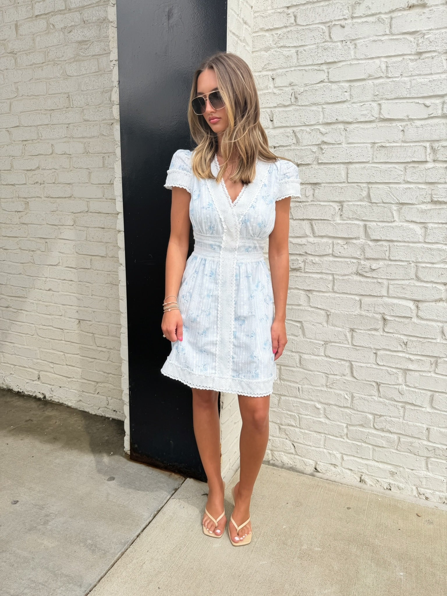Light, feminine details give this dress an effortless spring feel. The Karen Floral Lace Mini Dress features a soft blue floral print accented with delicate lace trim along the V neckline, bodice, sleeves, and hem. The fitted waist creates a flattering silhouette while the softly gathered skirt keeps the shape light and graceful.