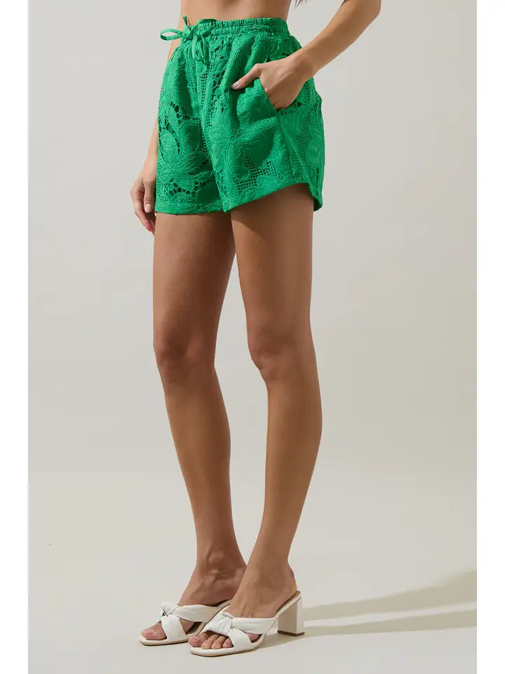 These green lace shorts feature intricate floral cutwork layered over a soft lining, giving you that detailed look without sacrificing comfort. The elastic waistband with an adjustable drawstring keeps the fit relaxed and flattering, while the scalloped hem adds a soft, feminine finish. They’re lightweight, breathable, and made to move with you.
