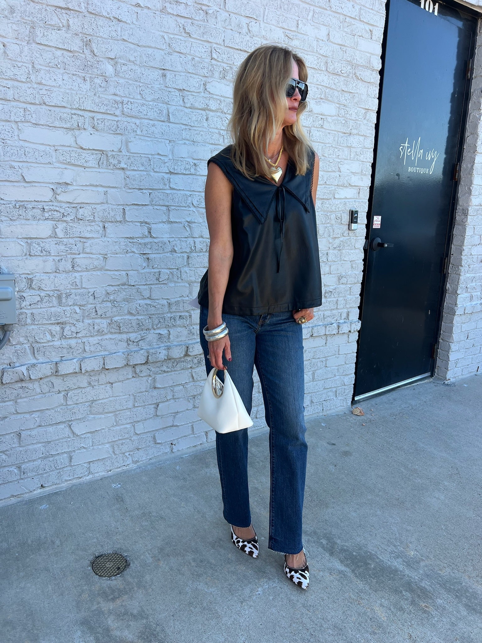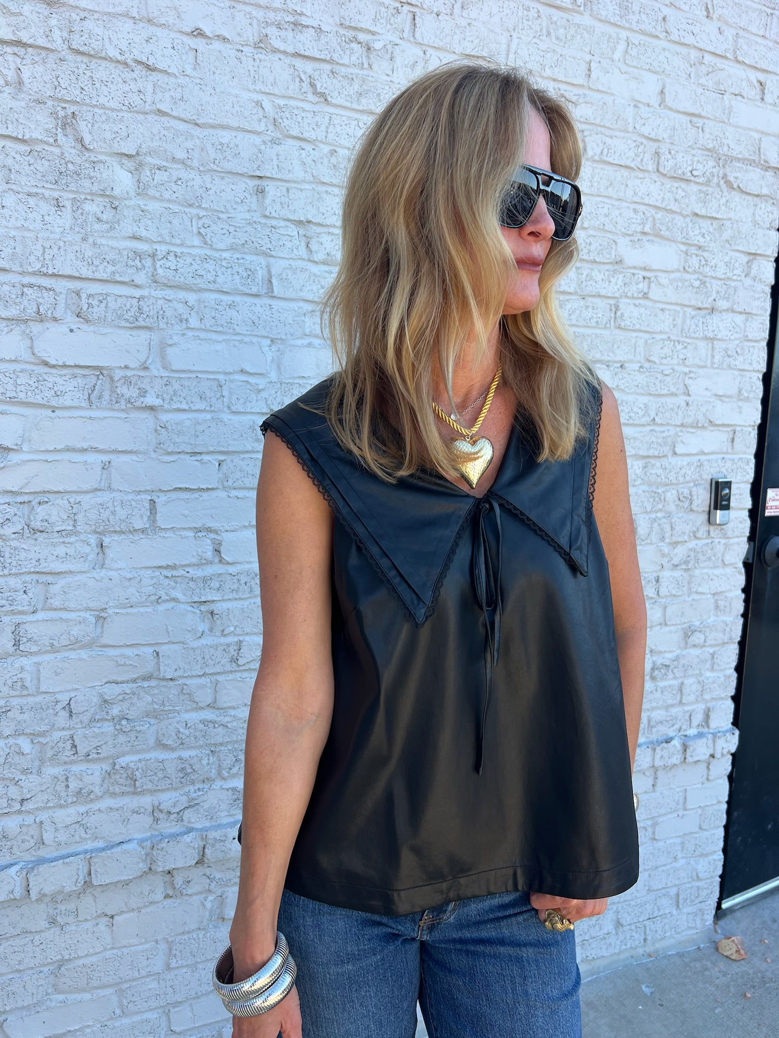 The Livy Faux Leather Top gives a modern twist to feminine style with its oversized statement collar and delicate lace trim. The relaxed fit and soft faux leather finish make it effortlessly cool—perfect for layering or wearing solo. The tie neckline adds a subtle, playful touch that keeps it chic yet edgy.