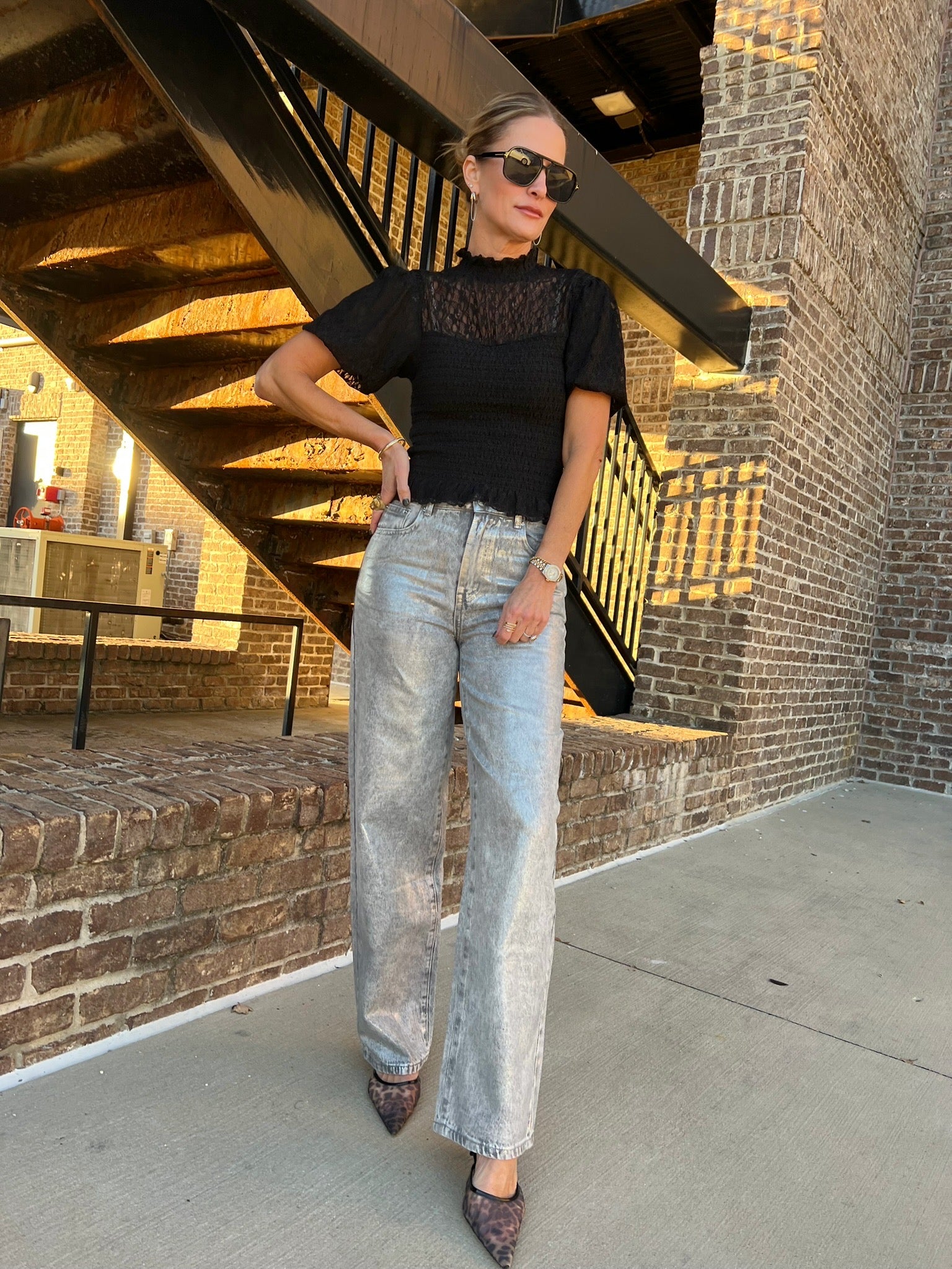A mix of delicate lace and smocking gives this top a flattering fit and elevated look. Perfect for the holiday’s!