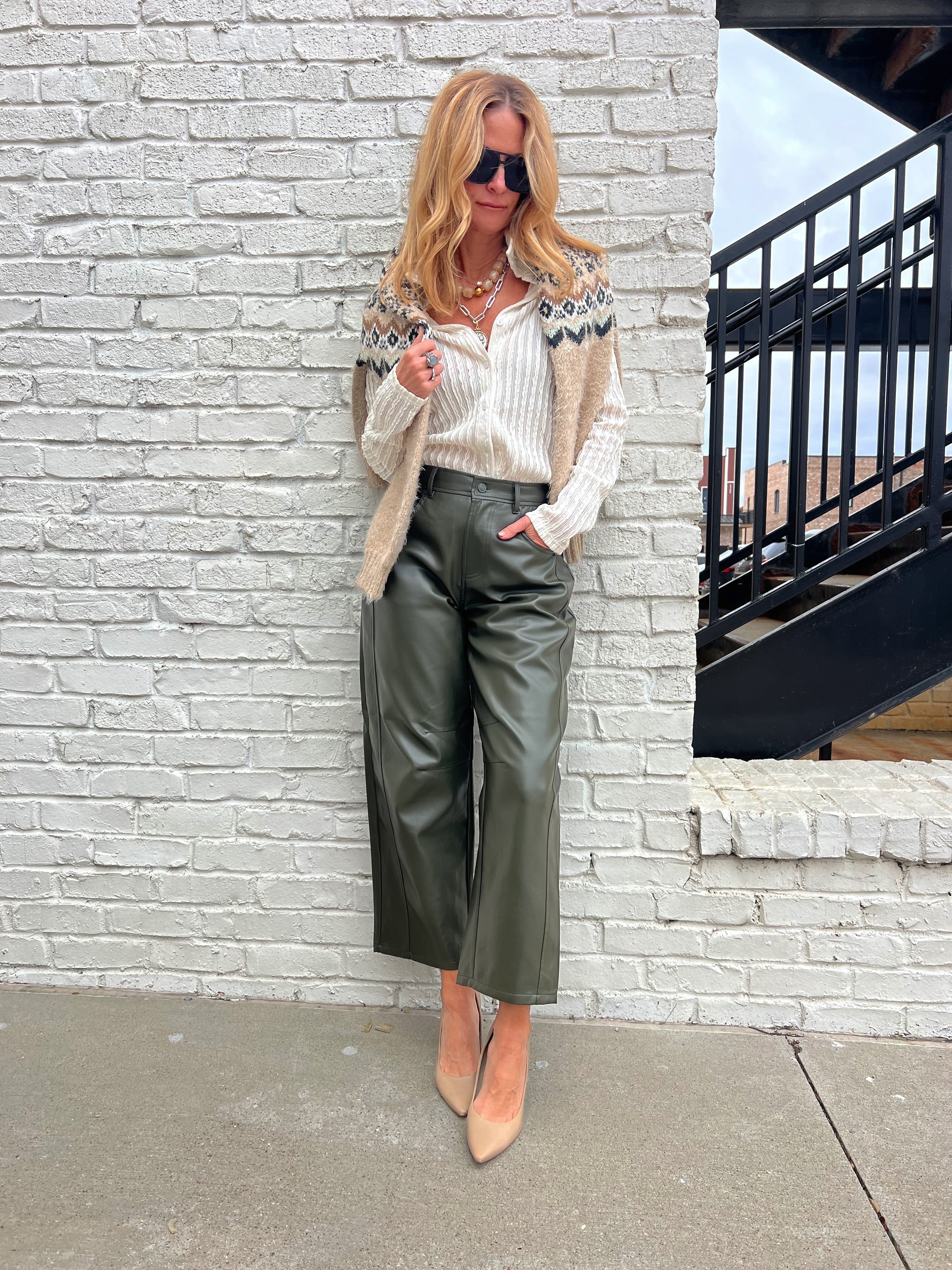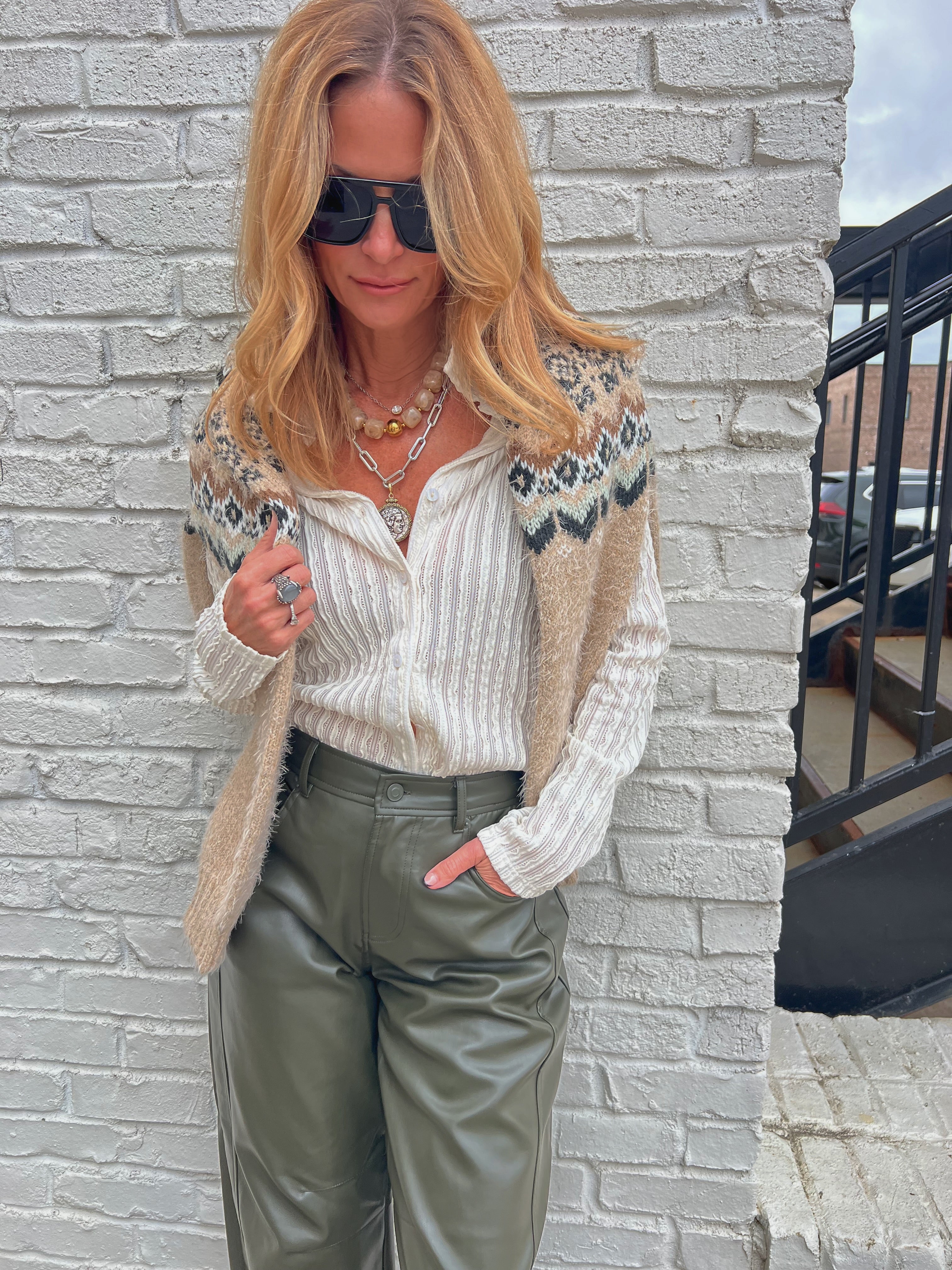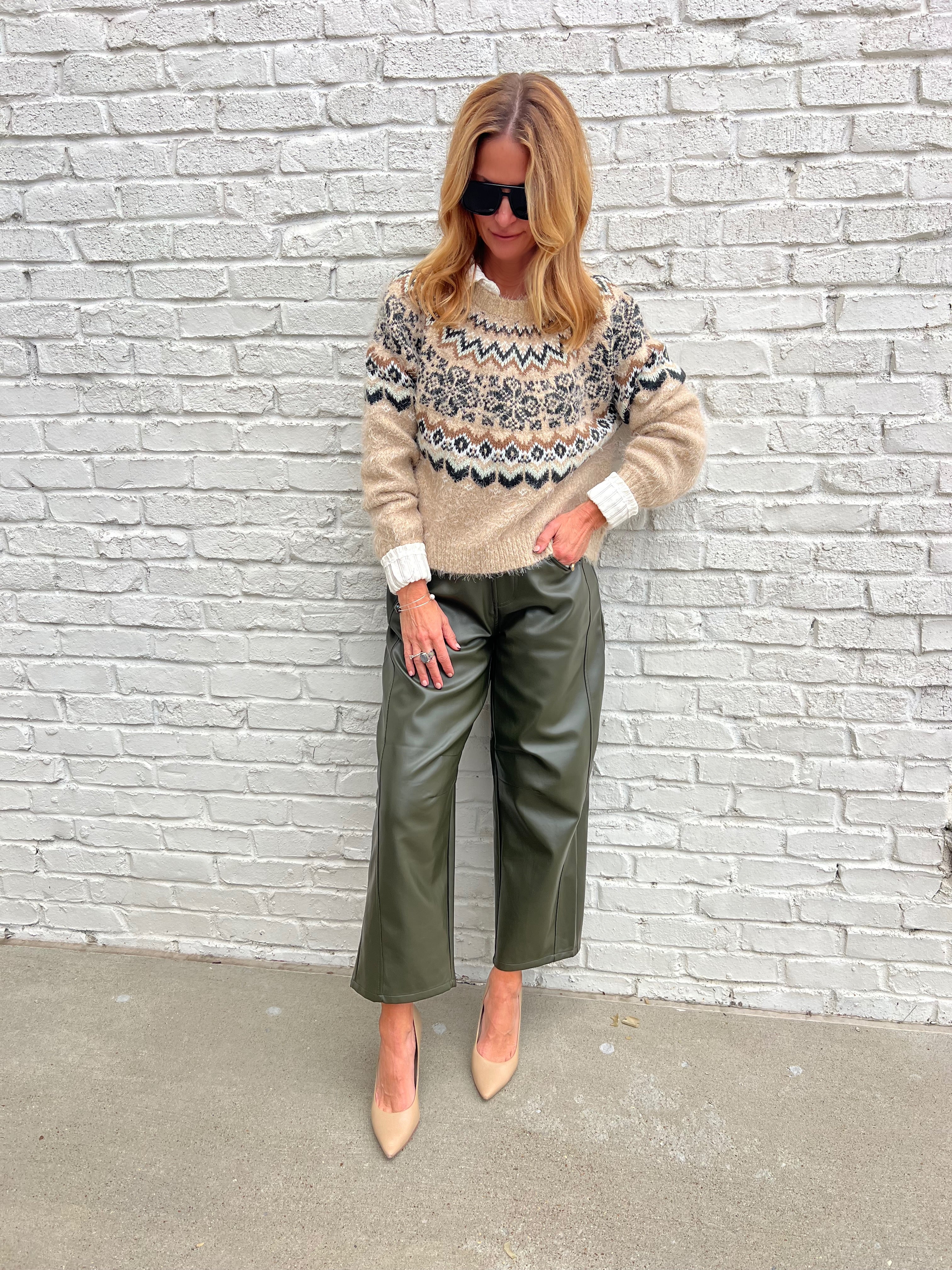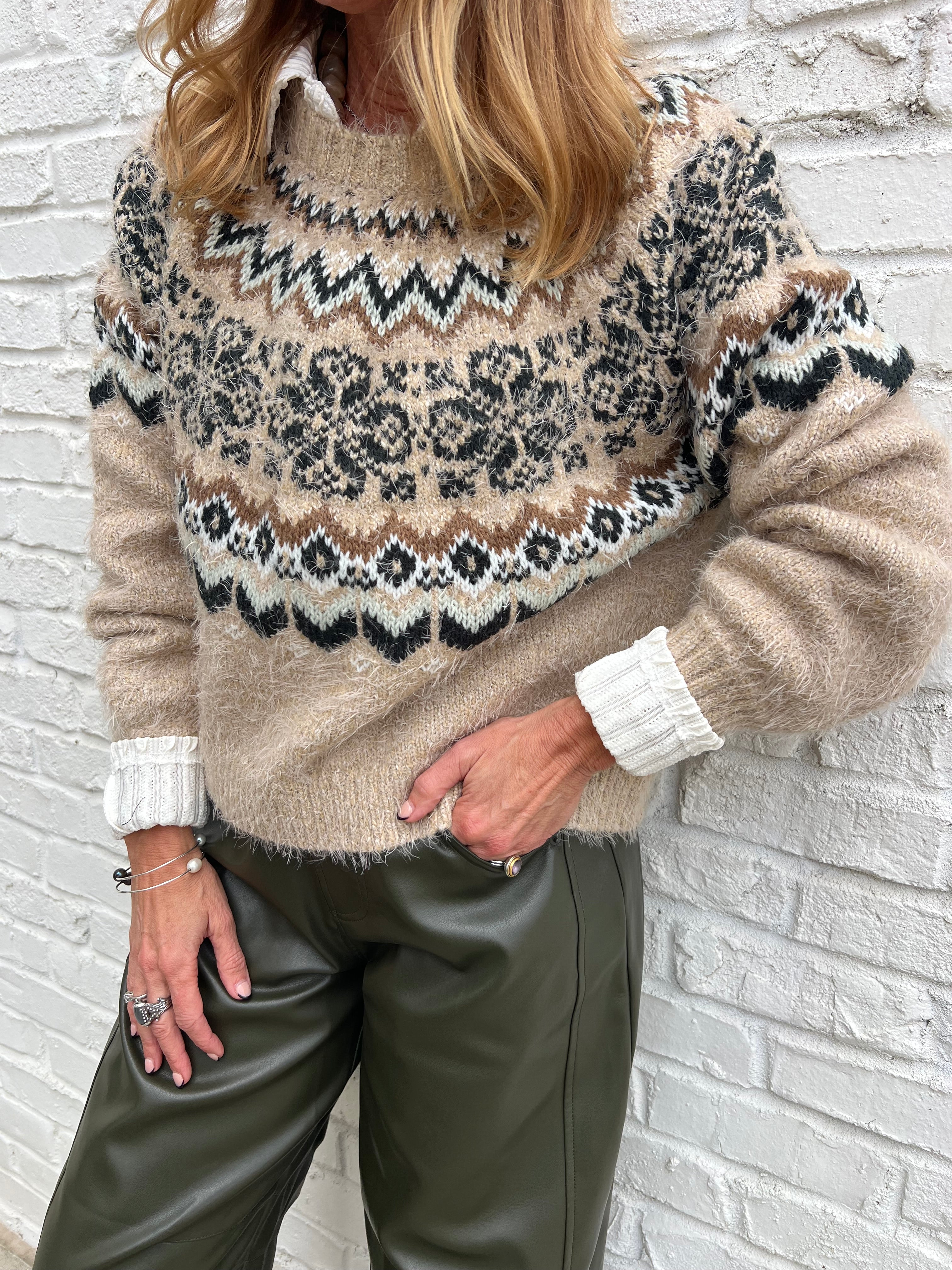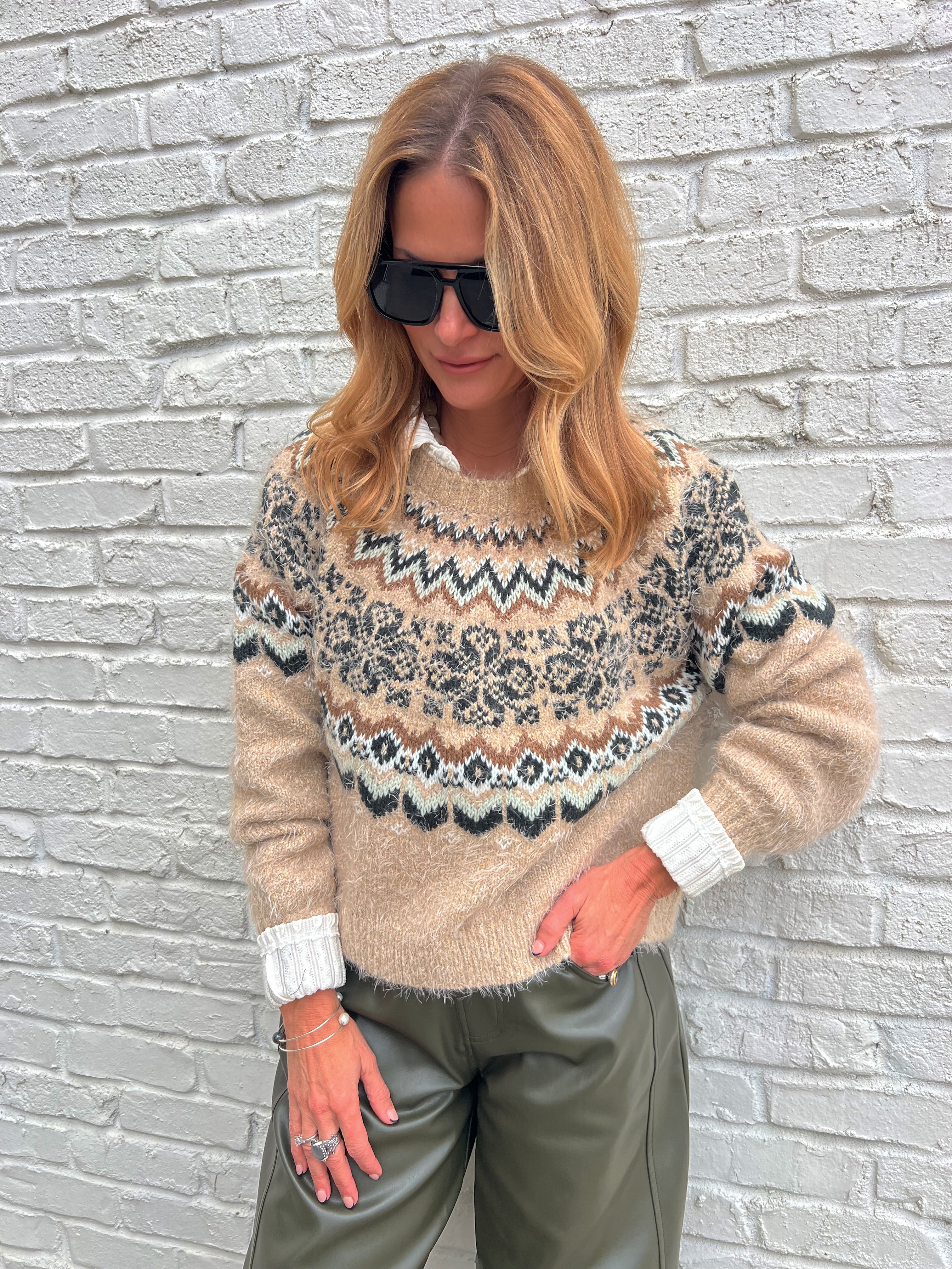 This Fair Isle sweater brings all the cozy, winter-ready charm in the prettiest neutral palette. The soft, brushed knit feels plush without being heavy, and the mix of patterns gives it that classic, lodge-inspired look you’ll want to wear on repeat. It pairs so well with denim, leather, or trousers, making it an easy statement piece for cold days. 🤎❄️