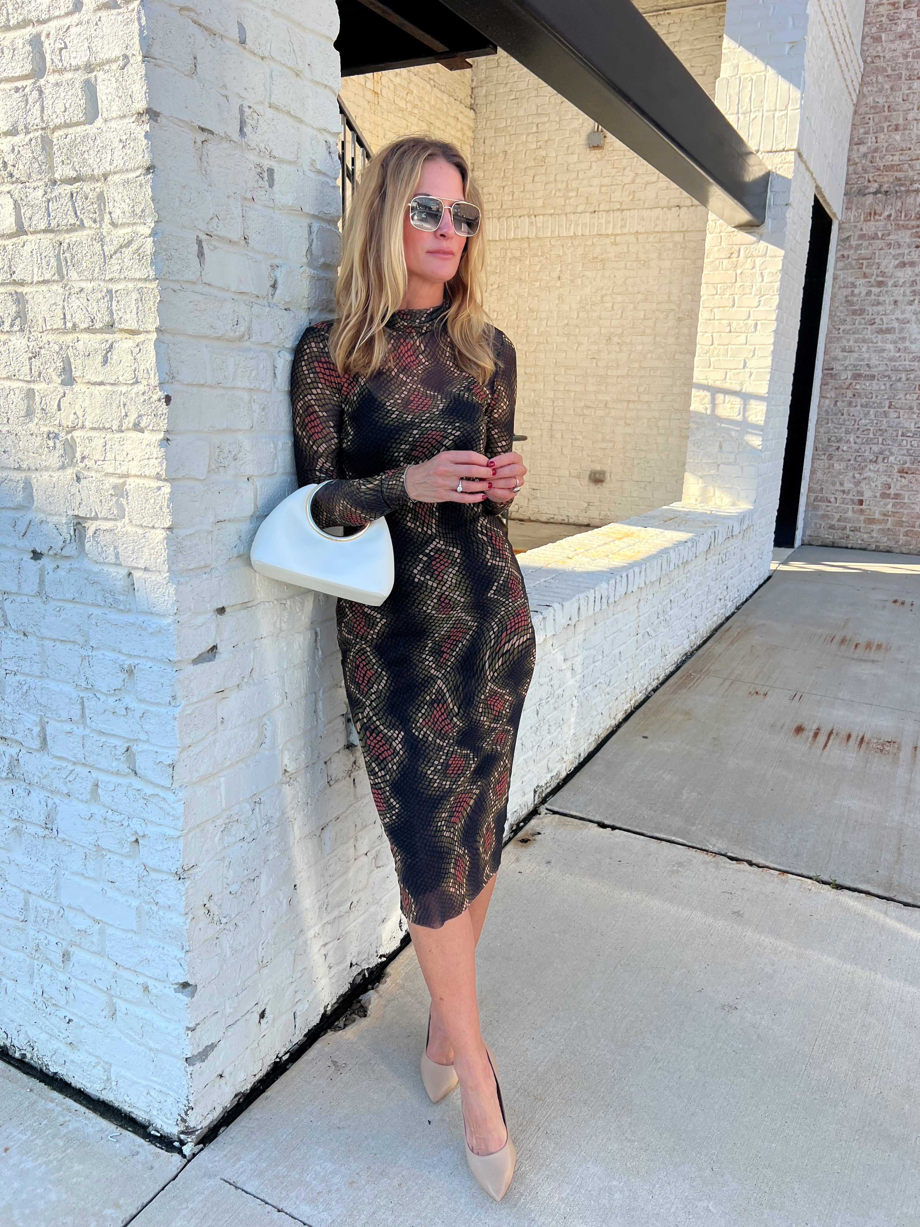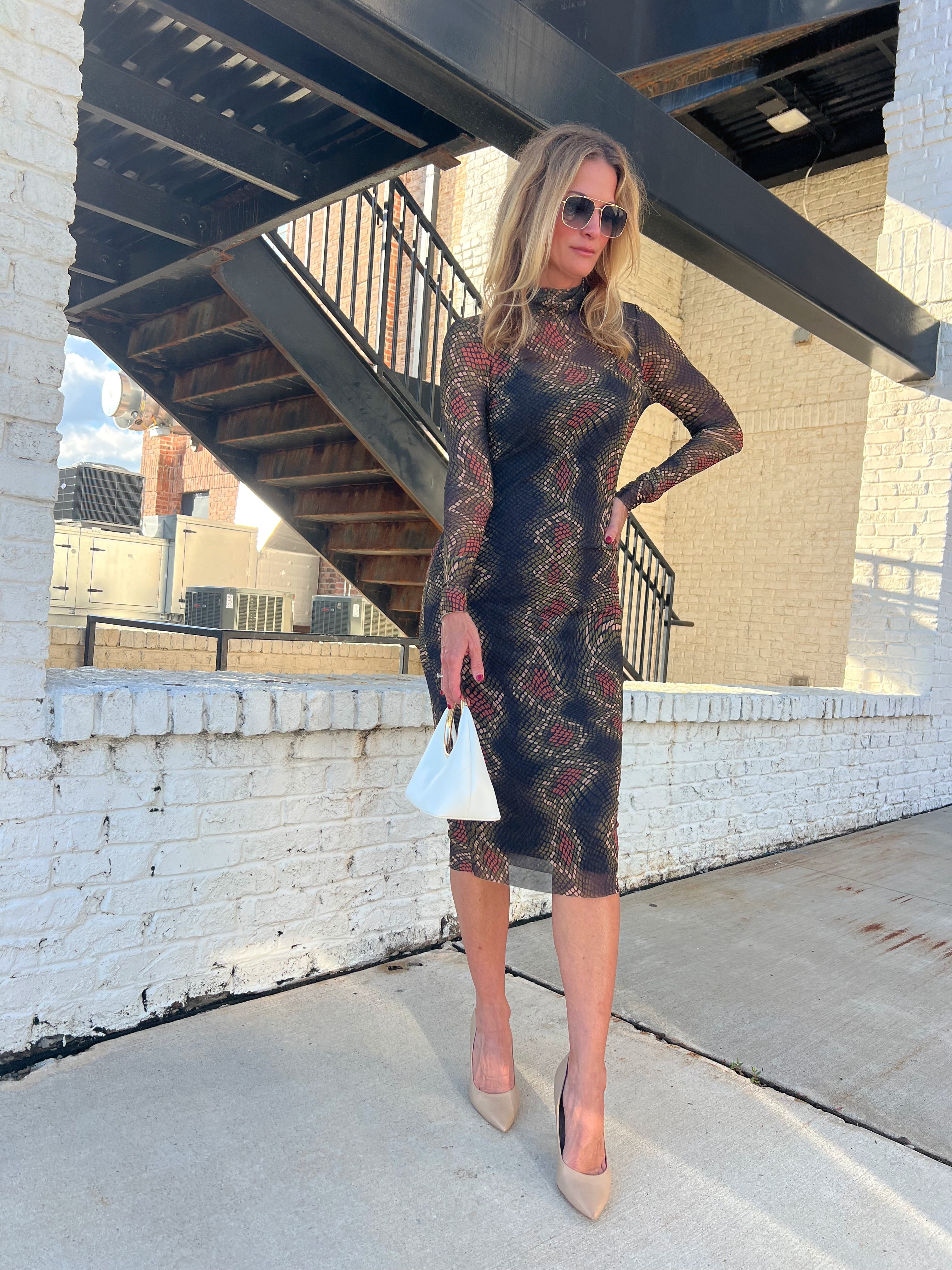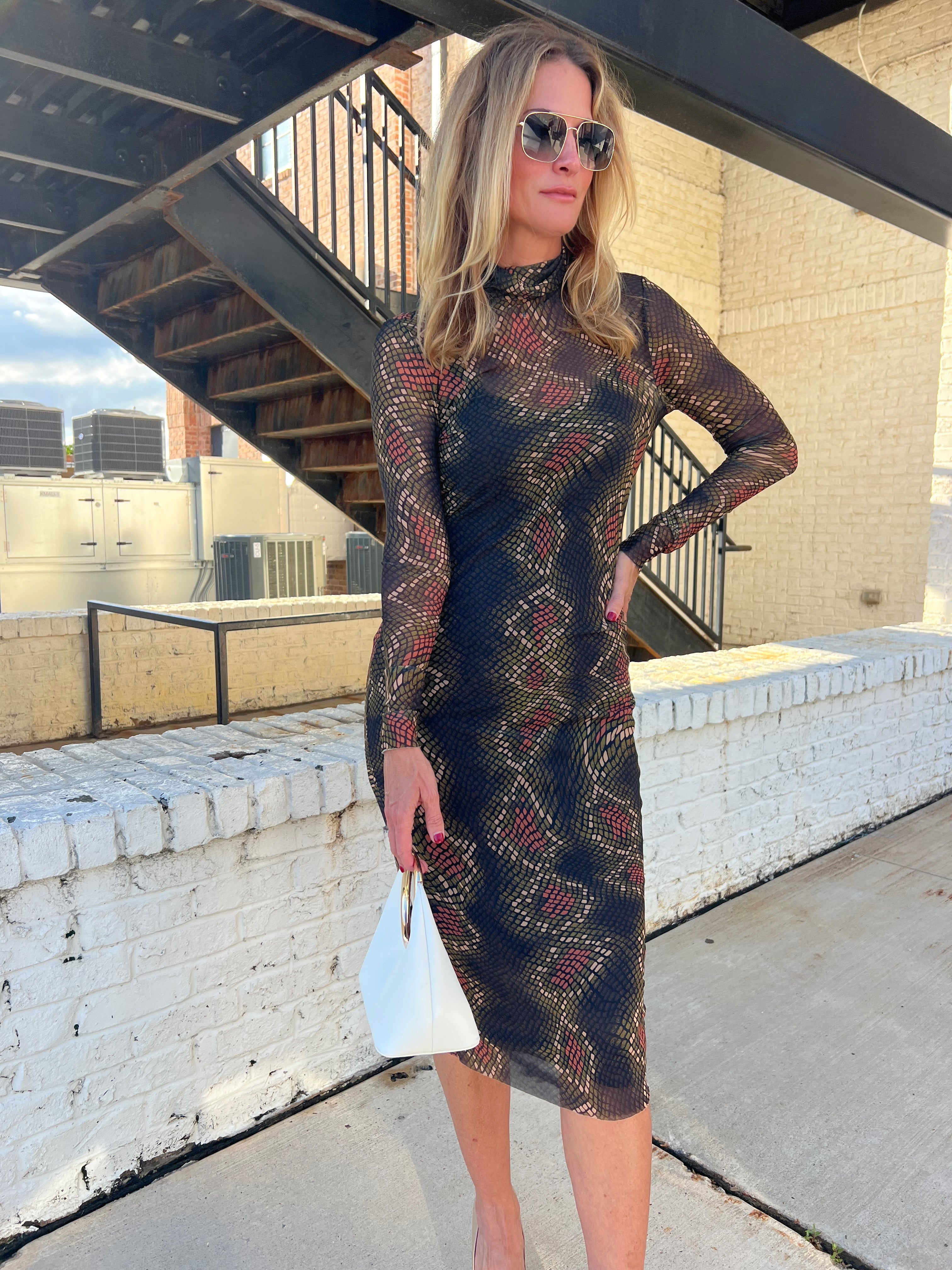 Striking and sophisticated — this Steve Madden metallic mesh midi is made to shine. The figure-hugging silhouette and mock neckline create a sleek, refined look, while the subtle shimmer and abstract print bring a bold, modern edge. Lined through the body for comfort, it’s the perfect mix of classy and cool.
