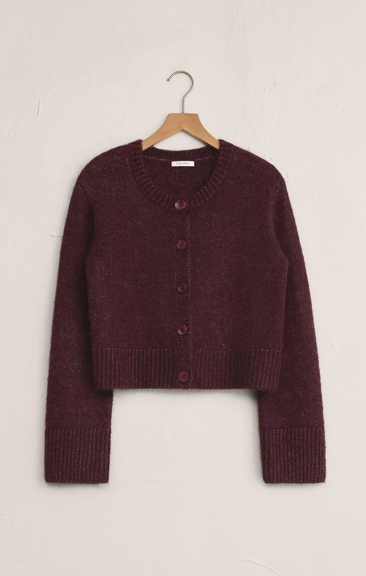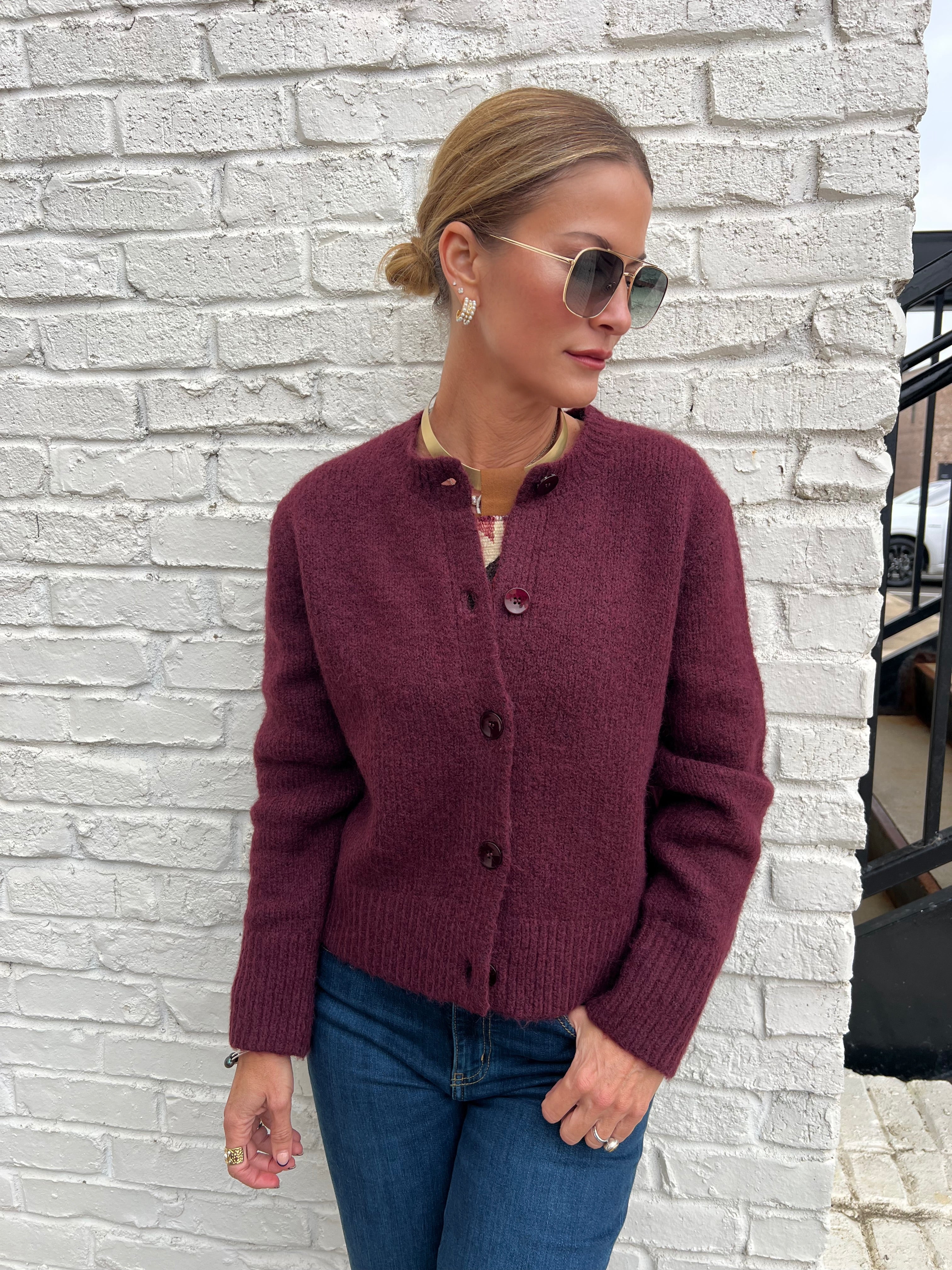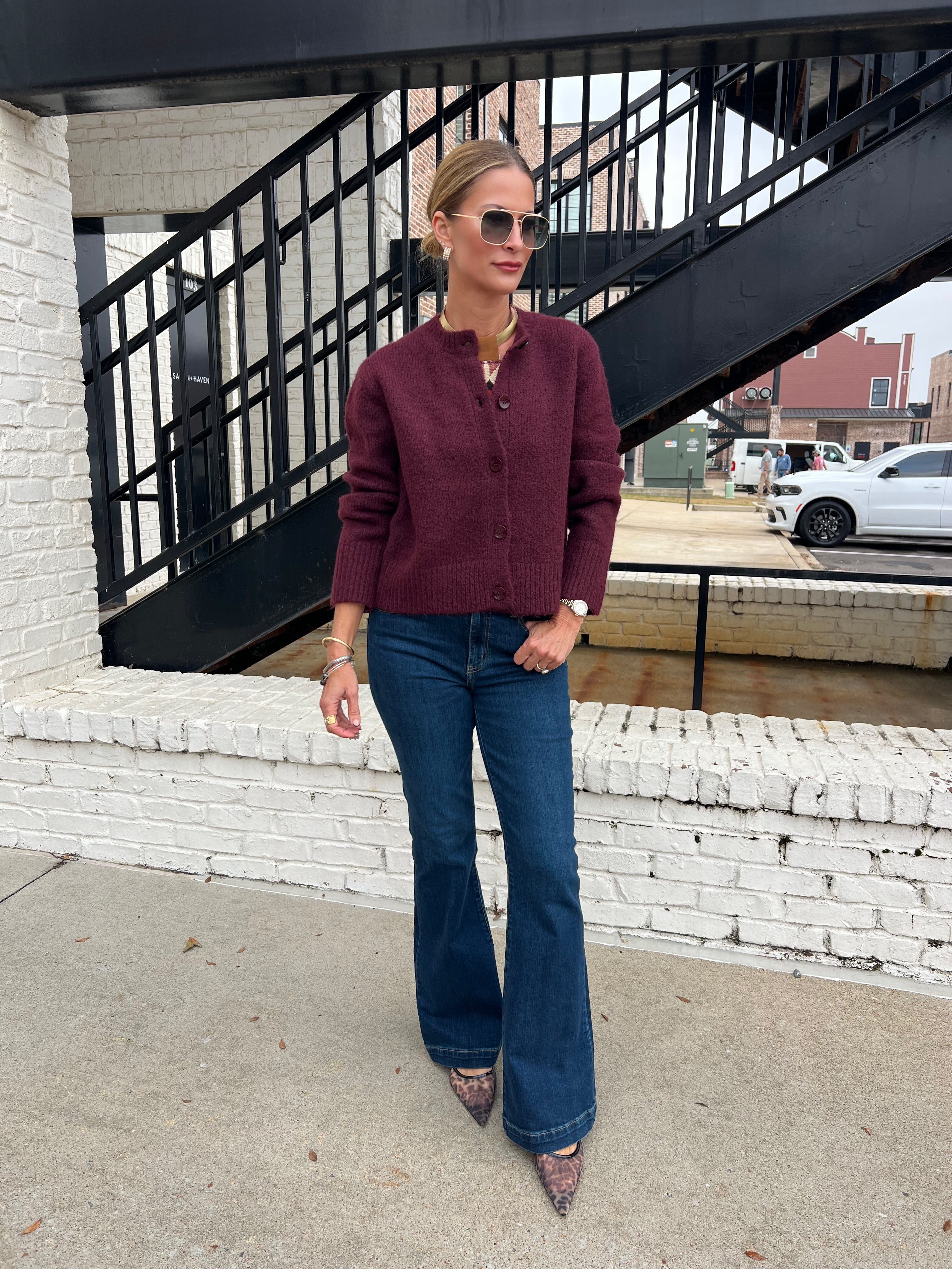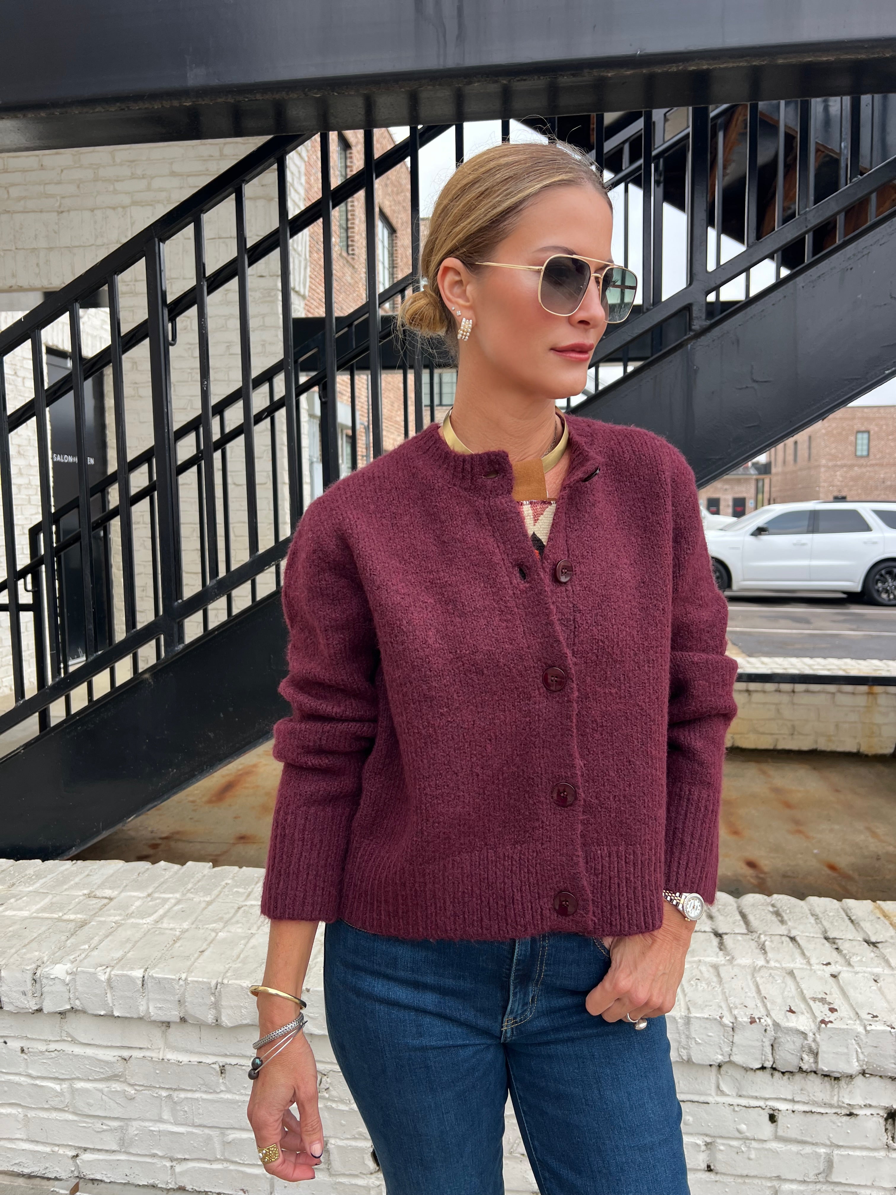 Warm burgundy knits always feel like fall, and this cardigan gives you that cozy, polished look in one easy layer. The soft knit, button-front silhouette, and classic crew neckline make it an elevated staple you can wear open or closed. The length hits just right for pairing with denim, trousers, or your favorite skirt. A timeless closet piece you’ll grab again and again.