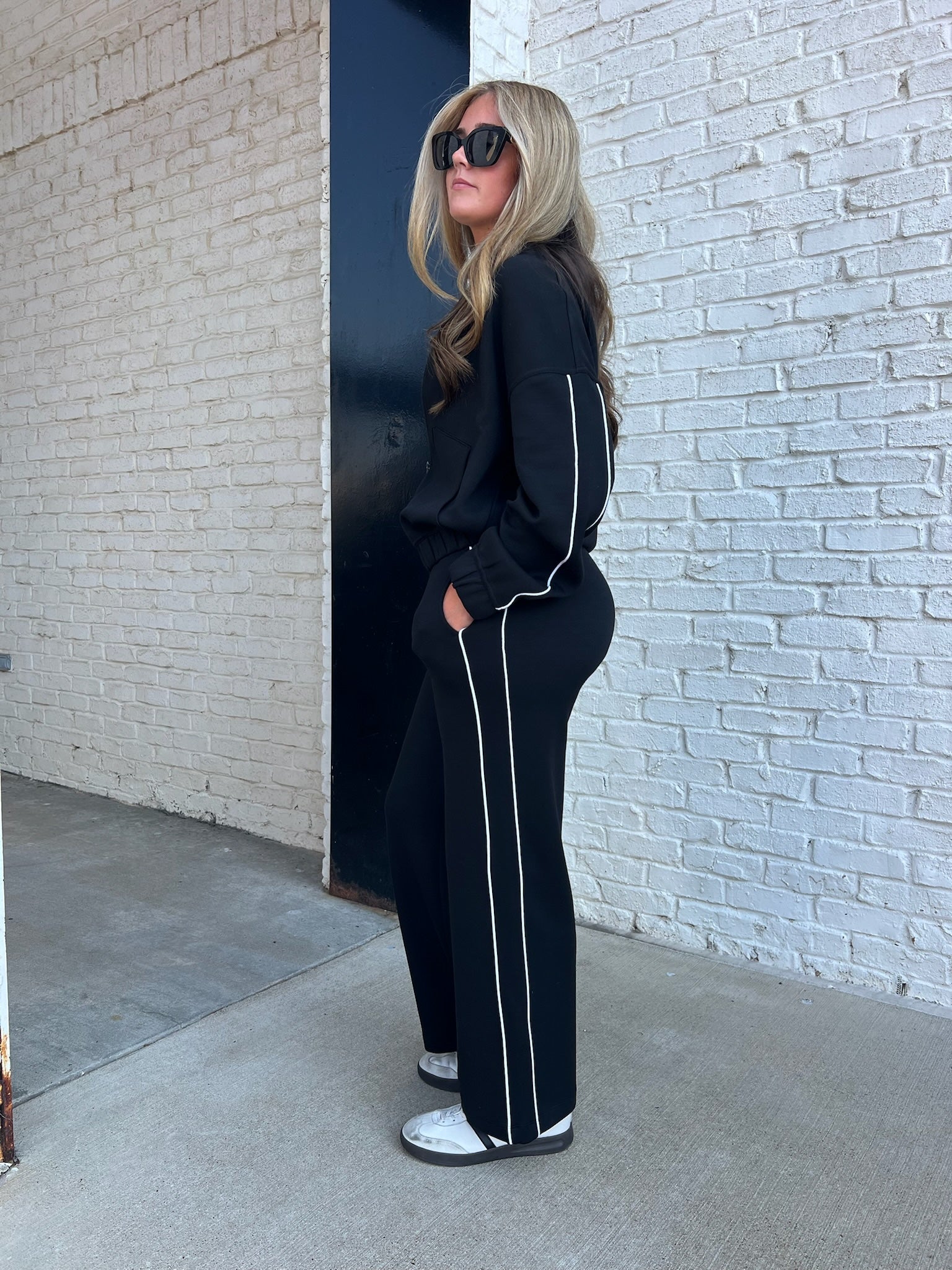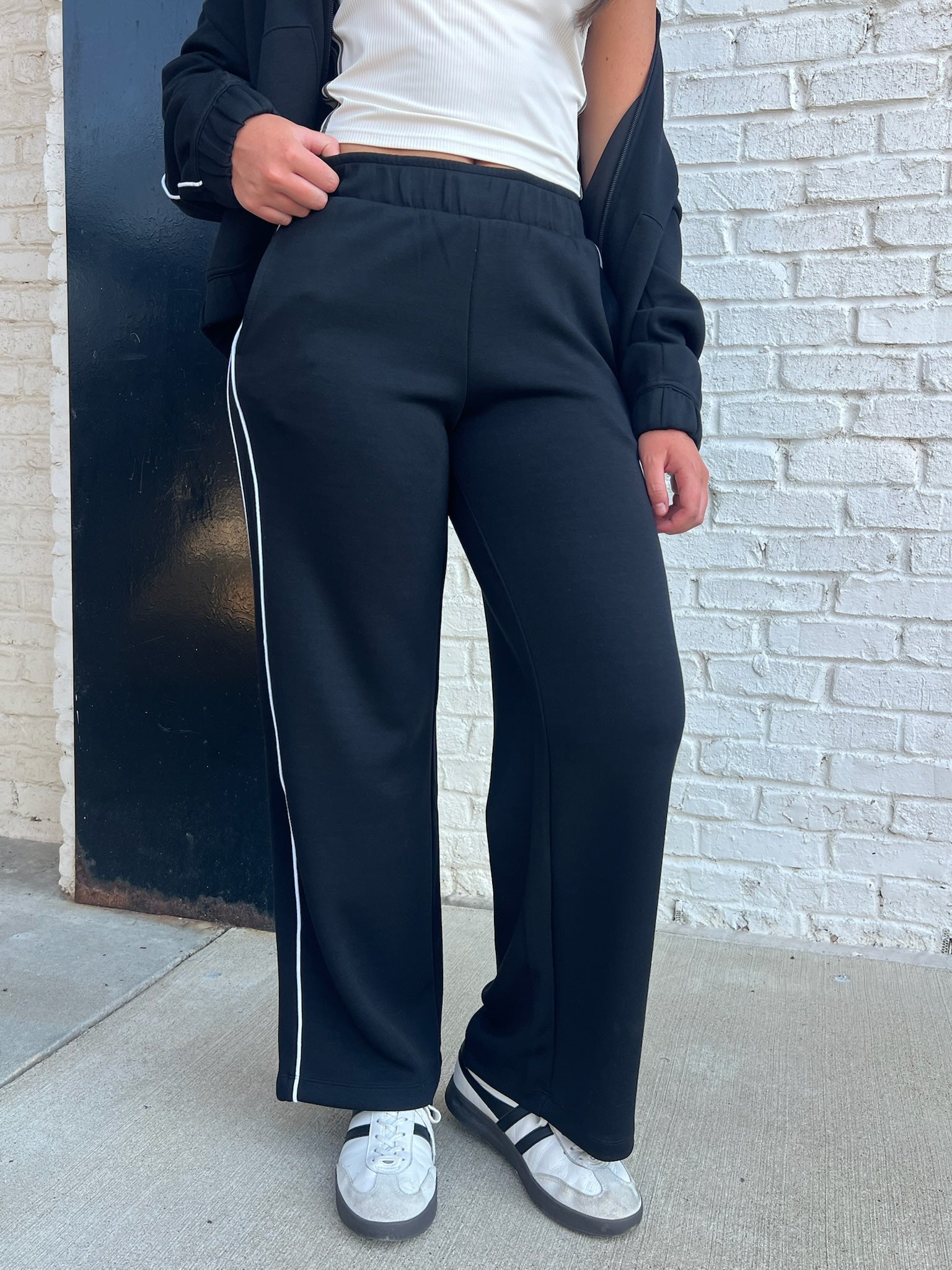 These high-rise straight leg pants are made from buttery soft Luxe Jersey with contrast piping and side pockets. Made to lounge, layer, or take you from slow mornings to post-studio coffee.