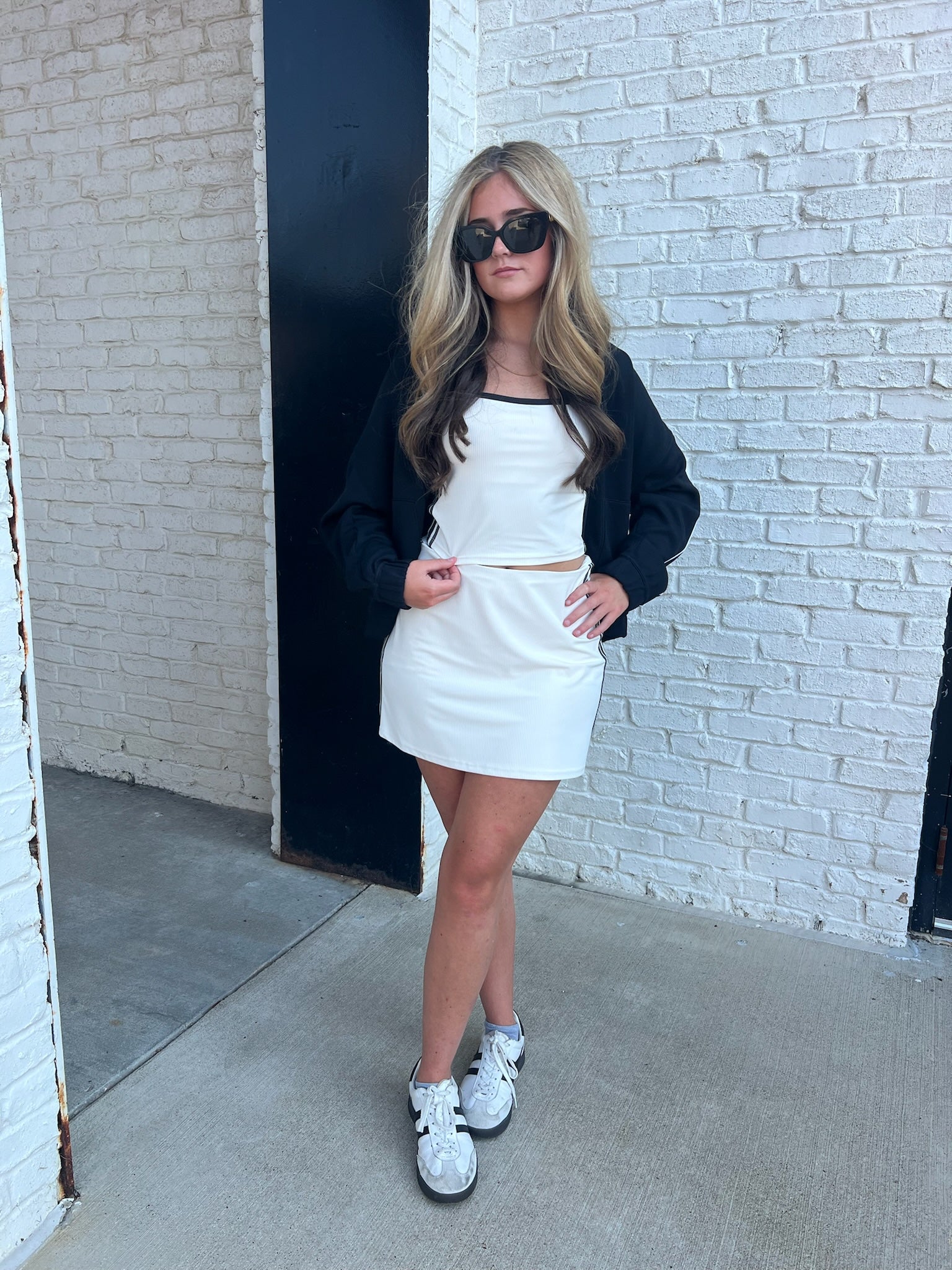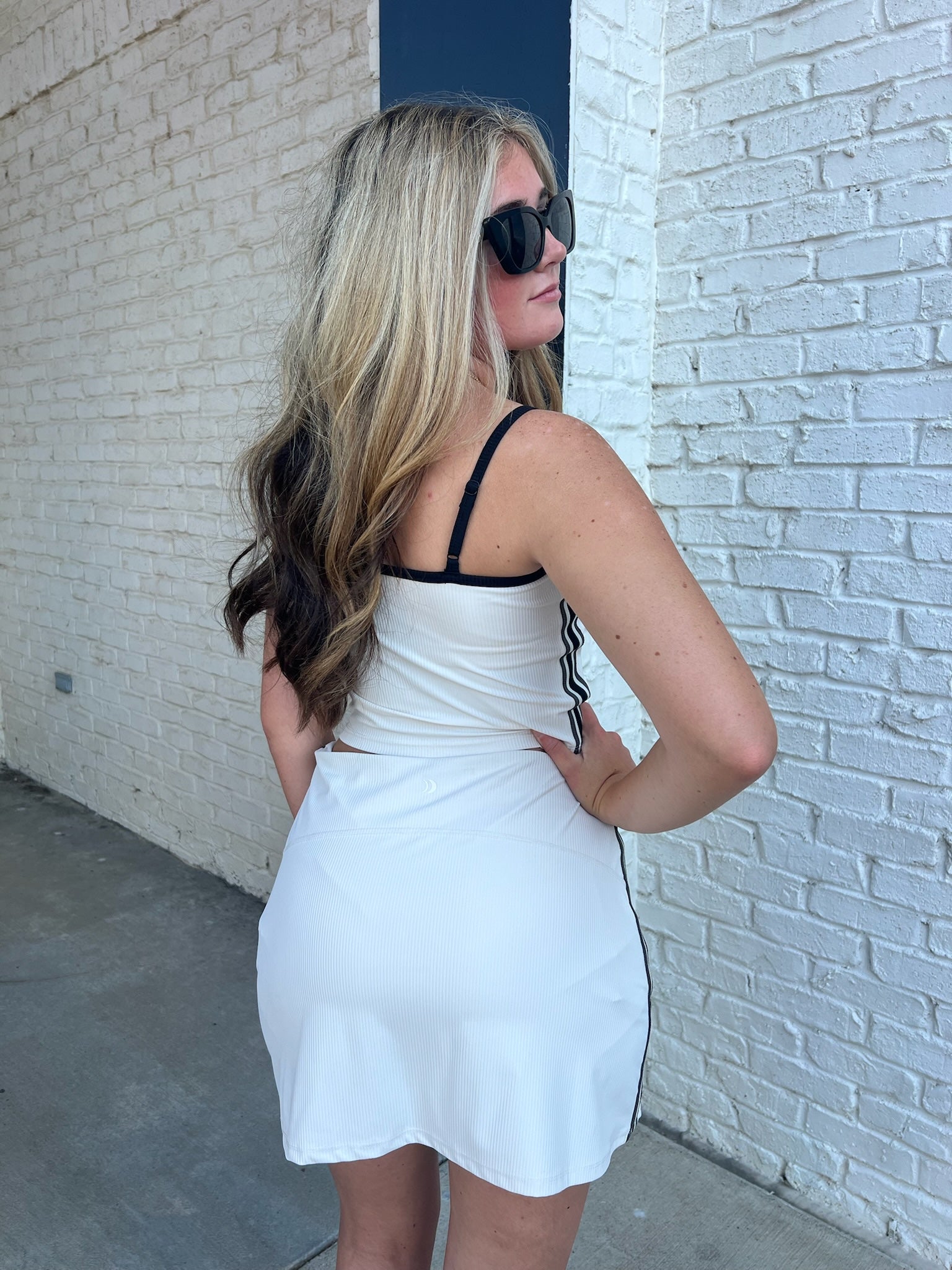 Stretchy, sculpted, and styled with sporty striped taping, this pull-on skort keeps things streamlined with interior pockets and grip-lined shorts. Built for performance and play.