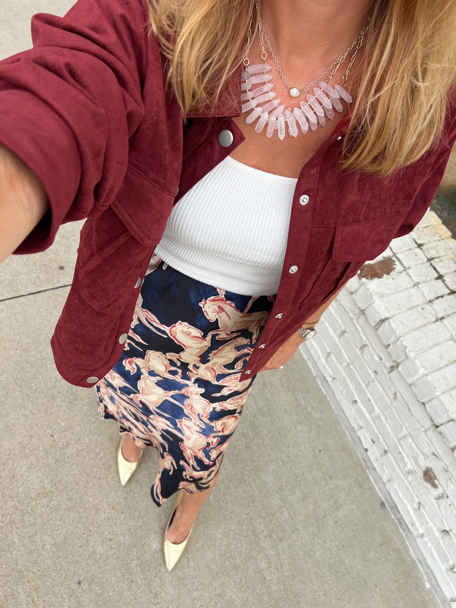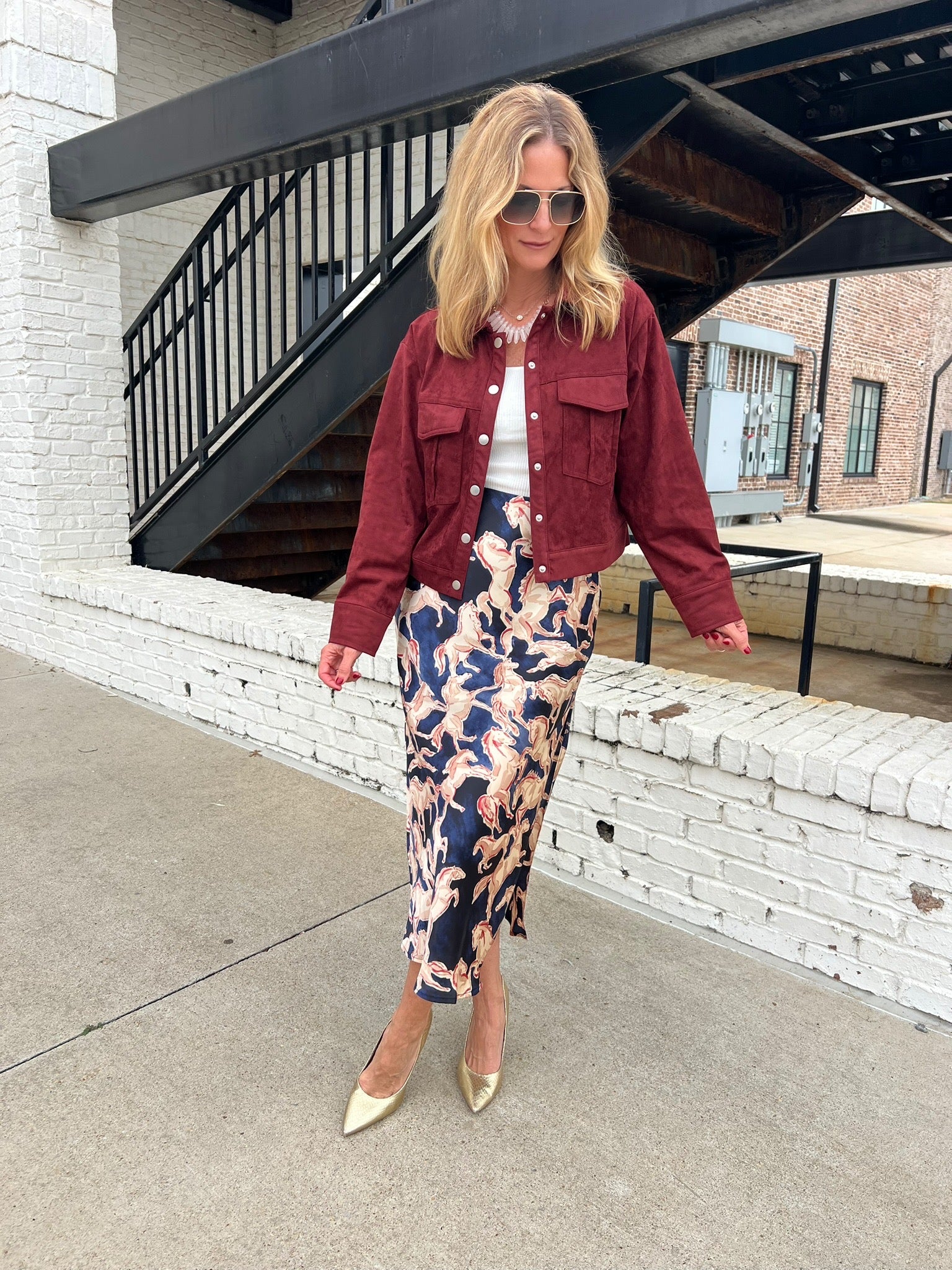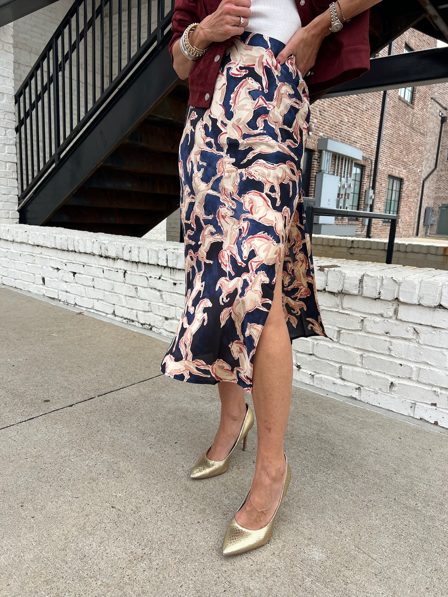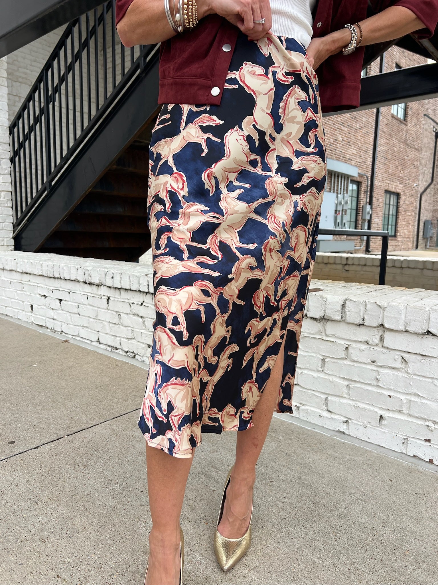 Make a statement with this playful satin midi skirt. Designed with a whimsical horse print in warm neutrals against a navy base, it flows with ease and brings personality to your everyday looks. Pair it with a simple tee for casual charm or dress it up with a blouse and heels for a standout outfit.