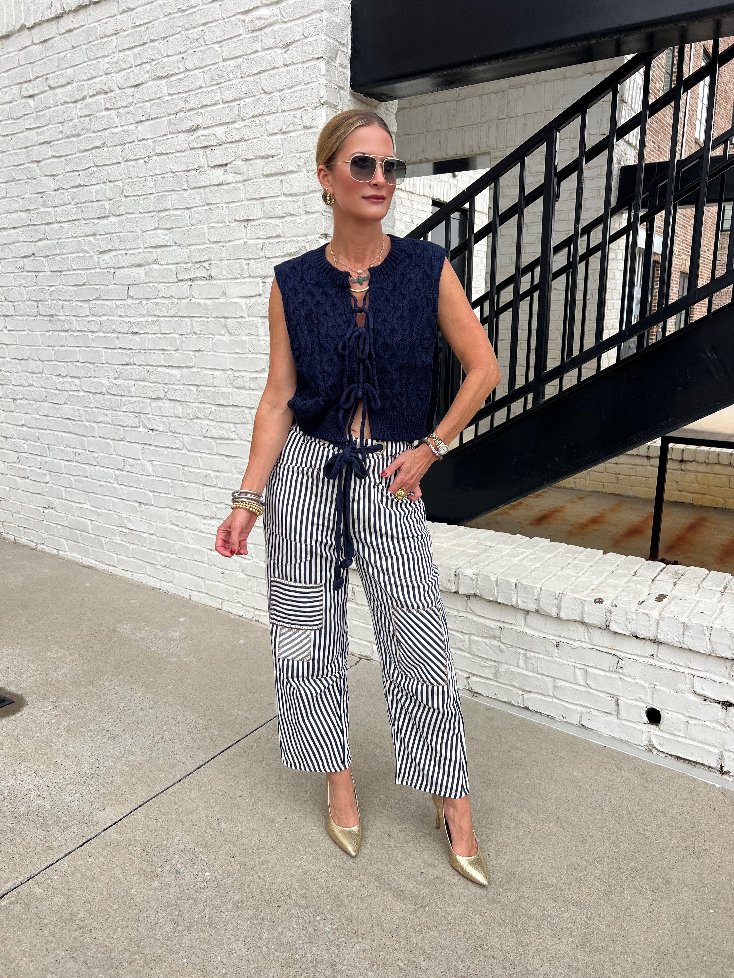 Playful, comfy, and full of personality—these navy-and-white striped wide-leg pants are an instant mood booster. Designed with patch pockets, subtle distressing, and a deep burgundy drawstring waist, they bring laid-back cool with a hint of vintage workwear inspiration. Pair them with a simple tank for off-duty days or add heels and a jacket for a street-chic statement.