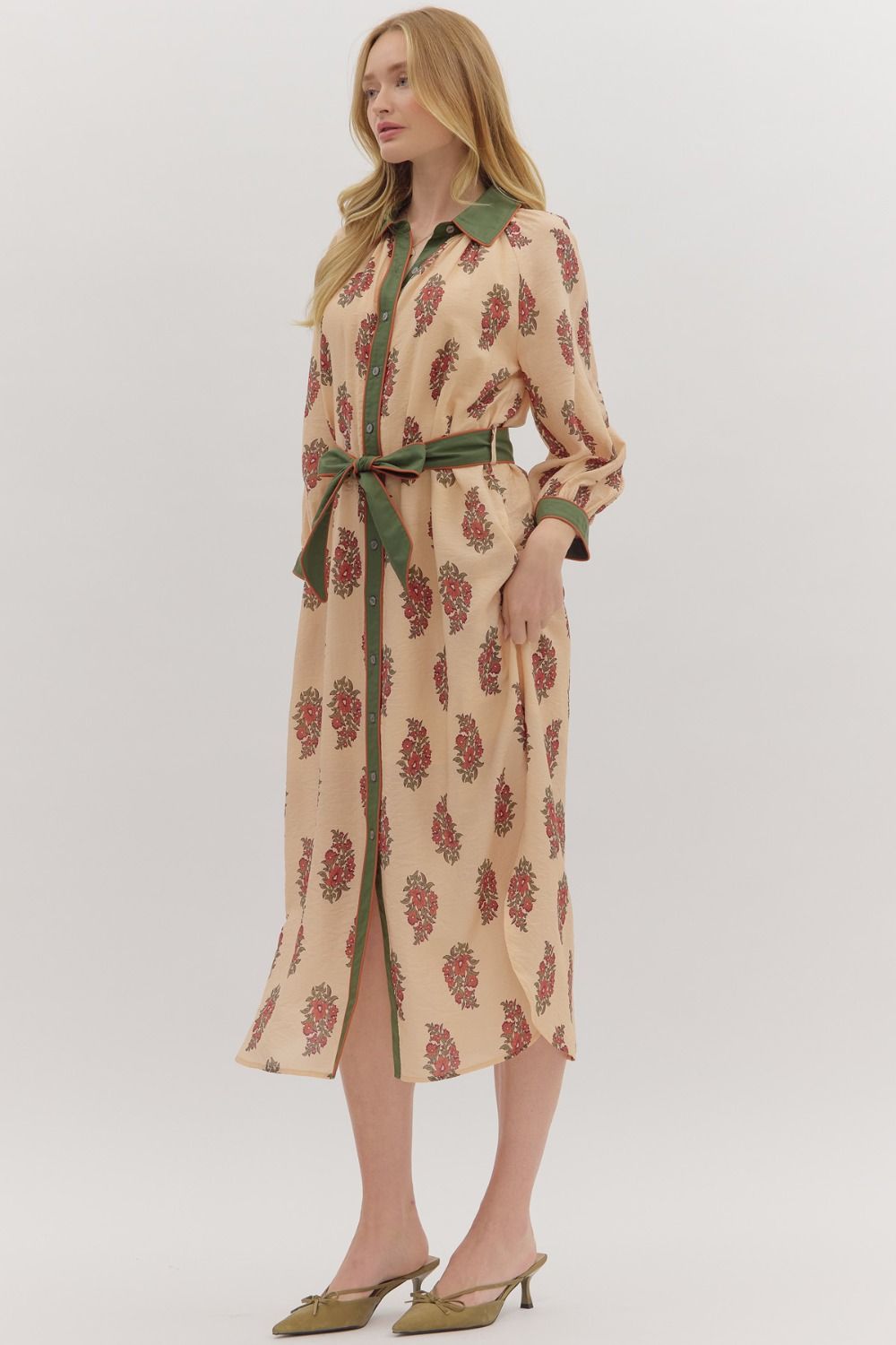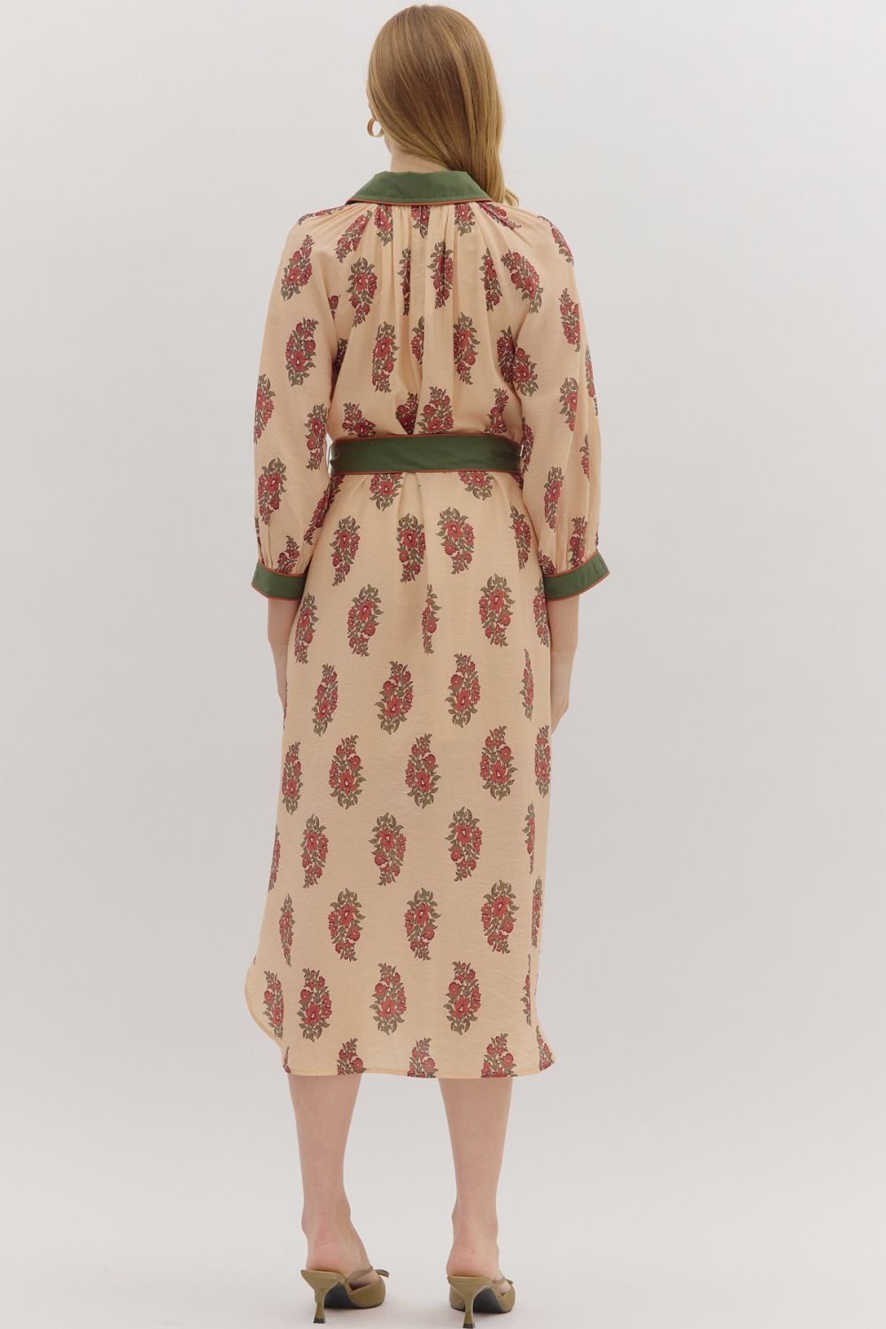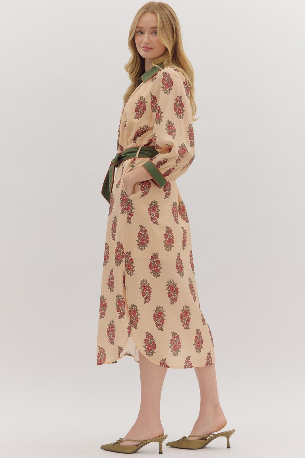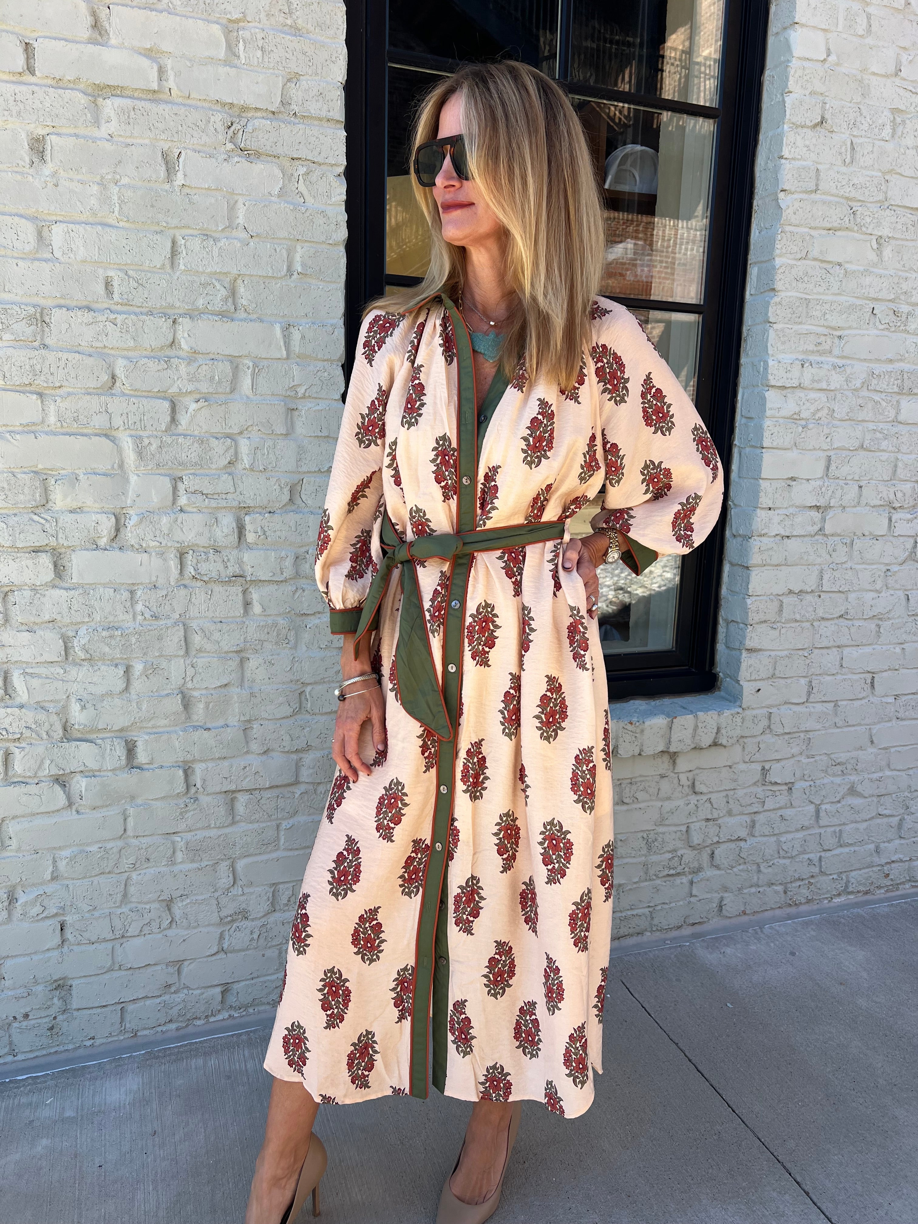 Romantic and refined, the Rosette Garden Dress feels like a breath of fresh air. The cream backdrop lets the floral print bloom beautifully, while the contrast green trim and tie waist bring structure and polish. The billowy sleeves and midi length add a touch of drama in the best way.