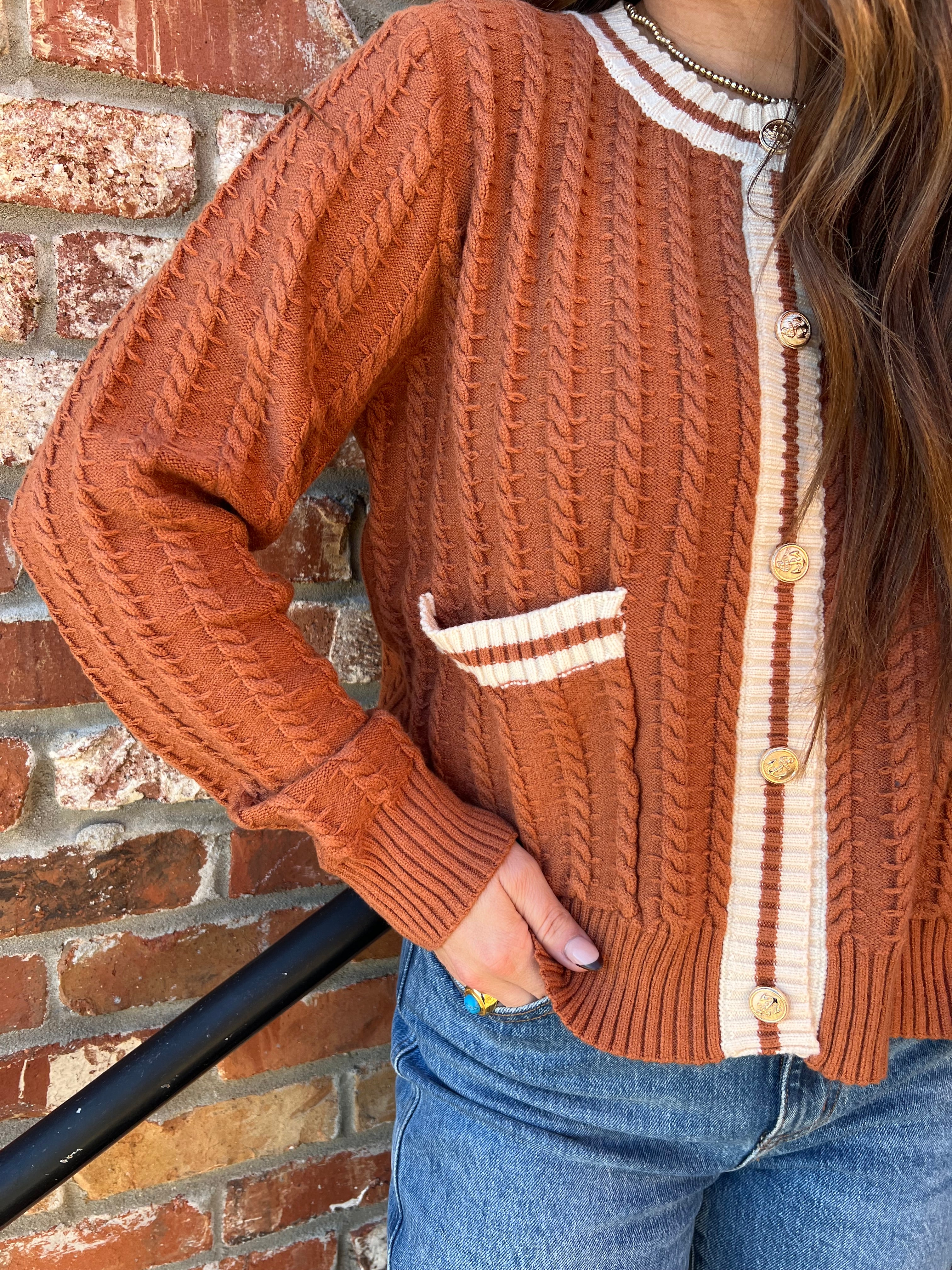 A little vintage, a little modern, and completely cozy. The Hazel Knit Cardigan features a rich rust hue with cream contrast trim, textured cable knit, and gold buttons that add just the right amount of polish. The cropped fit makes it easy to style—layer it over a tee, or button it up and wear it on its own.