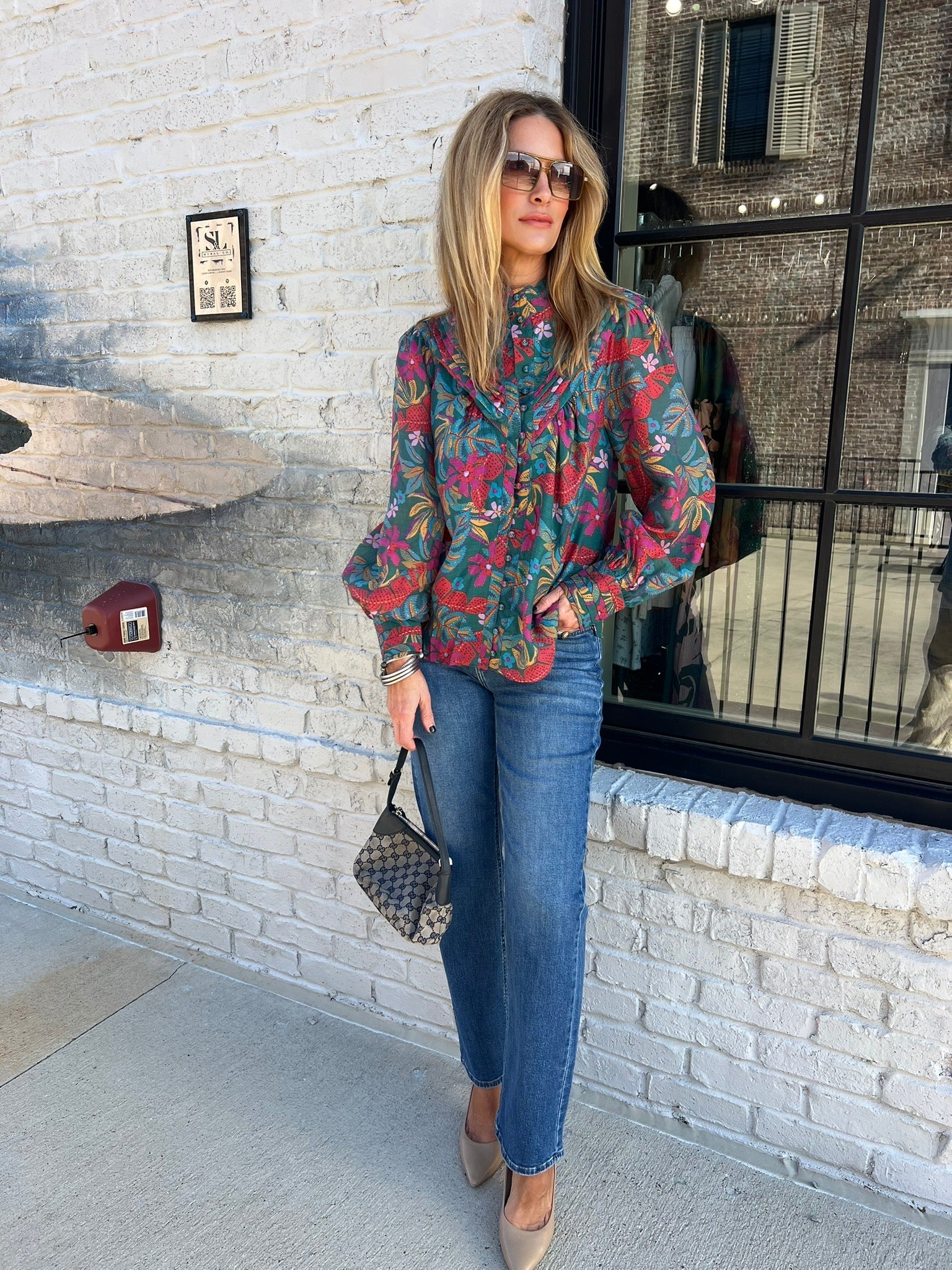 Rich in color and detail, this patterned blouse is a true statement piece that still feels wearable. Designed with a high neckline, covered button front, and softly structured shoulders, it has a polished silhouette balanced by fluid movement through the body. The vibrant floral print mixes deep teal, pink, and warm tones for a layered, dimensional look that feels elevated but not overwhelming. Finished with cuffed sleeves for a tailored touch.
