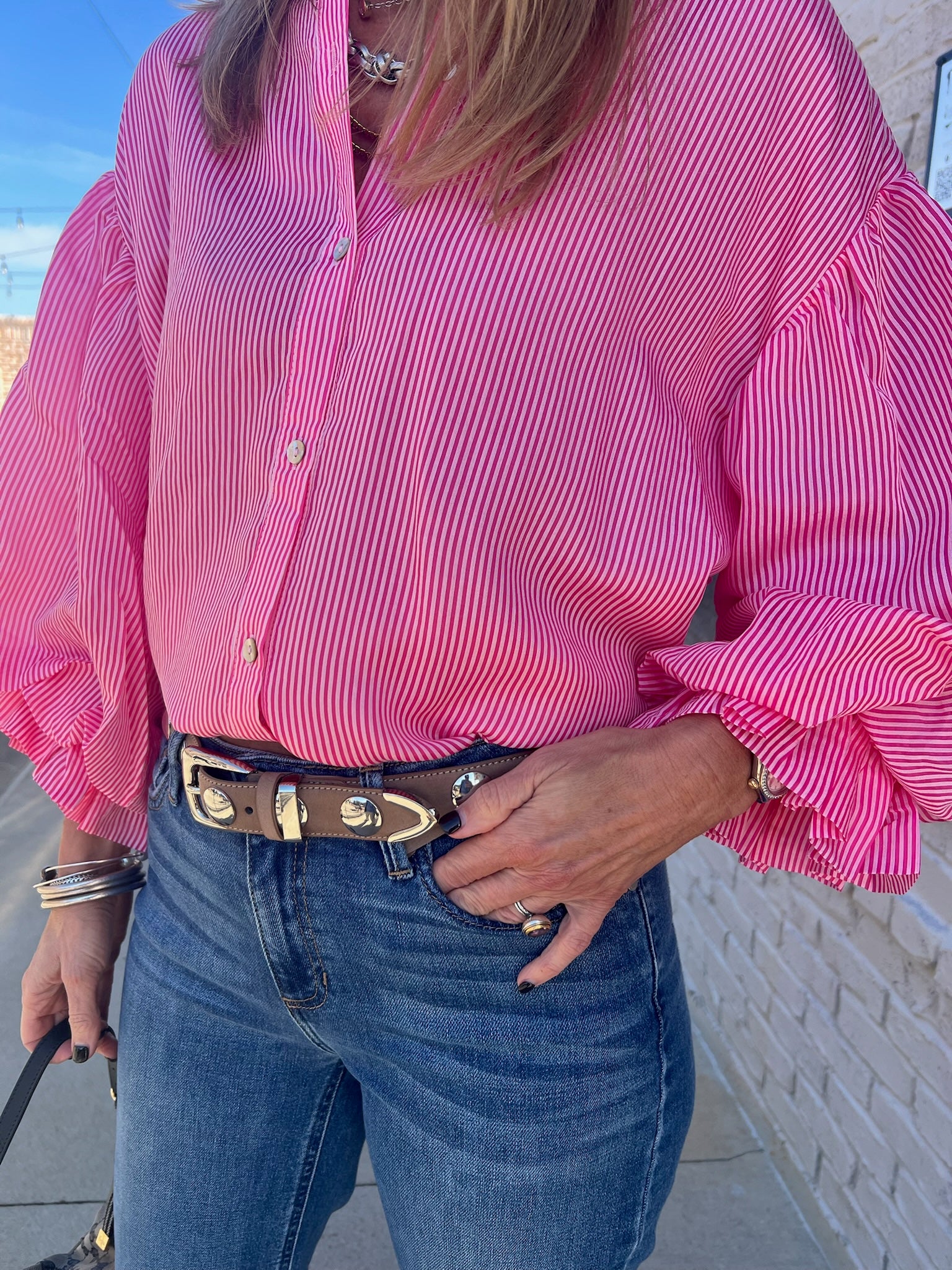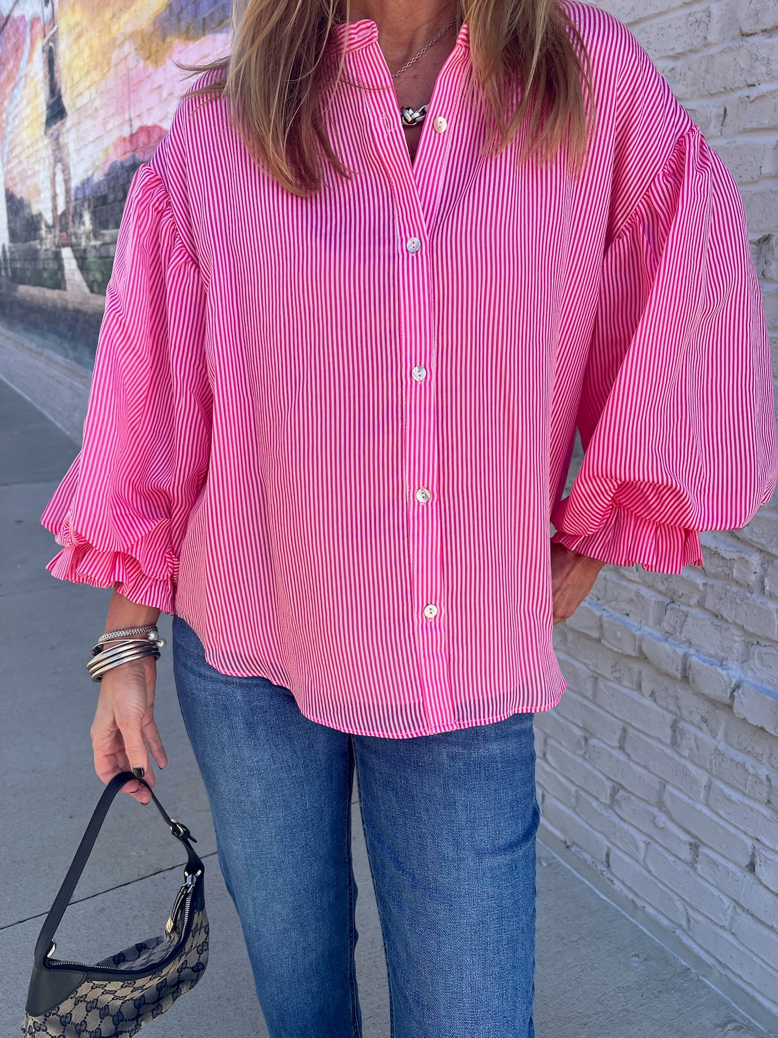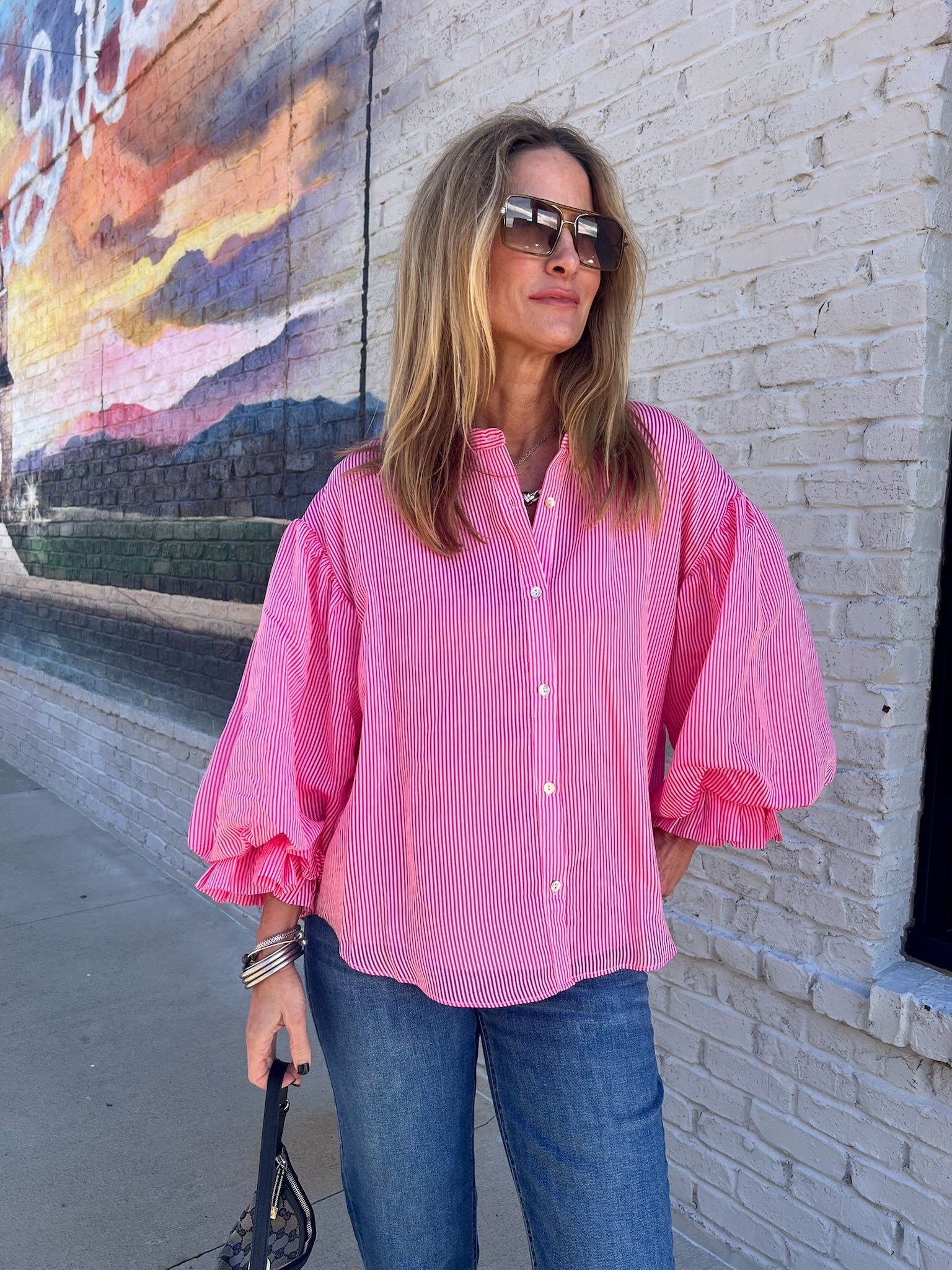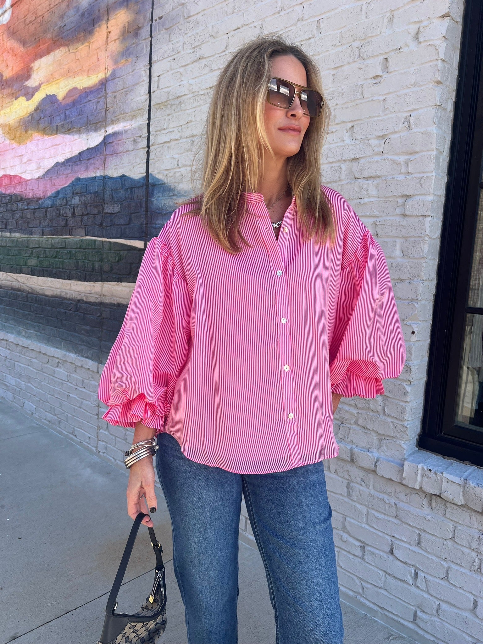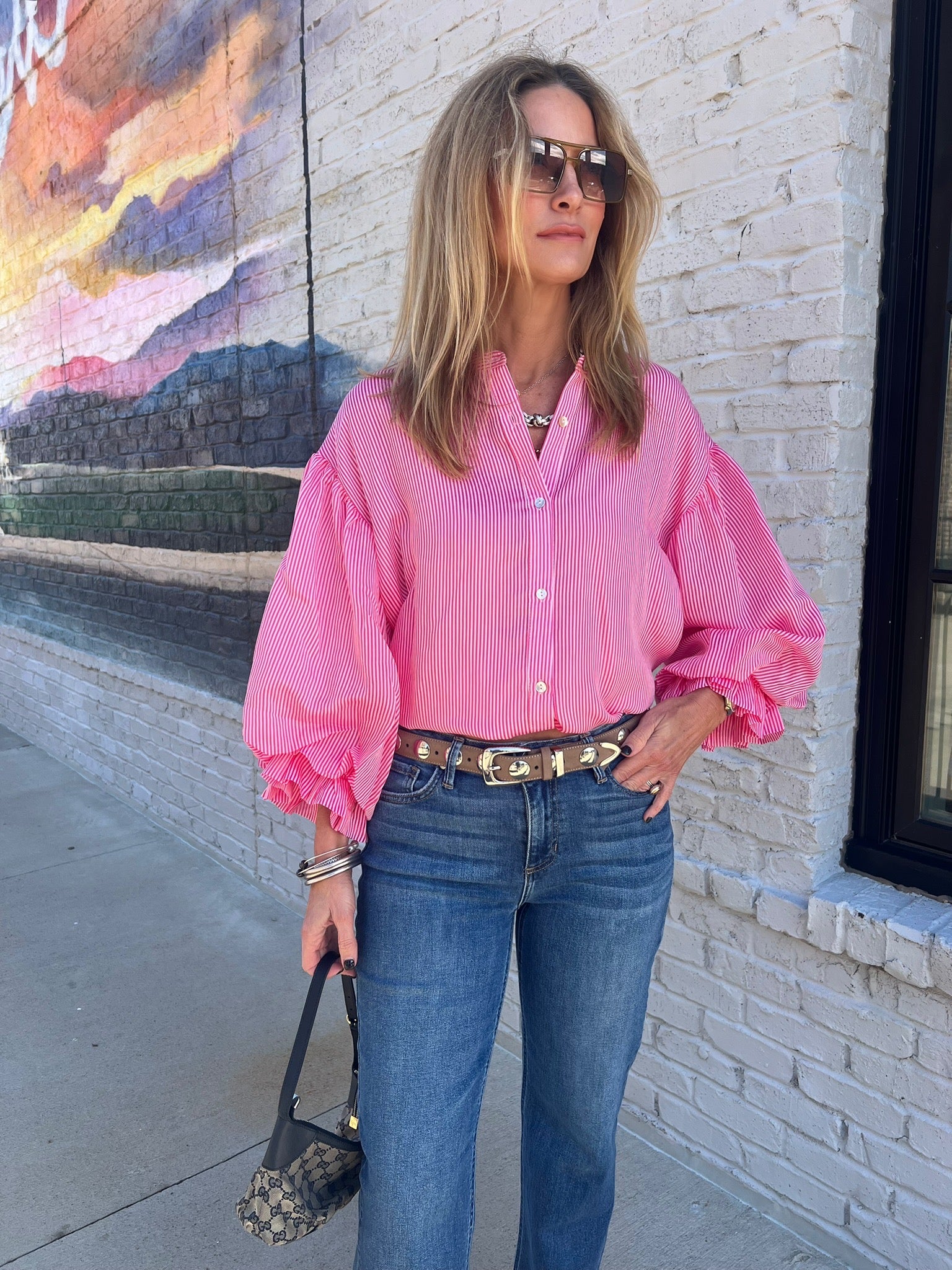 This blouse features a soft pink pinstripe with a relaxed, easy silhouette that feels both classic and fresh. The subtle volume in the sleeves adds just enough interest, while the button-front design keeps it clean and wearable. Lightweight and breathable, it drapes beautifully without feeling fussy, making it an easy choice for everyday styling.