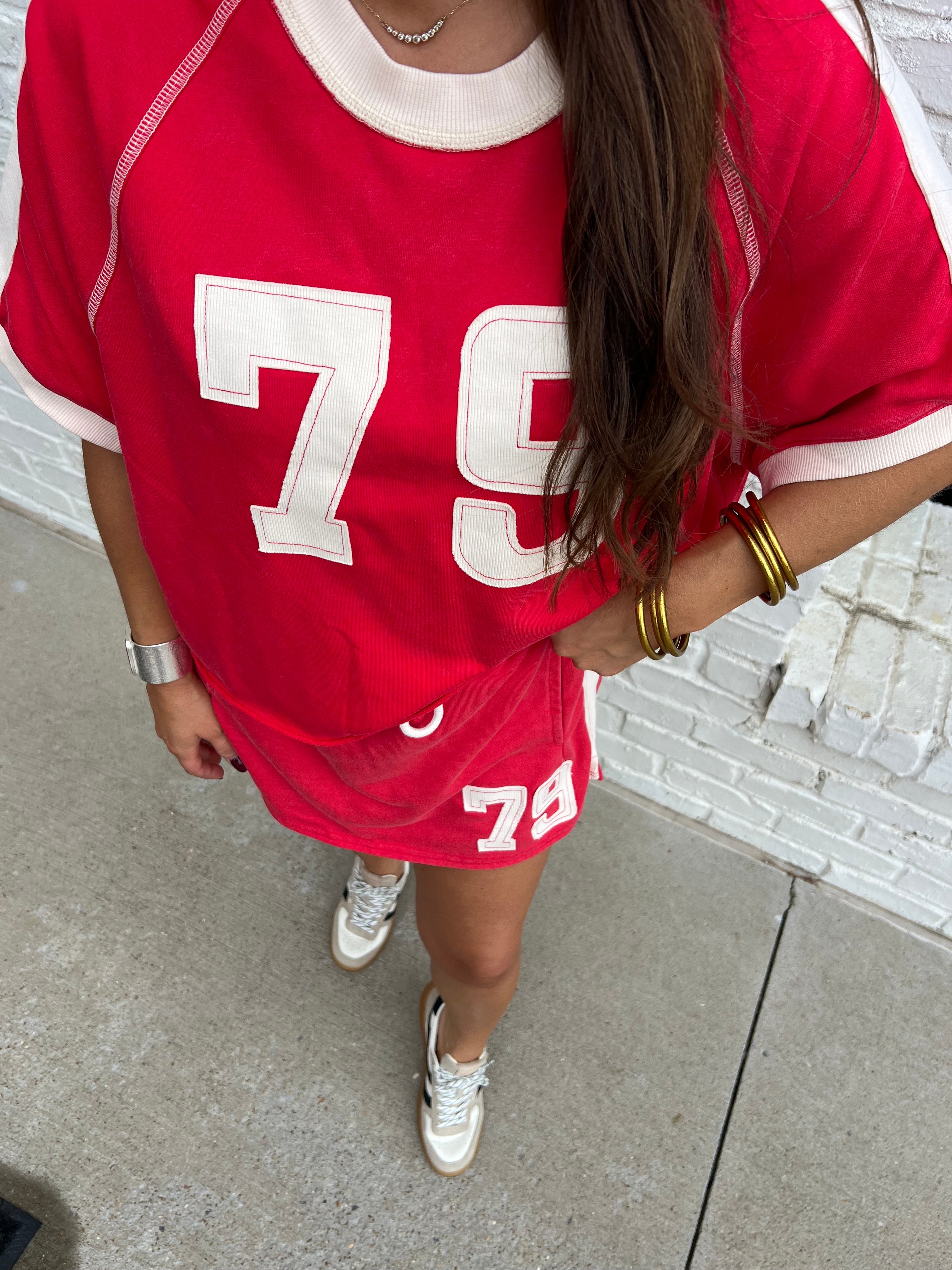 Game day vibes, every day. This washed red set brings the perfect mix of casual and cool with its oversized jersey-style top and matching skirt. Both pieces feature bold varsity-inspired “79” appliqué details and contrast stripe trim for that lived-in, vintage feel. The skirt’s drawstring waist keeps it comfy, while the relaxed fit tee makes it easy to wear together or separately. Throw on sneakers for a laid-back day look or style it up with chunky gold accessories to make it street-style chic.