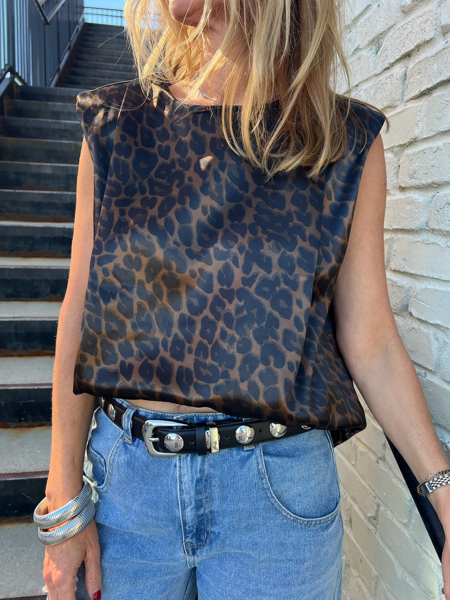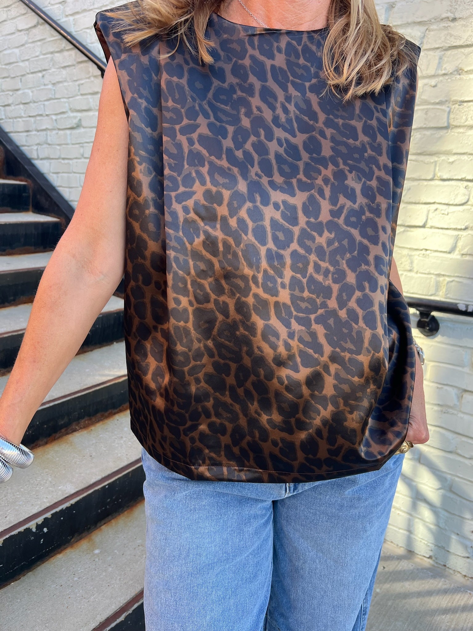 Fierce meets refined in the Mya Top. With a silky sheen and structured silhouette, this sleeveless design drapes effortlessly for a polished, statement-making look. The mocha and black leopard print gives just the right amount of edge—perfect for pairing with denim by day or leather pants by night.