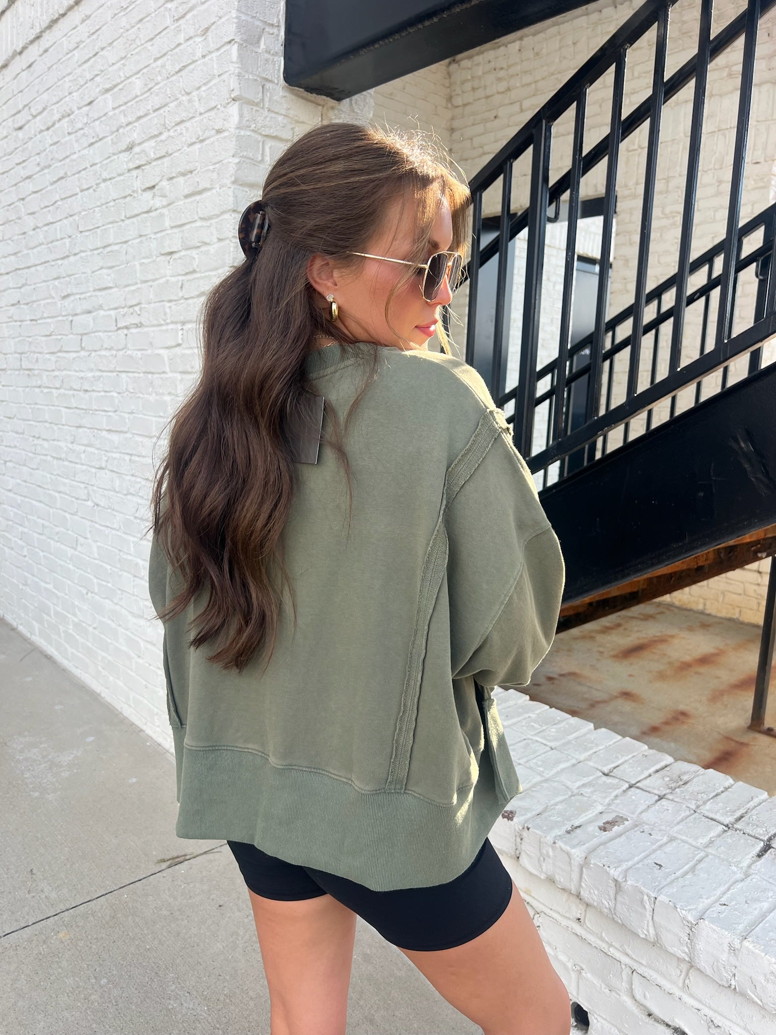 Meet your new off-duty uniform. This washed olive sweatshirt is the perfect blend of relaxed and refined—made for laid-back days that still call for style. Designed with an oversized fit, raw-edge seam detailing at the shoulders, and a wide ribbed hem, it brings that effortlessly cool, slightly lived-in look you’ll reach for again and again.