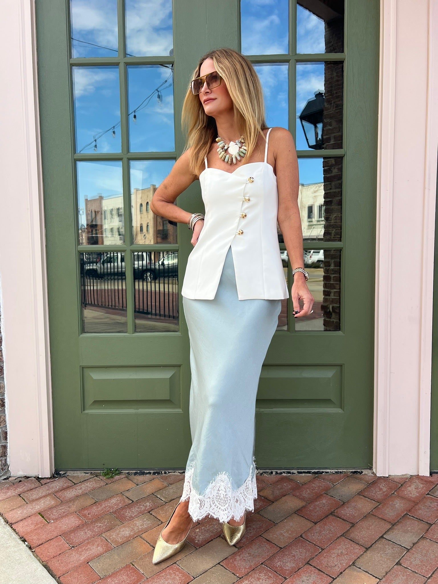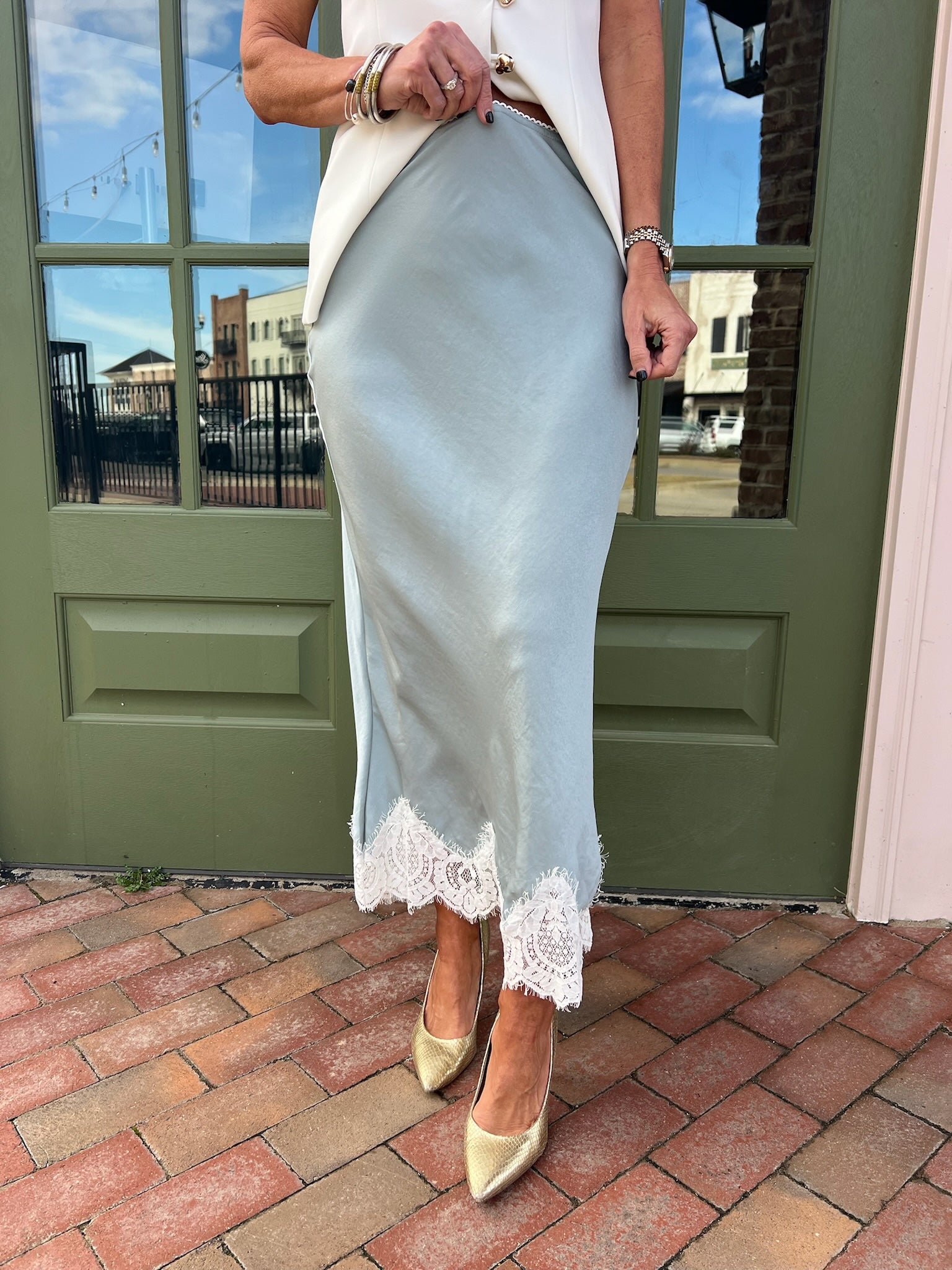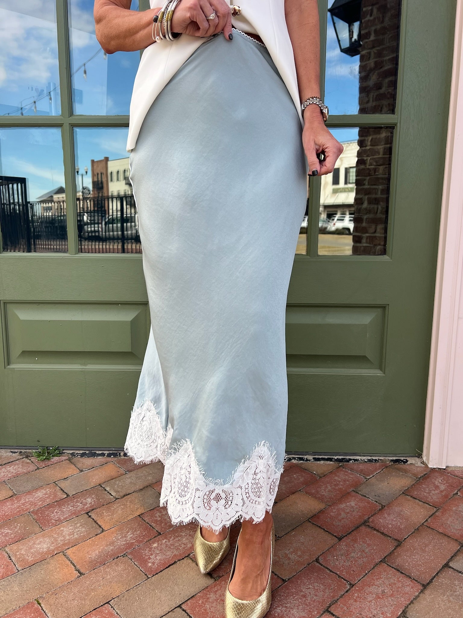 This skirt features a smooth, fluid fabric with a clean silhouette that skims the body without feeling restrictive. The lace-trimmed hem adds just the right amount of romance, giving it a refined finish that elevates even the simplest outfit. Easy pull-on styling keeps it comfortable, while the length and drape make it feel polished and intentional.