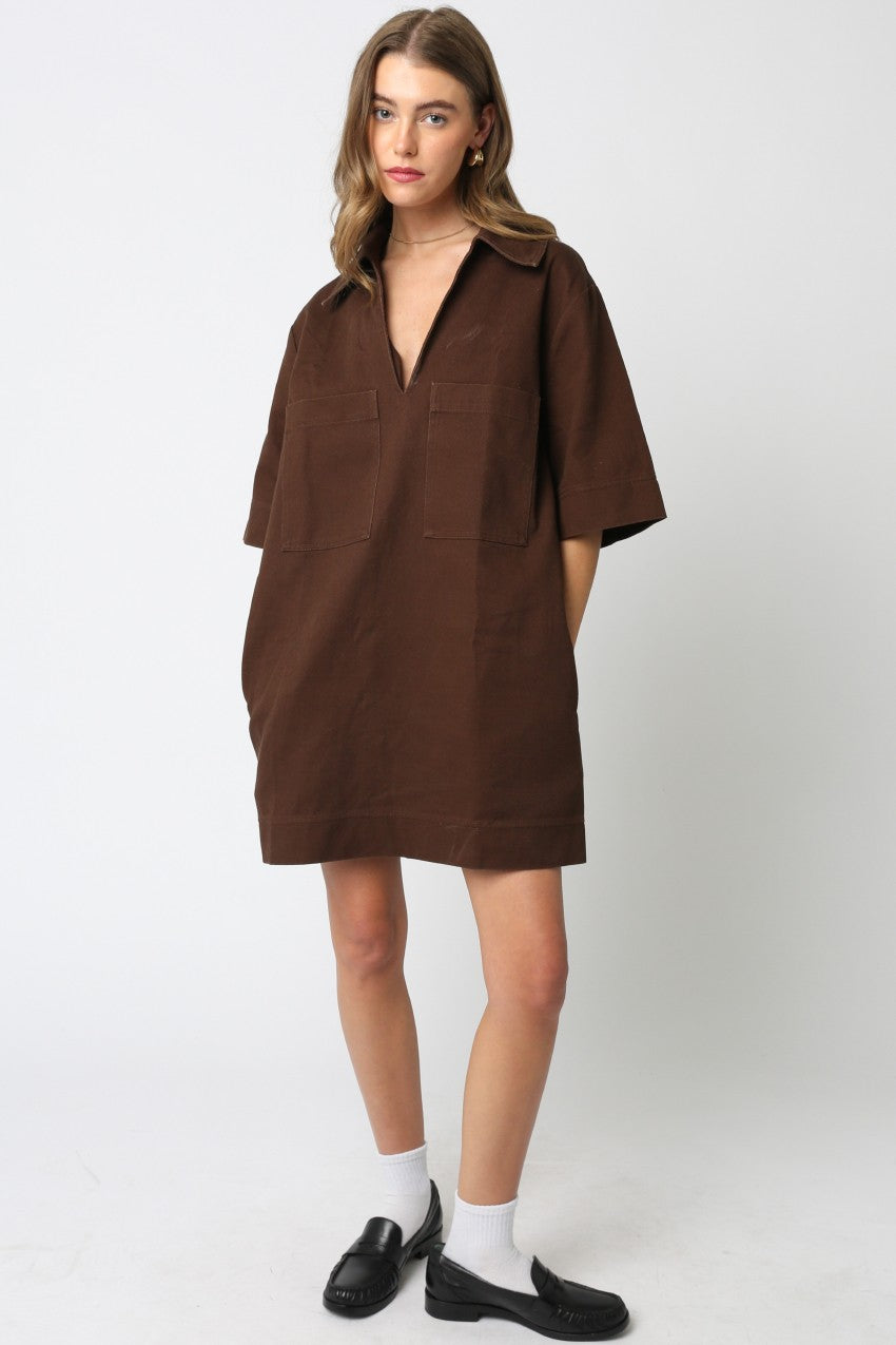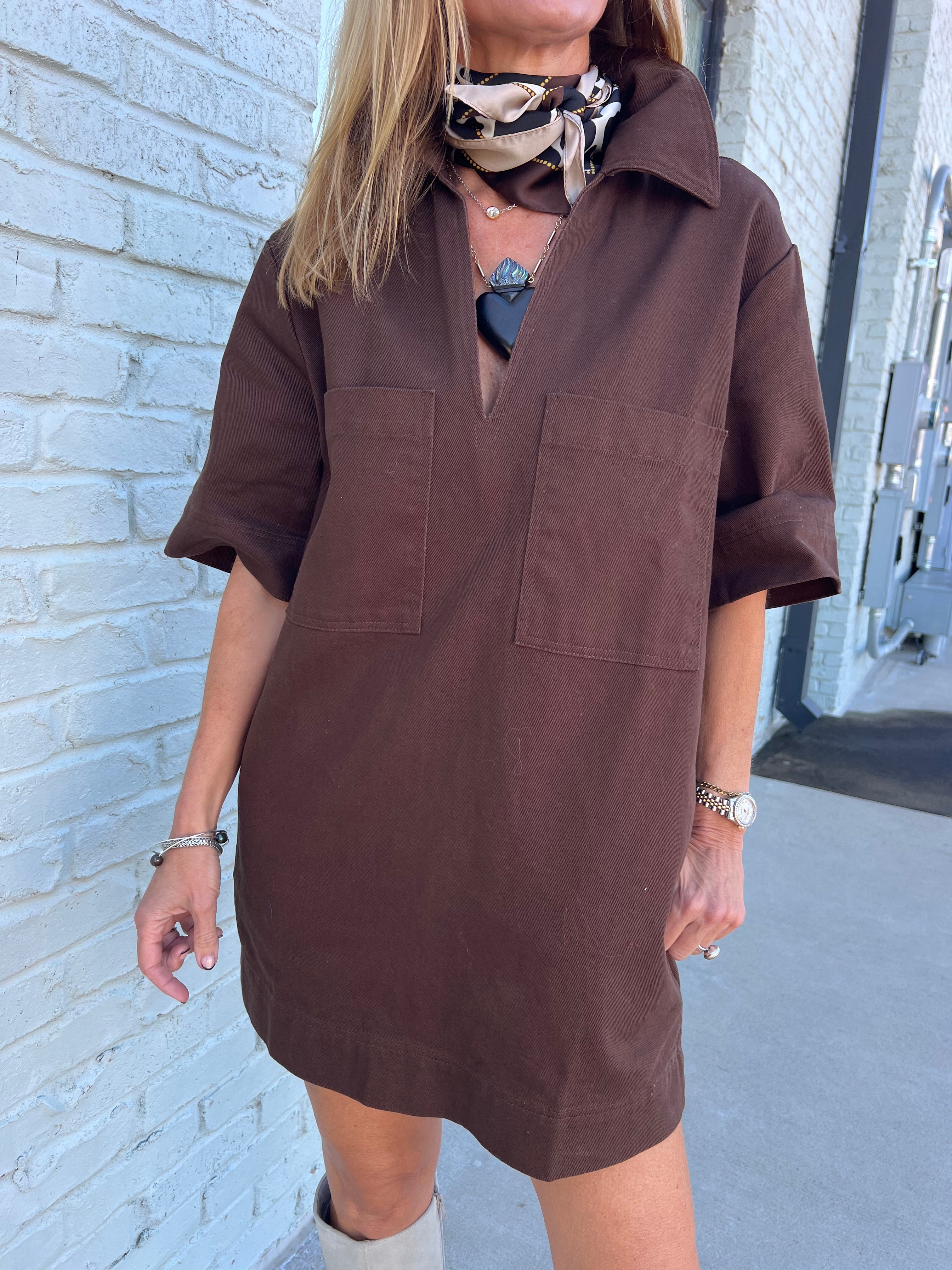 Simple, structured, and undeniably chic. The Mocha Pocket Shift Dress brings effortless style to cooler days with its soft cotton feel, oversized front pockets, and modern V neckline. The rich chocolate tone pairs beautifully with neutrals, while the relaxed silhouette keeps it easy and comfortable.
