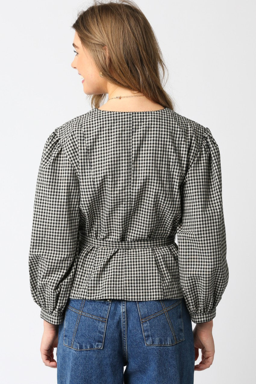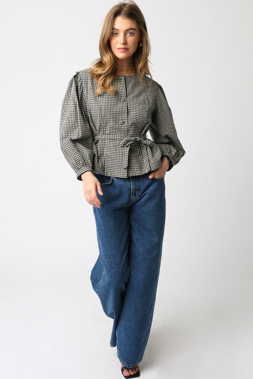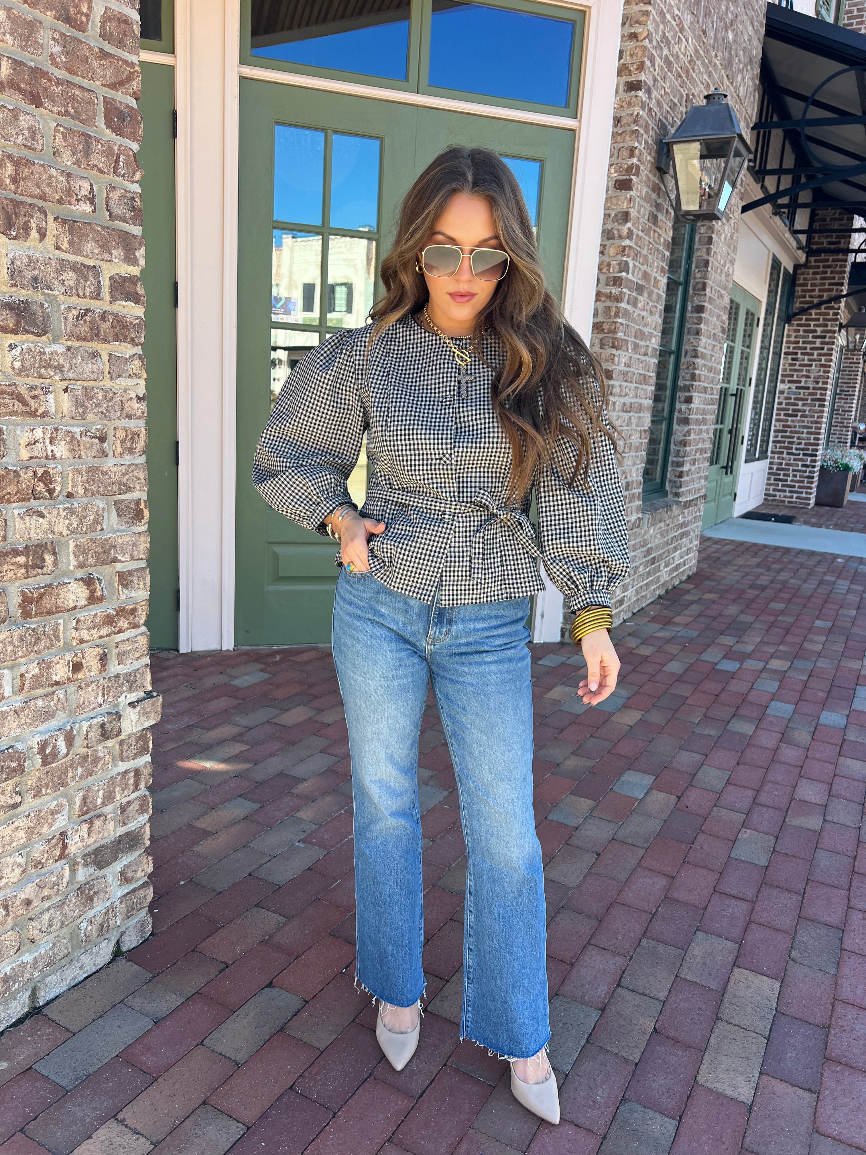 Timeless, tailored, and just a little playful. The Harper Gingham Blouse features a classic black-and-ivory check pattern with puff sleeves and a flattering tie waist that creates the perfect feminine shape. The structured button-down style gives it that polished finish, while the subtle texture keeps it cozy for cooler days.