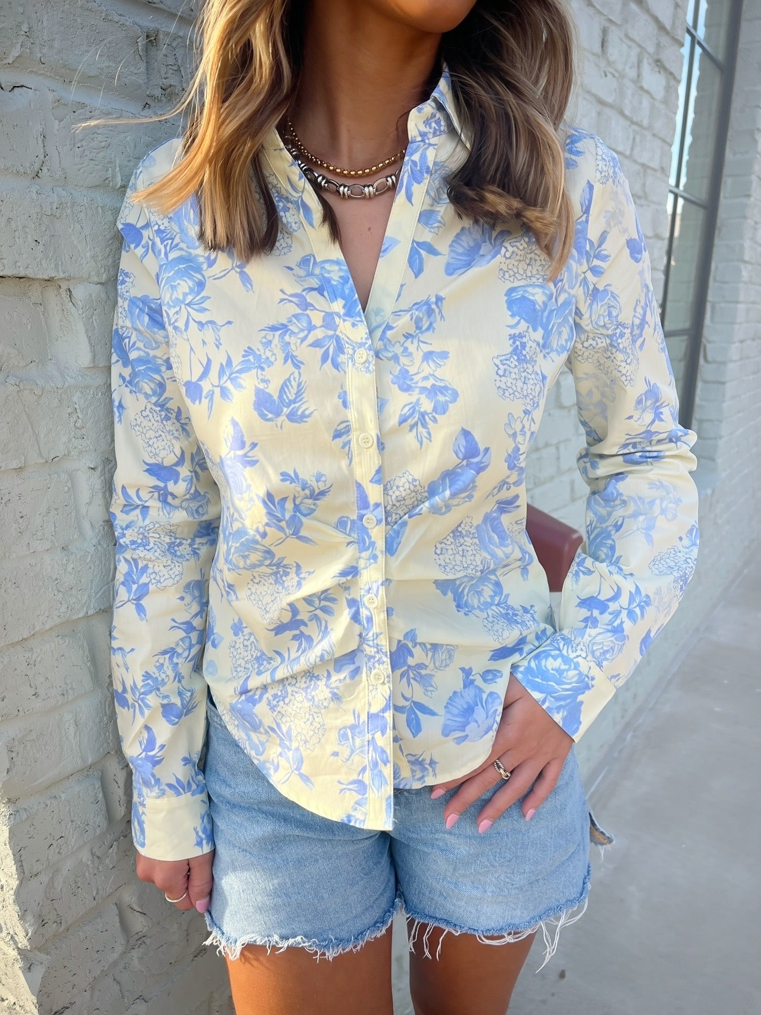 Fresh color with a classic feel. This soft cream button-down is covered in an intricate blue floral print that gives it a timeless, collected look. Designed with a structured collar, full button front, and a tailored yet relaxed fit, it feels polished without being stiff. The long sleeves and clean lines make it easy to dress up or down.