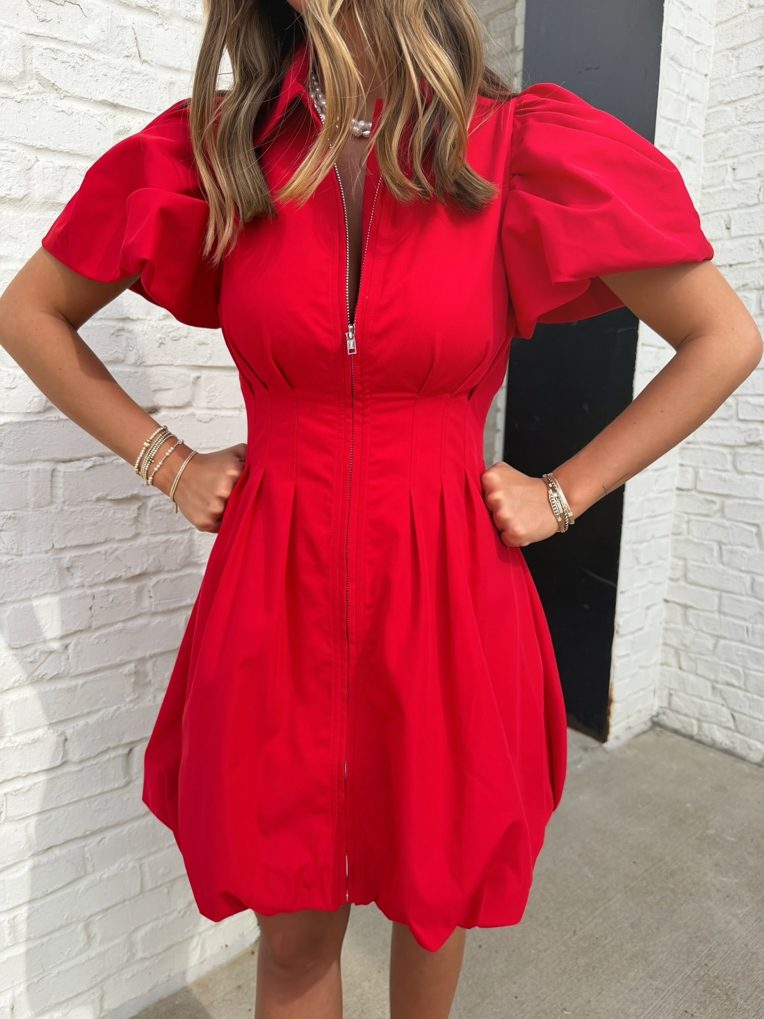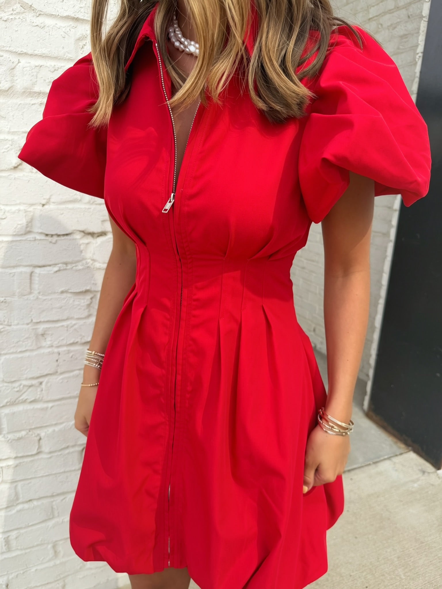 This vibrant red dress features a zip-front design with a crisp collar that adds a modern, tailored touch. The pleated waist creates beautiful shaping through the bodice, while the voluminous flutter sleeves bring soft drama and movement to the overall look. The skirt gently flares for a feminine finish, making this piece stand out while still feeling easy to wear for a variety of occasions.