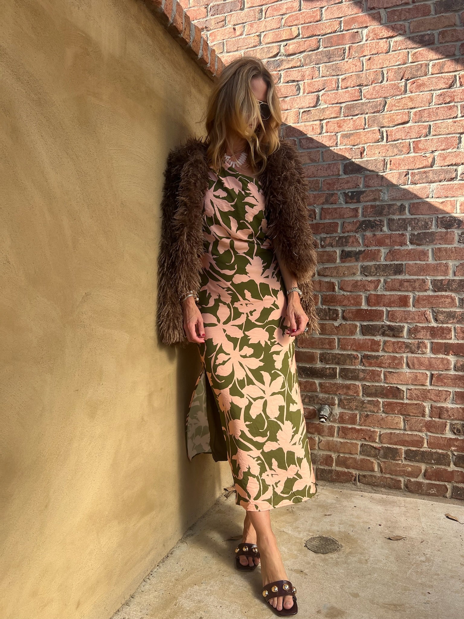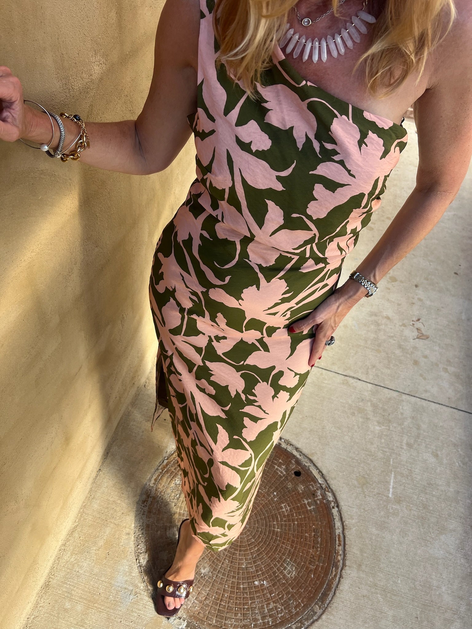 This My Dearest Midi dress features a delicate pink and olive green floral pattern that will make you stand out in any crowd. Its one shoulder design adds a touch of elegance and sophistication to your outfit. Embrace your inner fashionista with this stunning dress!