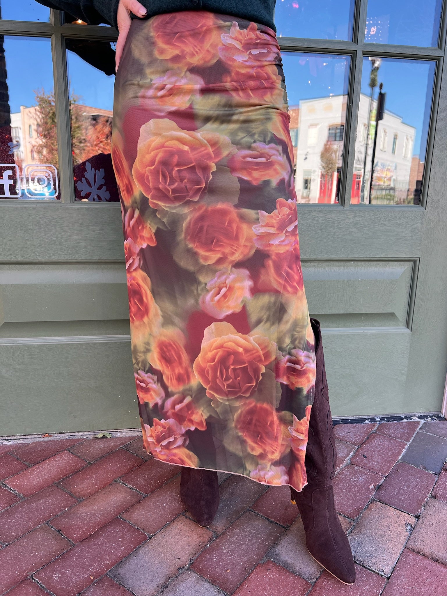 There’s something magical about the way this mesh midi moves — the roses seem to float with every step, like they were painted right onto the air around you. The colors melt together in warm fall tones, giving the whole skirt a soft, dreamy glow that feels special the second you slip it on.